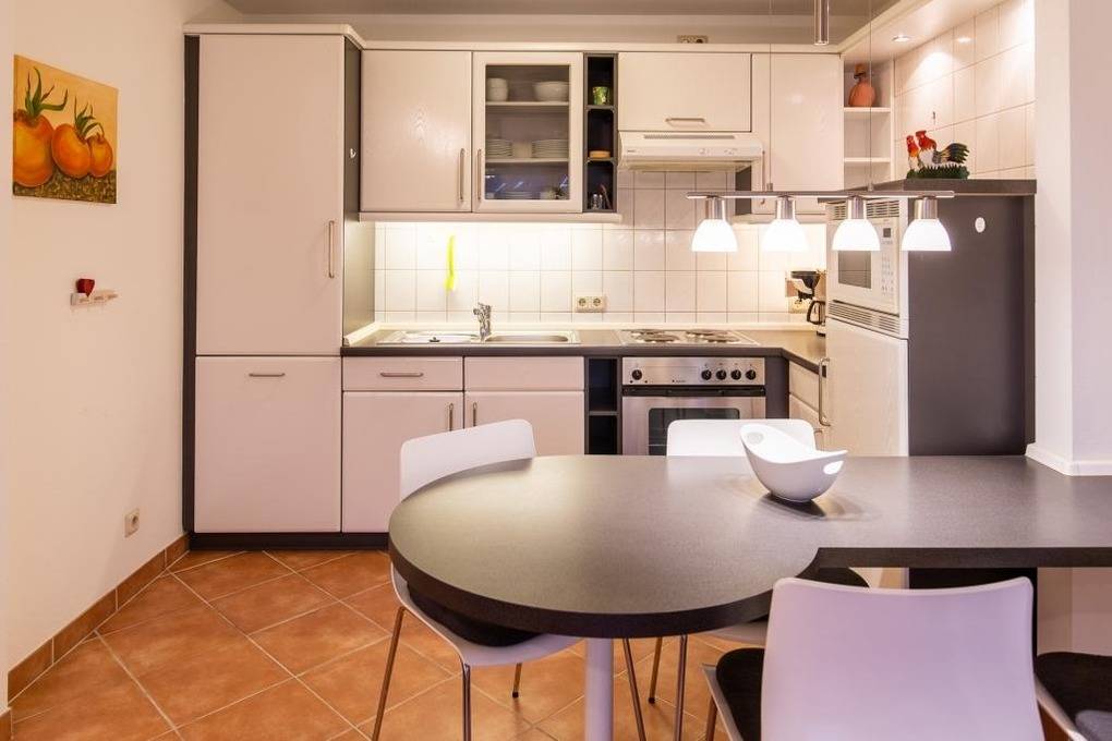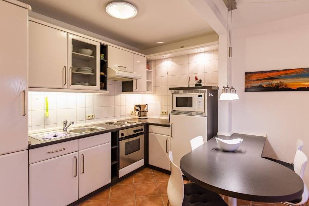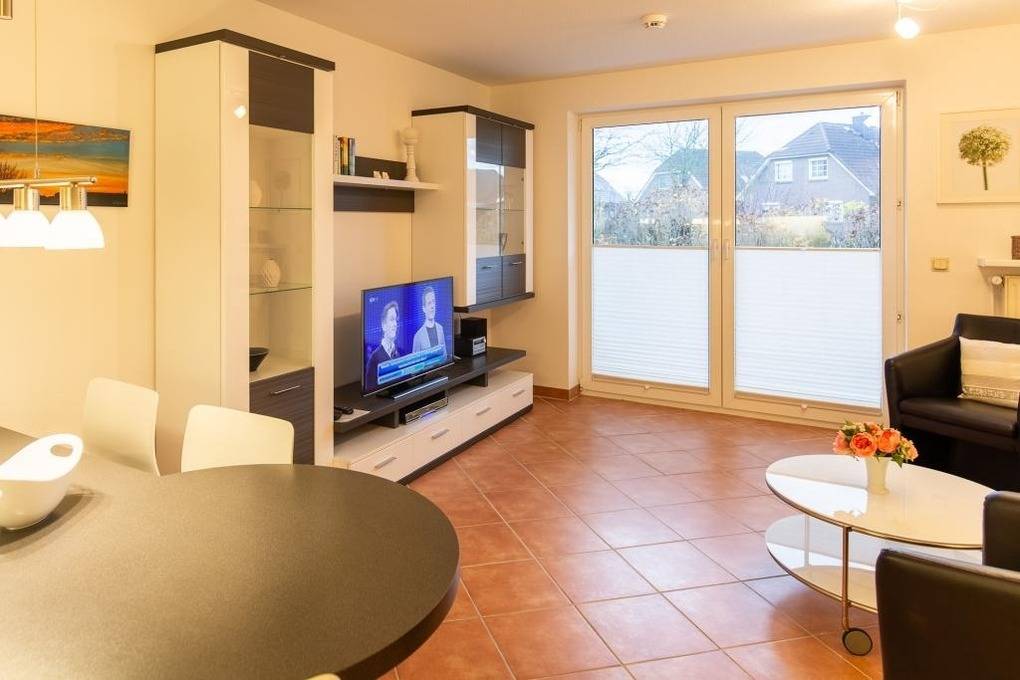 2-Raum-Parterrewohnung mit ca. 52m². Komplett ausgestattet bis 4 Pers. Wohnzimmer mit Küchenzeile vollausgestatter Küchenzeile (Geschirrspüler, Backofen etc.), Doppelbettcouch und Zugang zur Terrasse (west), Kabel-TV, W-Lan kostenfrei. 1 Schlafzimmer mit Doppelbett [&] TV, Du/WC, keine Haustiere, Nichtraucher, reservierter Pkw-Stellplatz #13 vor dem Haus.