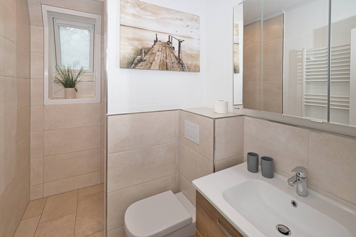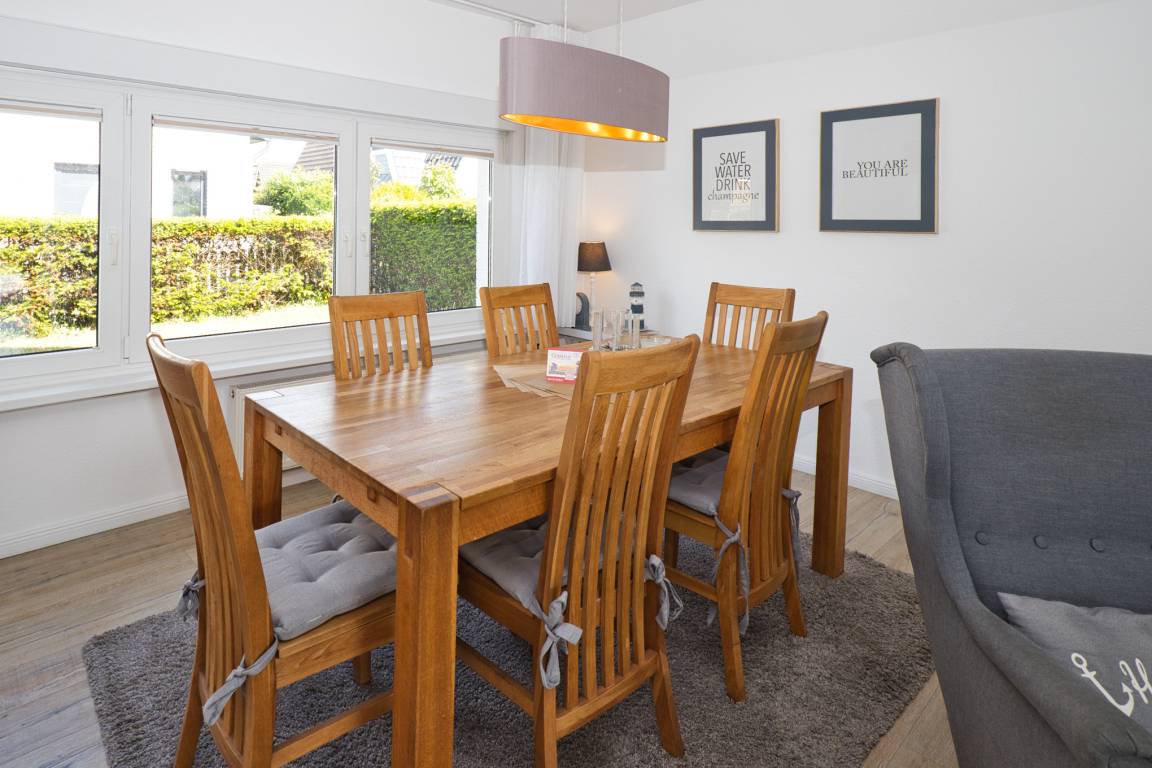 Ringwall 47, 4-Raum, ca. 74m², bis zu 6 Personen, Urlaub ganz individuell und Strandnah. Das moderne Ferienhaus direkt hinter dem Deich mit einer großzügiger Aufteilung, viel Komfort und eigenem Garten in ruhiger Lage. Sie werden im Eingangsbereich (verglaster Windfang) über den Flur mit Zugang zum Duschbad (Dusche/WC), zur separaten und interessant aufgeteilten Küche (mit Waschmaschine), im hellen und sehr gemütlichen Wohn- und Essbereich empfangen. Von hier geht es auch in den sehr schönen sonnigen Garten und über ein Holztreppe ins 1.OG (mit Treppenschutzgitter am oberen Ende). Hier erwarten Sie 3 gut ausgestattete Schlafzimmer (eins mit einem zusätzlichen TV) mit passgenauen Einbaumöbeln und Schlafgelegenheiten für bis zu 6 Personen. In einem Schlafbereich befindet sich sogar eine Waschmöglichkeit. 1 weiteres Gäste-WC befindet sich ebenfalls auf der Etage. Familien sind Herzlich willkommen.