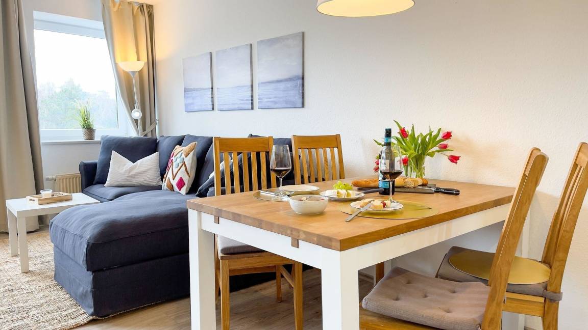 Die Ferienwohnung in Sahlenburg beeindruckt durch ihre helle und freundliche Gestaltung im nordischen Stil. Sie bietet Platz für bis zu vier Personen und verfügt über einen großzügigen Wohnraum mit offener, voll ausgestatteter Küche sowie einem gemütlichen Essbereich. Ein komfortables Schlafsofa ergänzt den Wohnbereich. Das Schlafzimmer ist mit einem bequemen Doppelbett ausgestattet und sorgt für erholsame Nächte. Die Wohnung bietet zudem eine Waschmaschinen-/Trocknerkombination für den persönlichen Wäschebedarf. Fahrräder können im gemeinschaftlich genutzten Fahrradkeller abgestellt werden. Die Lage in unmittelbarer Nähe zur Sahlenburger Strandpromenade und verschiedenen Freizeitmöglichkeiten macht die Unterkunft besonders attraktiv für aktive Urlauber und Familien. Haustiere sind auf Anfrage willkommen, sodass auch vierbeinige Freunde mitreisen können.