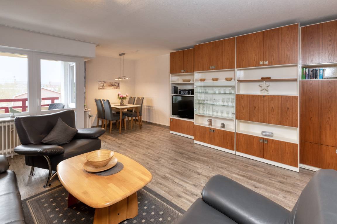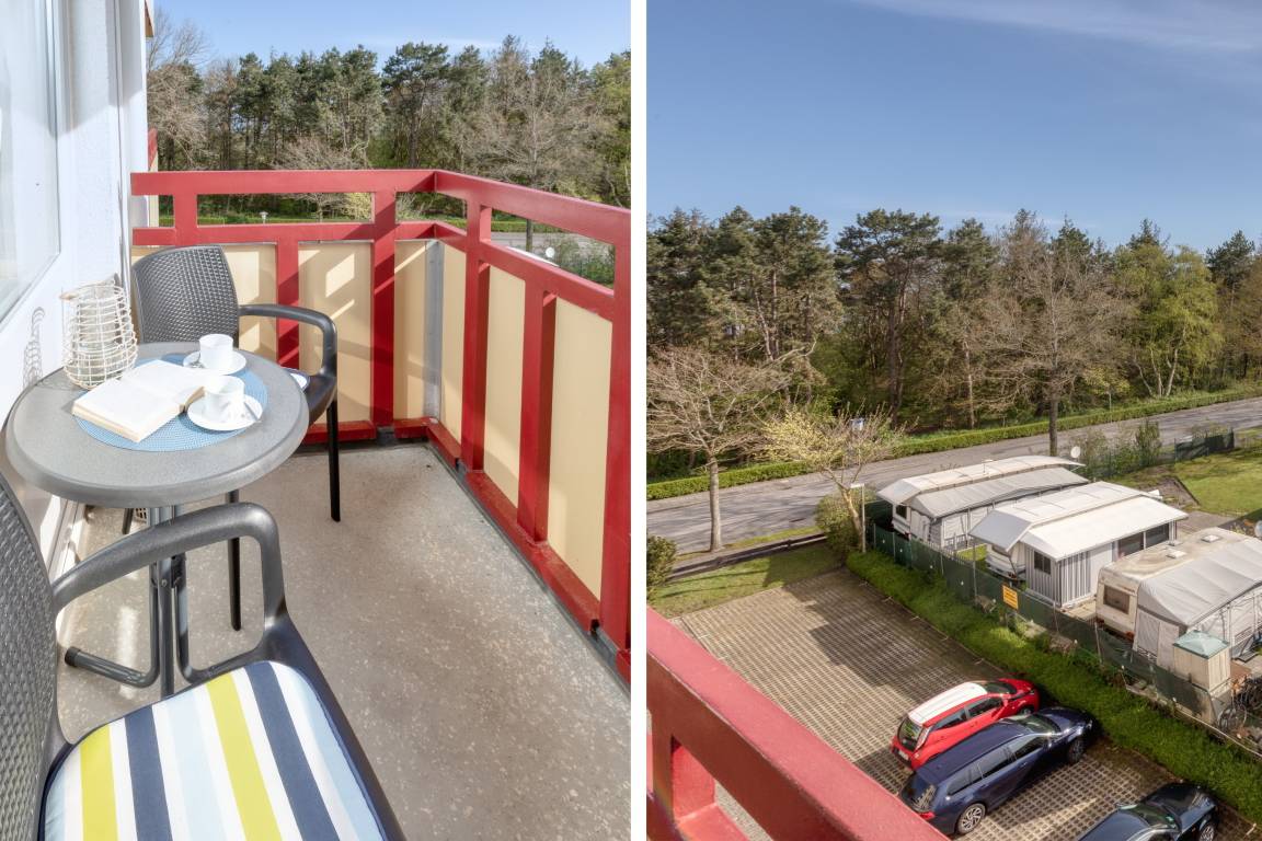 Das Appartement 55 ist ein 2-Raum-Appartement im 4. Obergeschoss für bis zu 4 Personen mit 45 qm. Der möblierte Ostbalkon bietet morgens Sonne und nachmittags Schatten.