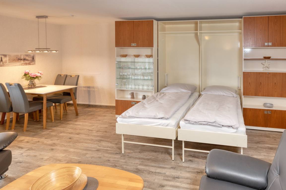 Das Appartement besteht aus einem Schlafzimmer mit zwei Einzelbetten, einem Wohnbereich mit ausklappbaren Schrankbetten, eine separate voll ausgestattete integrierte Küche, einem Badezimmer mit Dusche sowie WC.