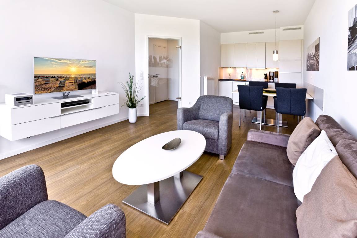 Traumhafte 2-Raum-Wohnung mit voller Seesicht in der 2.Etage mit großem Balkon (nord/west). Die vollständige Küchenzeile mit Mikro, Back., Geschirrsp. etc. garantiert höchsten Komfort. 3D-SAT-TV, Blue-Ray-DVD, Kompaktanlage, kostenloses W-Lan-Internet, separates Schlafzimmer mit Außenjalousien und hochwertigem Doppelbett, allergikerfreundlich, ebenerdige Dusche/WC, Föhn, freie Saunanutzung, reservierter Tiefgaragenstellplatz, keine Haustiere und natürlich Nichtraucher.