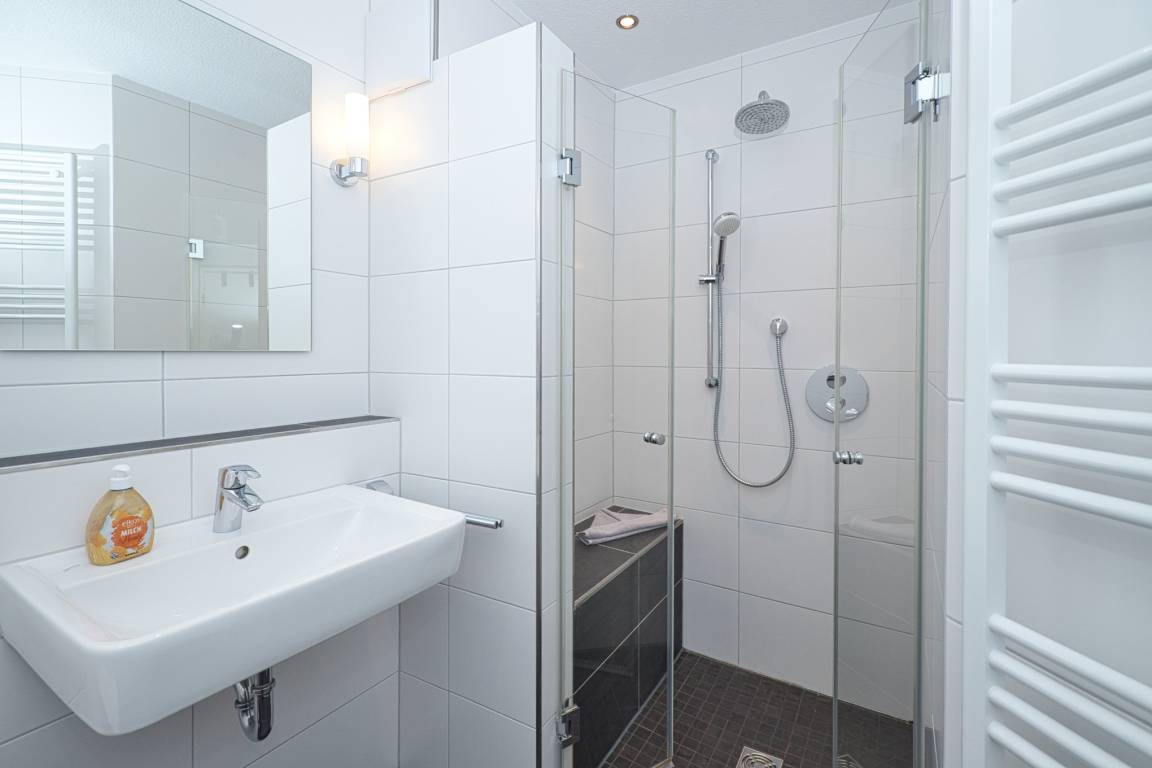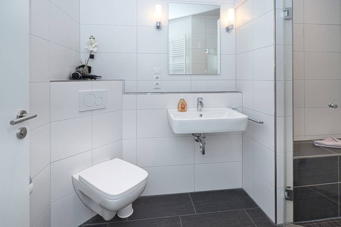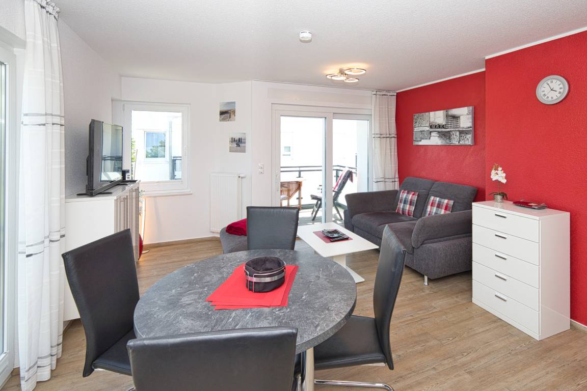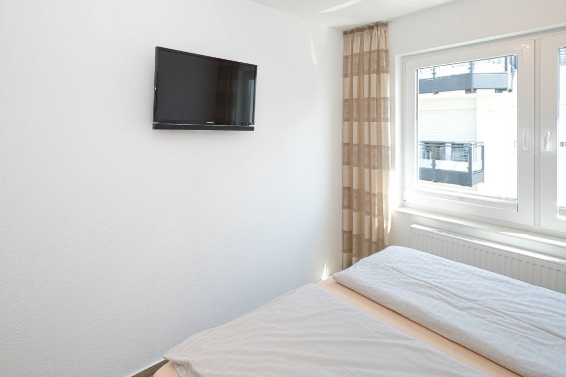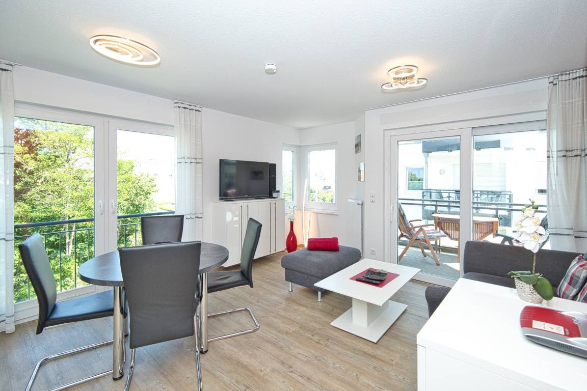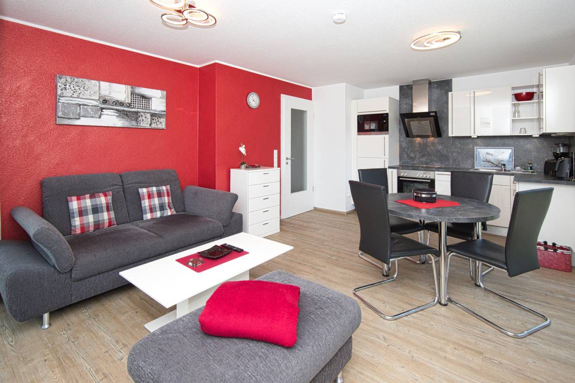 Das 2-Zimmer Appartement bietet auf 45m² ein komfortables und ansprechendes Ambiente. Es befindet sich in der zweiten Etage und besticht durch eine gehobene Ausstattung. Das gemütliche Wohnzimmer verfügt über einen offenen Küchenbereich, der mit einem Geschirrspüler, Backofen, Ceran-Kochfeld, Mikrowelle, Kaffeemaschine und allen notwendigen Küchenutensilien ausgestattet ist. Hier finden Sie auch eine Essecke, eine Schlafcouch (für eine Person) und einen Flachbildschirm.