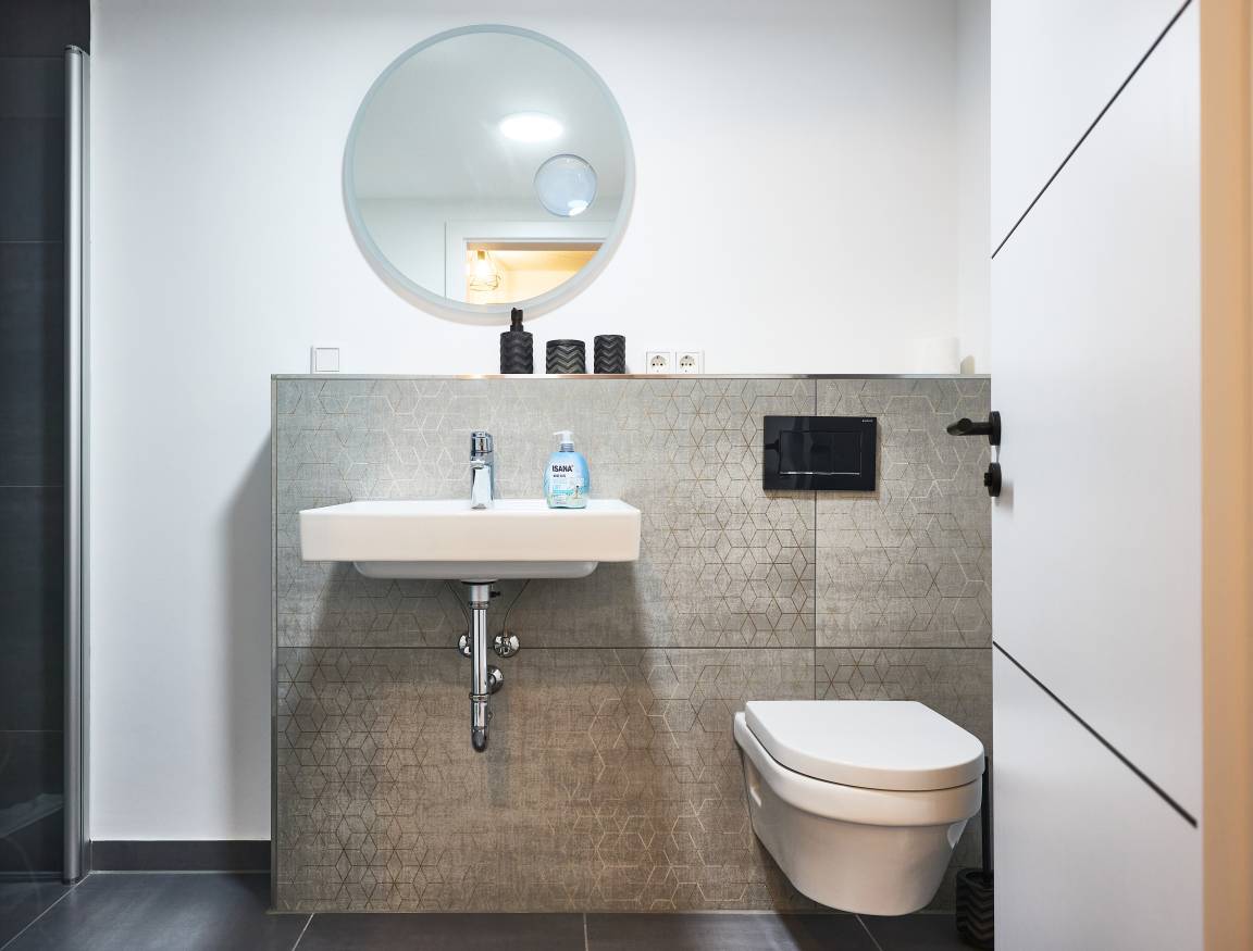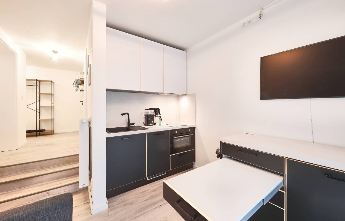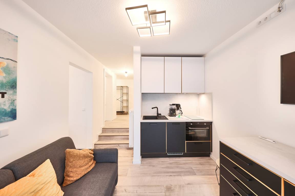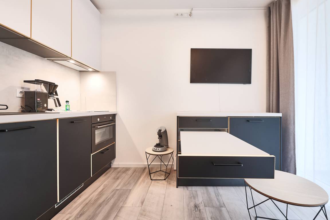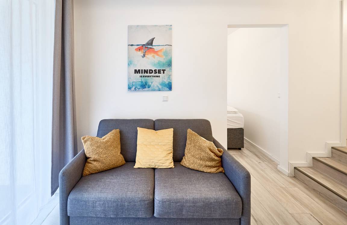 Das Studioappartement überzeugt durch ein modernes Design und eine durchdachte Raumaufteilung. Der separate Schlafbereich sorgt für erholsame Nächte. Im einladenden Küchen-, Wohn- und Essbereich können Sie nach einem Tag am Strand entspannen. Der Essbereich ist ausziehbar und lässt sich je nach Bedarf optimal anpassen. Direkt an den Wohnbereich grenzt die Terrasse, die zum Bürgersteig zeigt und von dort haben Sie Zugang zum PKW-Stellplatz.
