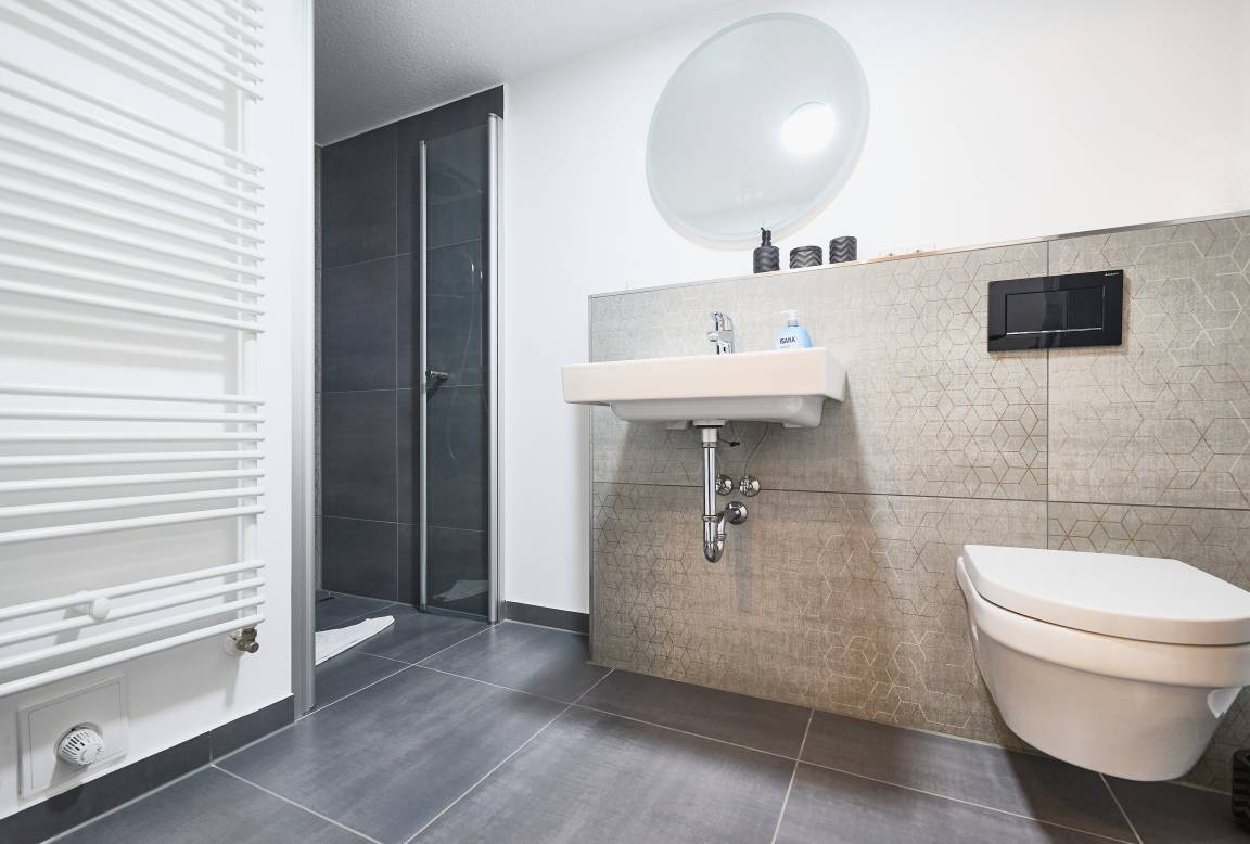Bad: Modernes Duschbad mit Handtuchheizkörper
