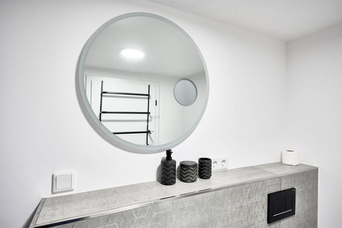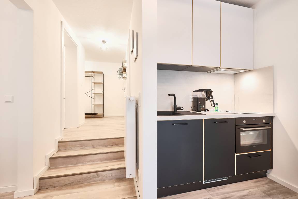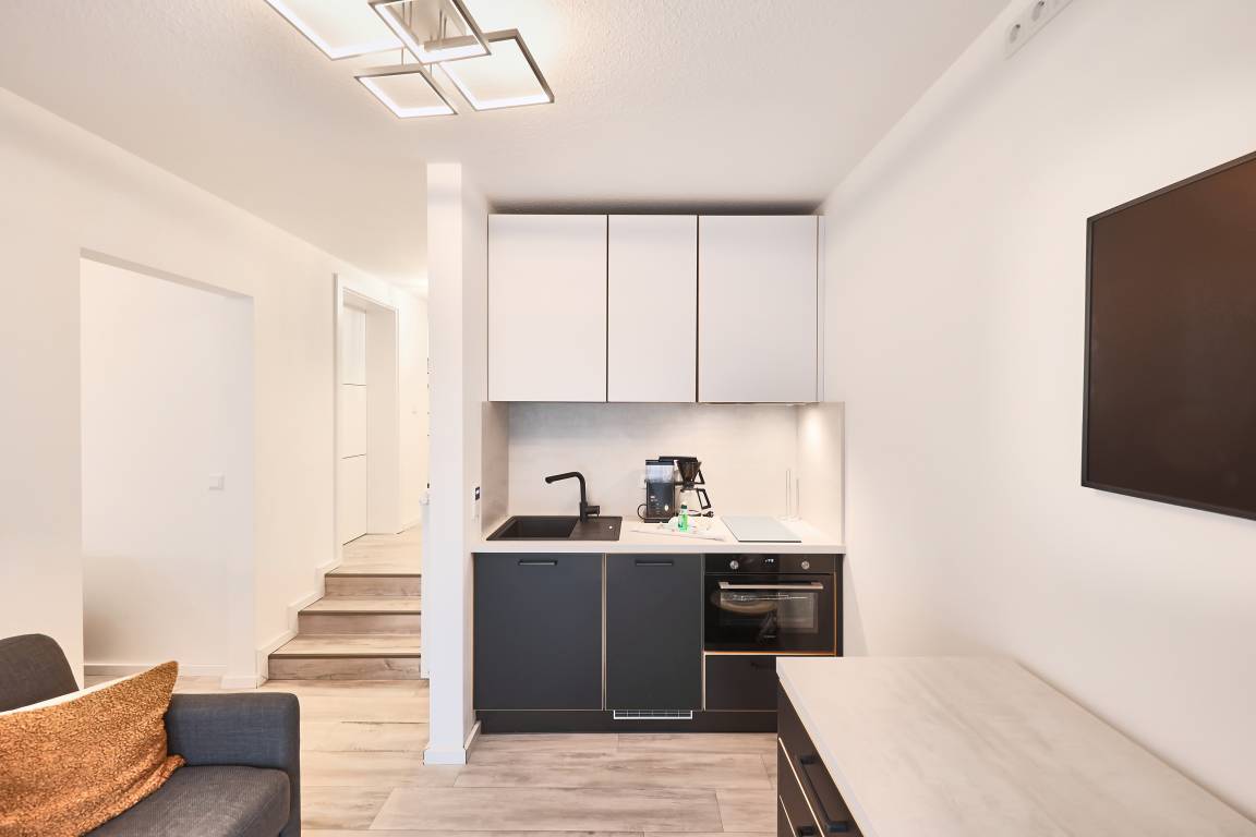 Küche: Induktionskochfeld, Mikrowelle, Kühlschrank, Spülmaschine, Geschirr