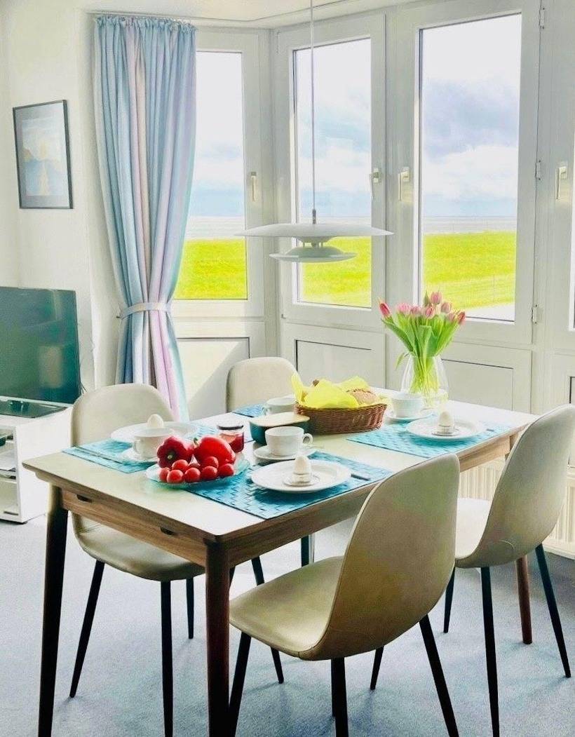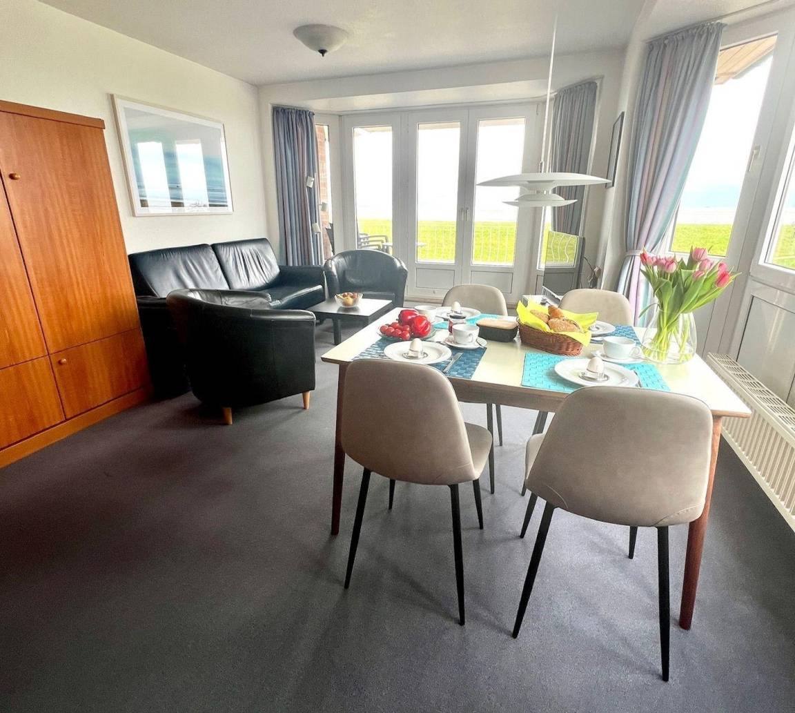 Die Nordseeperle 8 bietet für bis zu 4 Personen einen traumhaften Meerblick, nur 2 Gehminuten vom Strand entfernt, mit Balkon, Sauna und moderner Küche für entspannte Urlaubstage.
