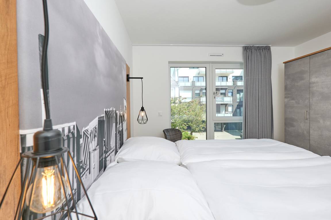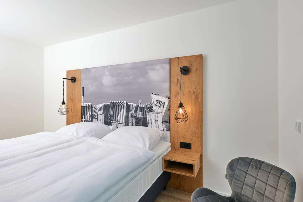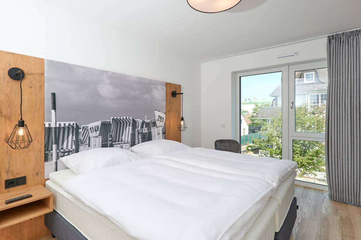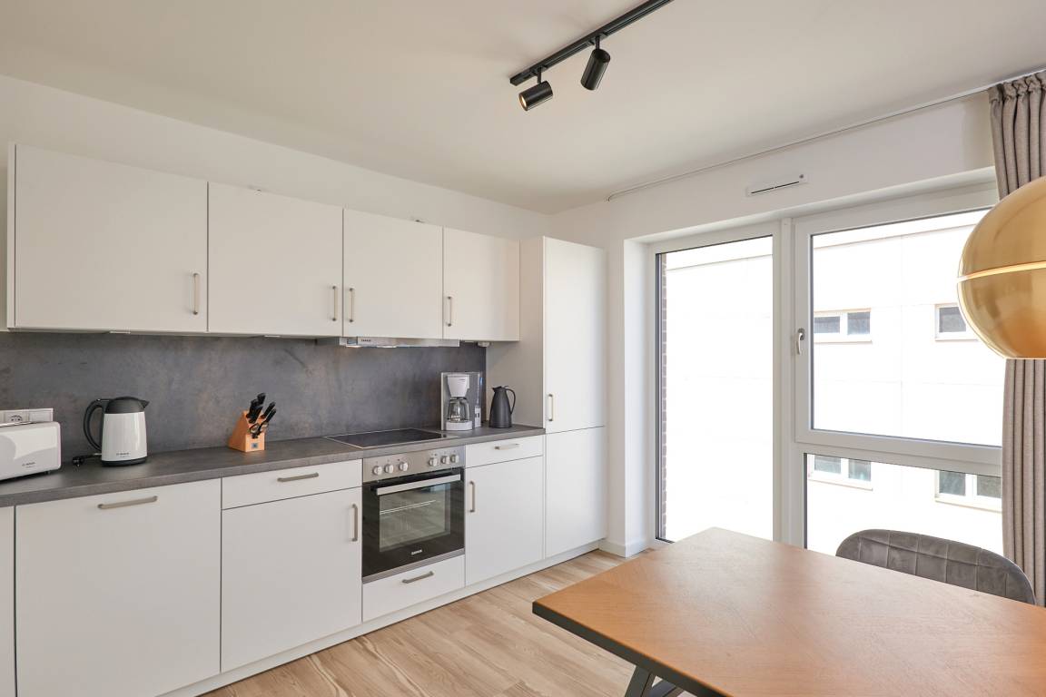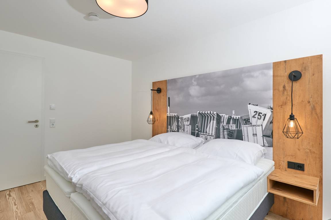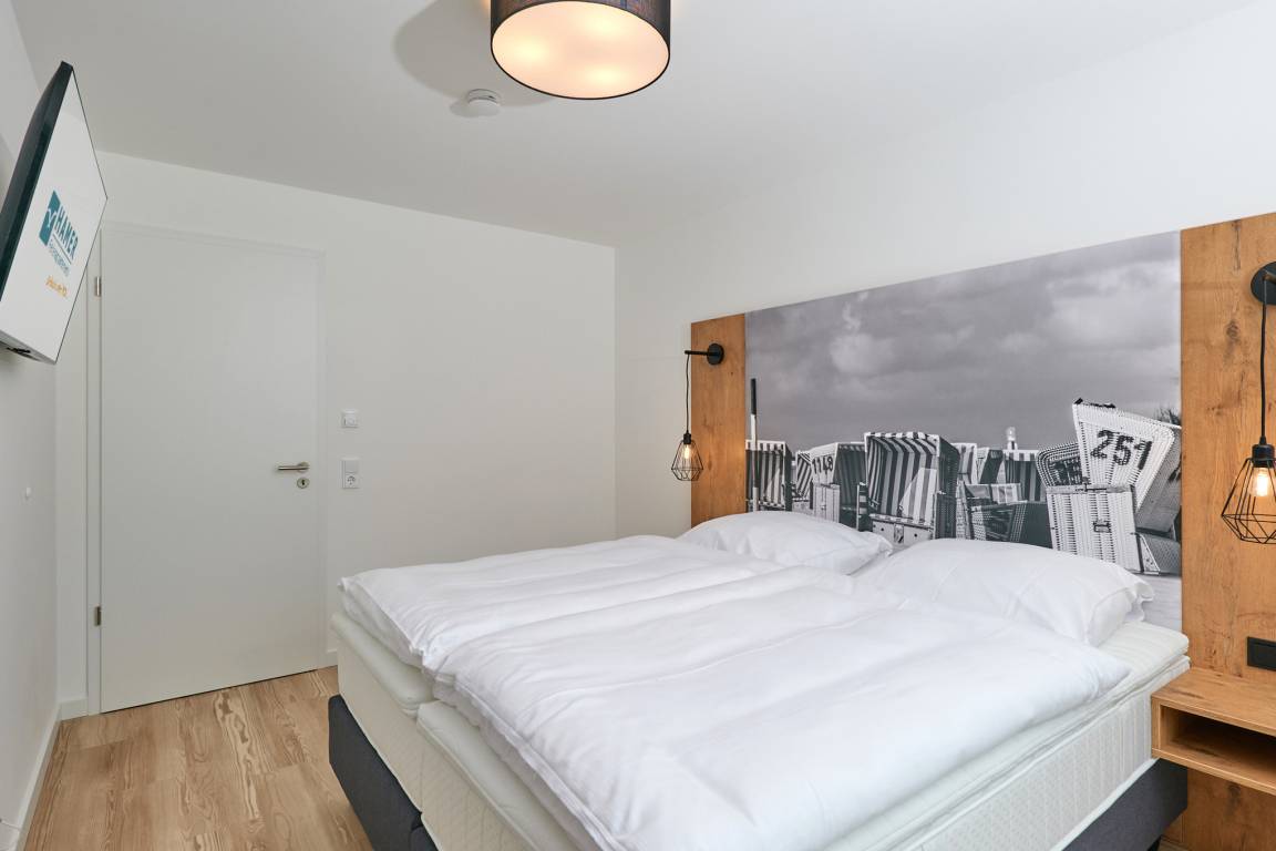 Neubau Mai 2023! Sehr schöne, moderne 3-Raum-Wohnung bis 4 Pers. voll ausgestattet auf ca. 91 m² in der 2.Etage gelegen, 2 Schlafzimmer mit komfortablen Doppelbetten (Bettwäsche inkl.) und Außenjalousien an allen Fenstern, ebenerdige Dusche/WC, Wohnzimmer mit großer Küchenzeile (Backofen, Geschirrspüler, Mikrowelle), 3x Kabel-TV, Radio, kostenfreies W-LAN-Internet, kleiner Balkon (nord) mit Teilseesicht, Personenaufzug, reservierter Pkw-Stellplatz in der Tiefgarage inkl., es sind keine Haustiere erlaubt und natürlich Nichtraucher. Durchfahrtshöhe Tiefgarage: 2,05m.