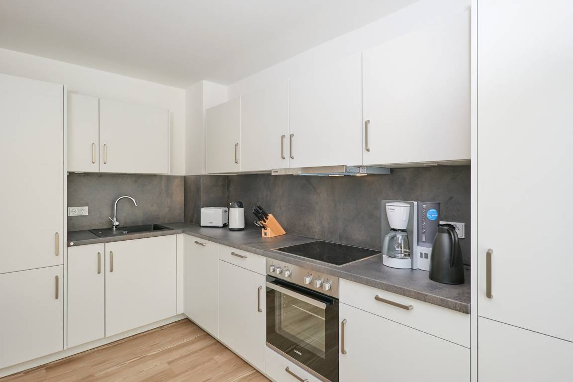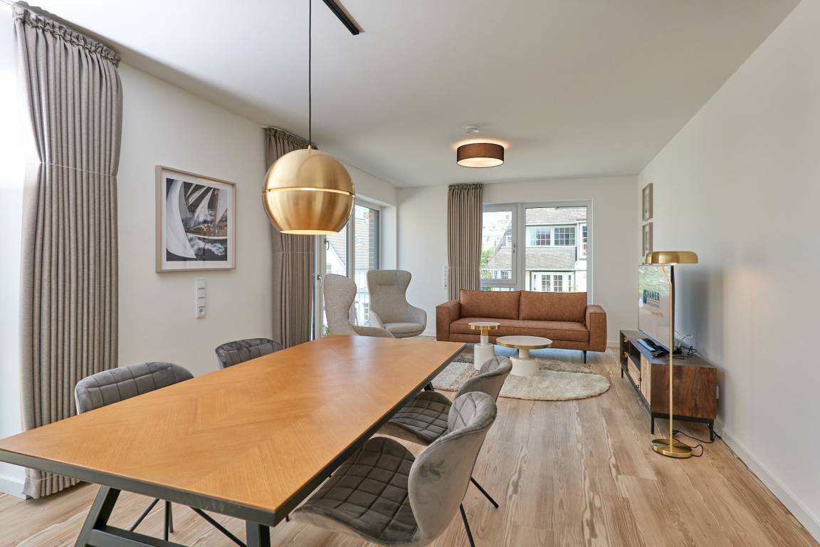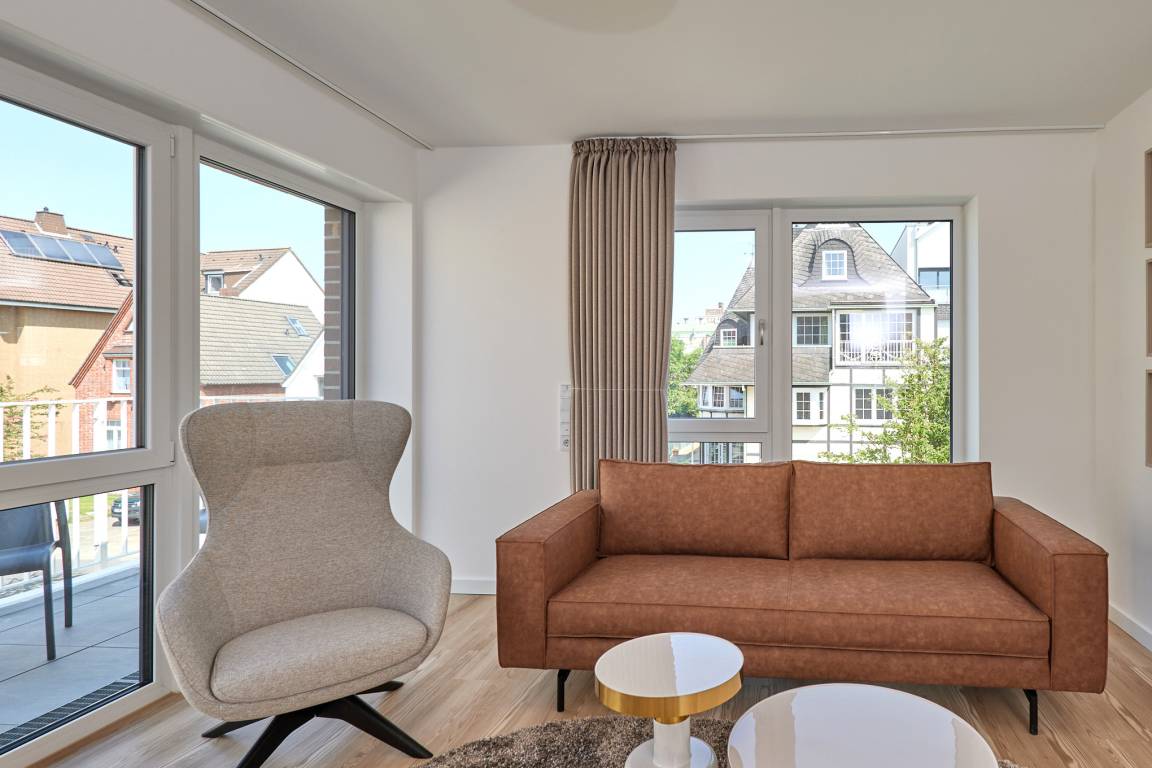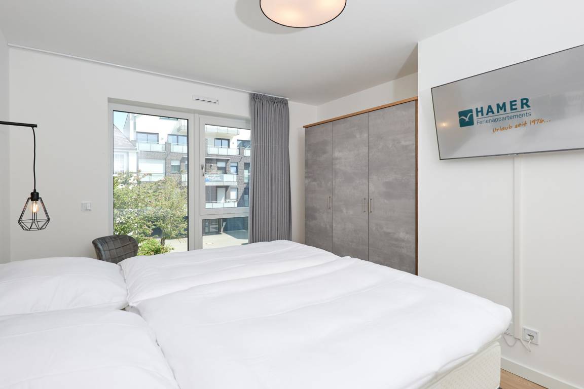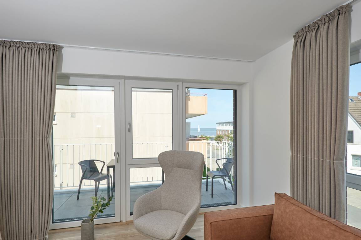 Neubau Mai 2023! Sehr schöne, moderne 3-Raum-Wohnung bis 4 Pers. voll ausgestattet auf ca. 91 m² in der 2.Etage gelegen, 2 Schlafzimmer mit komfortablen Doppelbetten (Bettwäsche inkl.) und Außenjalousien an allen Fenstern, ebenerdige Dusche/WC, Wohnzimmer mit großer Küchenzeile (Backofen, Geschirrspüler, Mikrowelle), 3x Kabel-TV, Radio, kostenfreies W-LAN-Internet, kleiner Balkon (nord) mit Teilseesicht, Personenaufzug, reservierter Pkw-Stellplatz in der Tiefgarage inkl., es sind keine Haustiere erlaubt und natürlich Nichtraucher. Durchfahrtshöhe Tiefgarage: 2,05m.