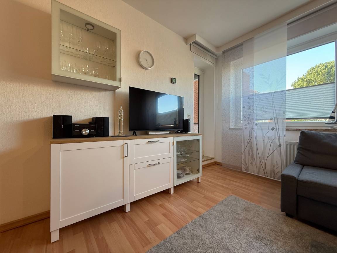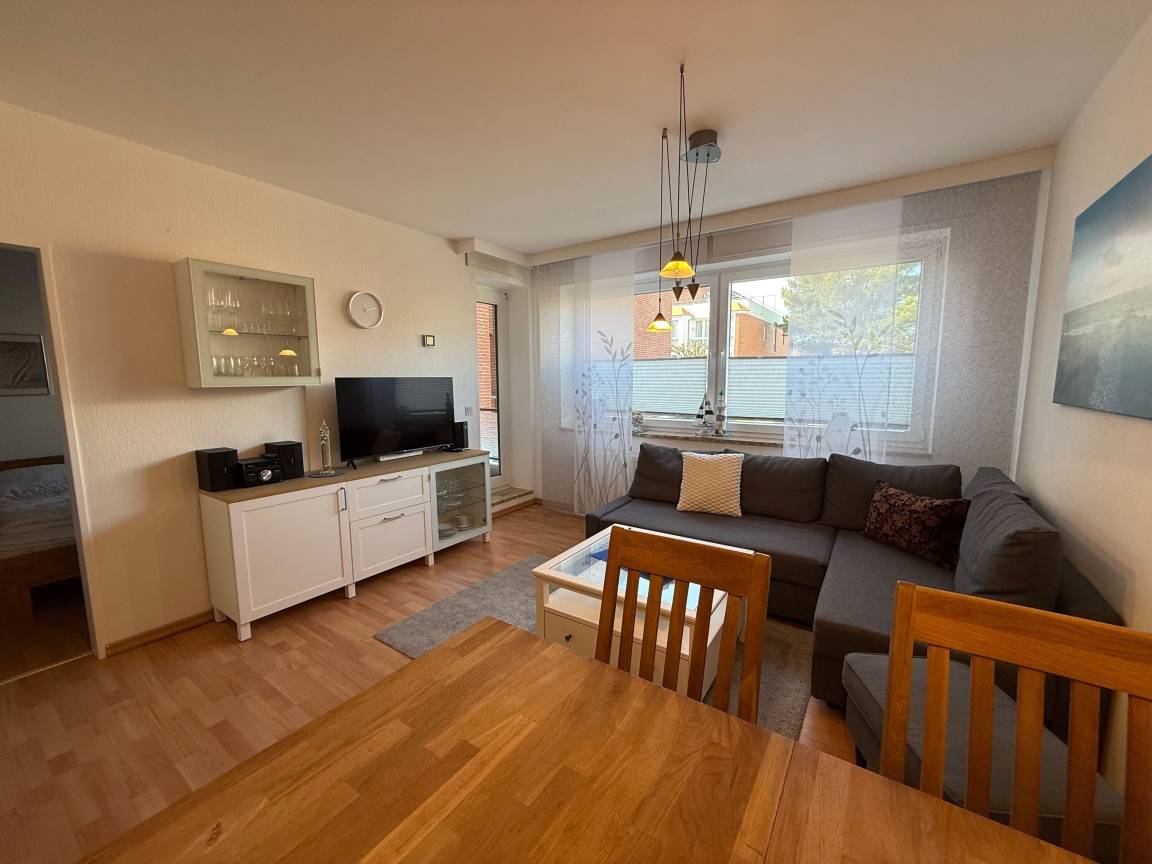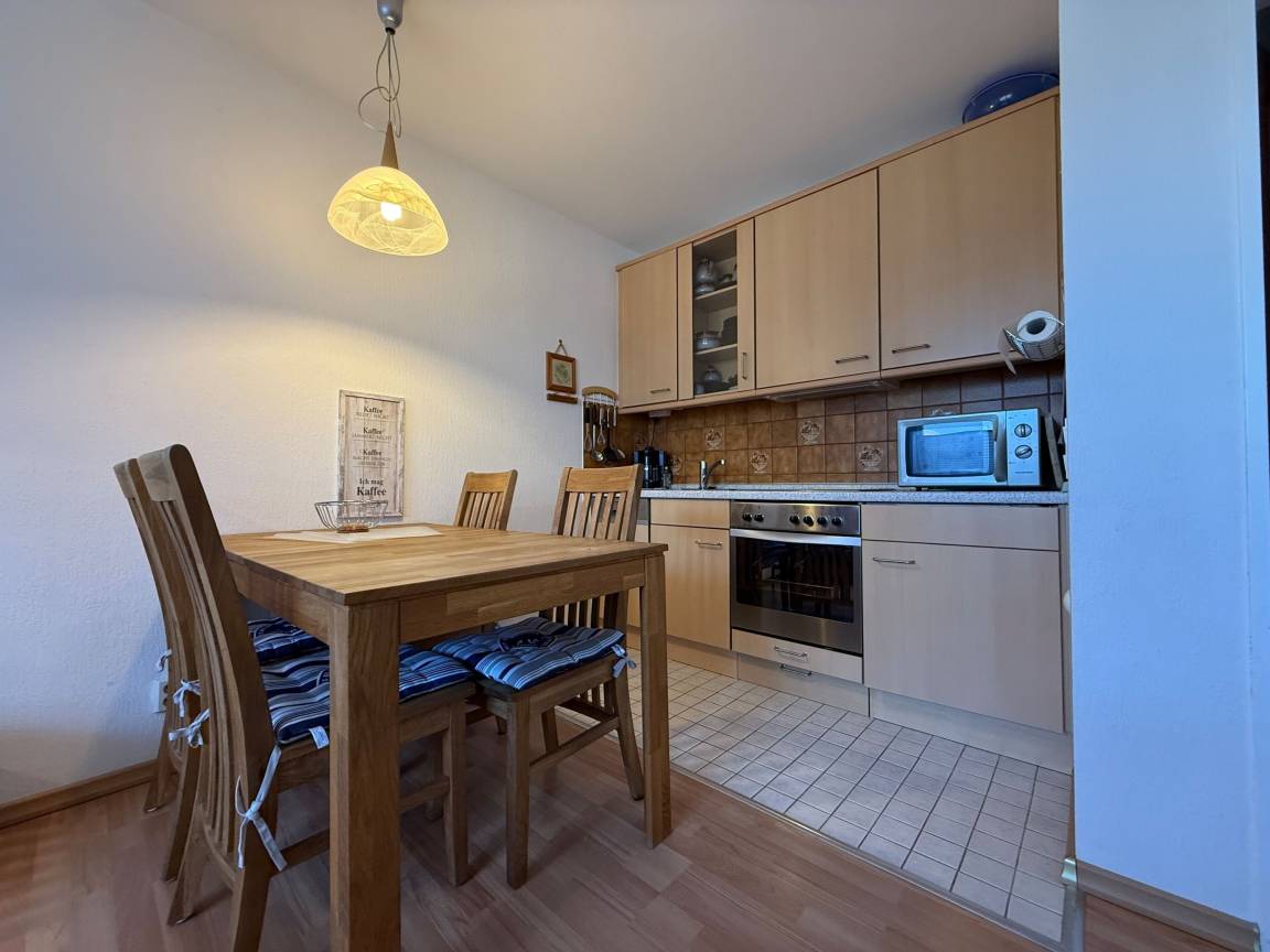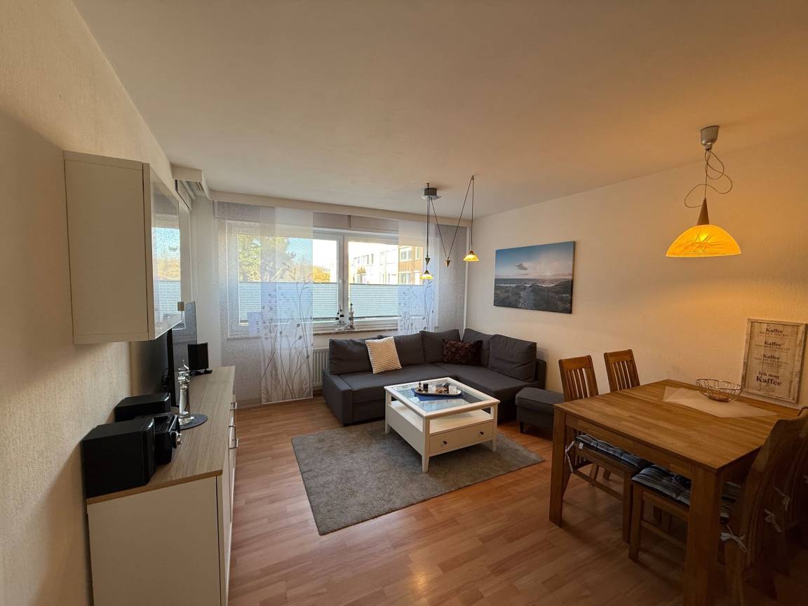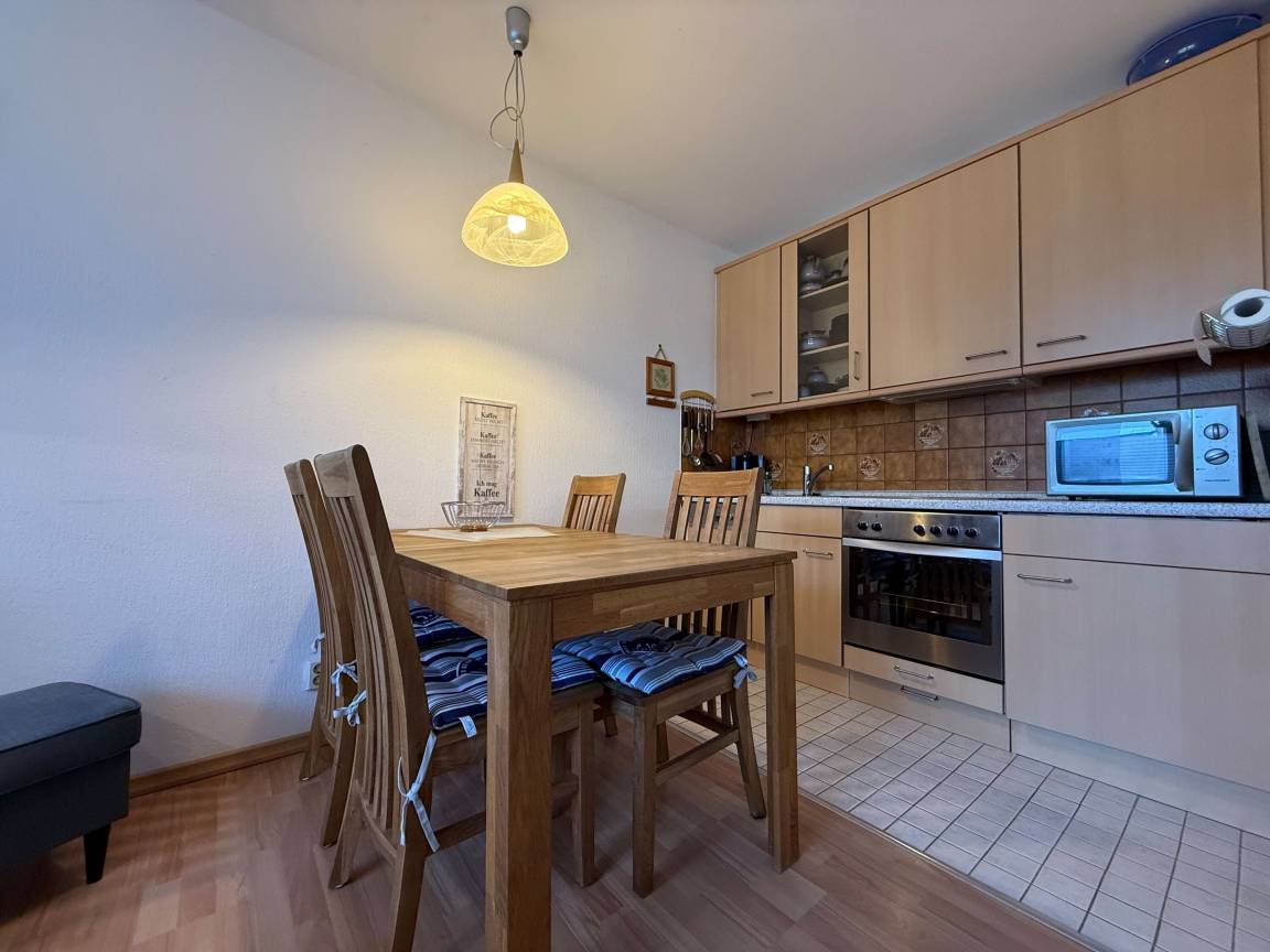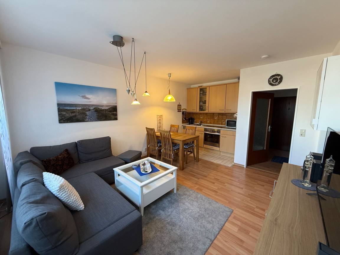 Mit einer Größe von ca. 50 m² Wohnfläche ist die Wohnung komplett bis zu 4 Personen ausgestattet, Wohnzimmer mit kompletter Einbauküche (Backofen, Cerankochfeld, Geschirrspüler, Toaster, Wasserkocher, Kühlschrank), Essplatz für 4 Personen, Sofa-Ecke und direktem Zugang zum Balkon, 1 Schlafzimmer mit Doppelbett, 2. Schlafzimmer, innenliegend, Einzelbett welches ausgezogen werden kann, Bad mit Dusche und WC, 1 Flatscreen TV im Wohnzimmer, Nichtraucherwohnung, keine Haustiere, PKW-Stellplatz direkt am Haus.