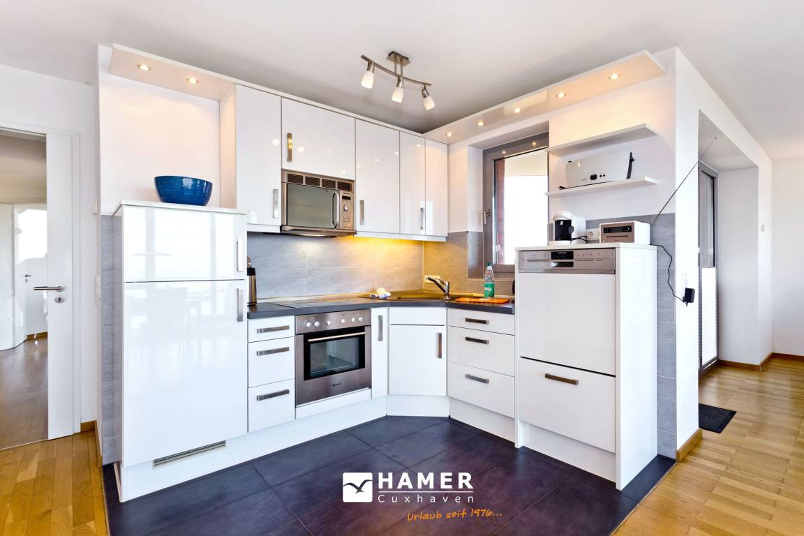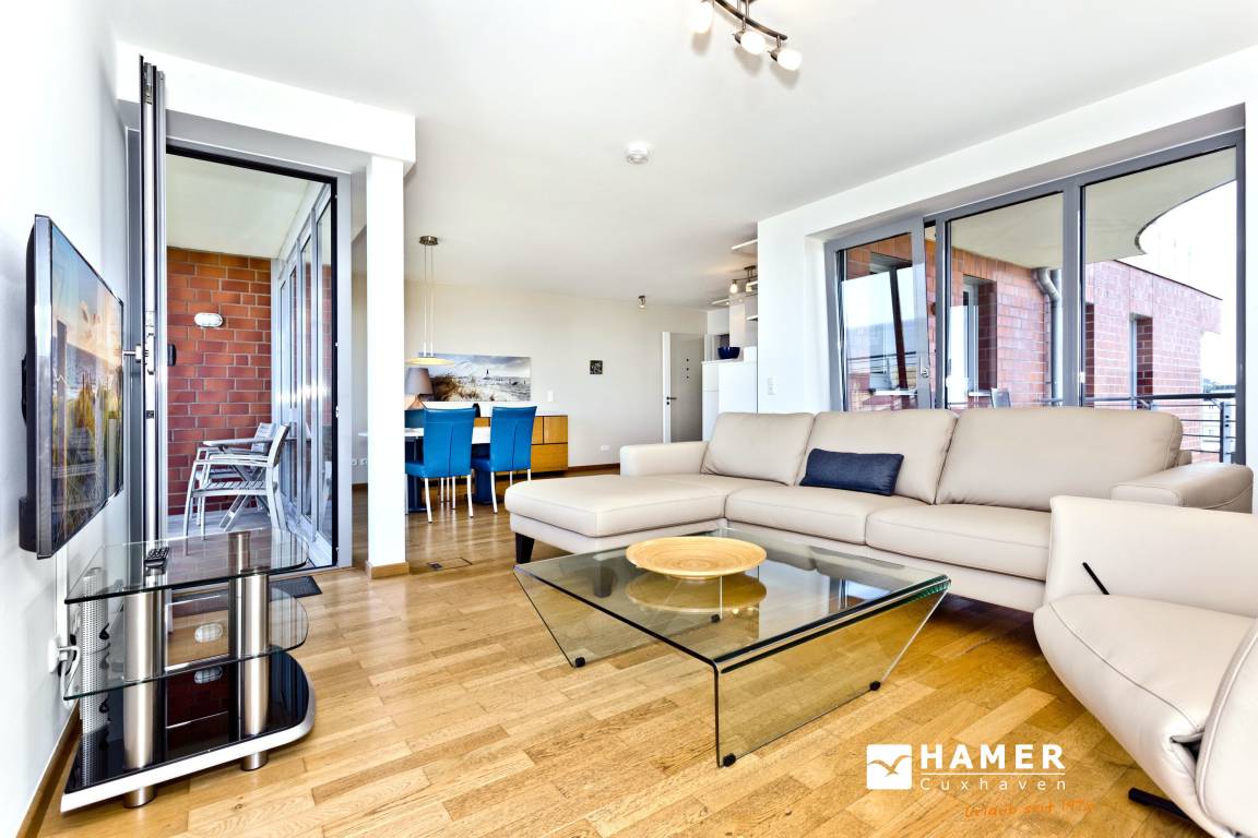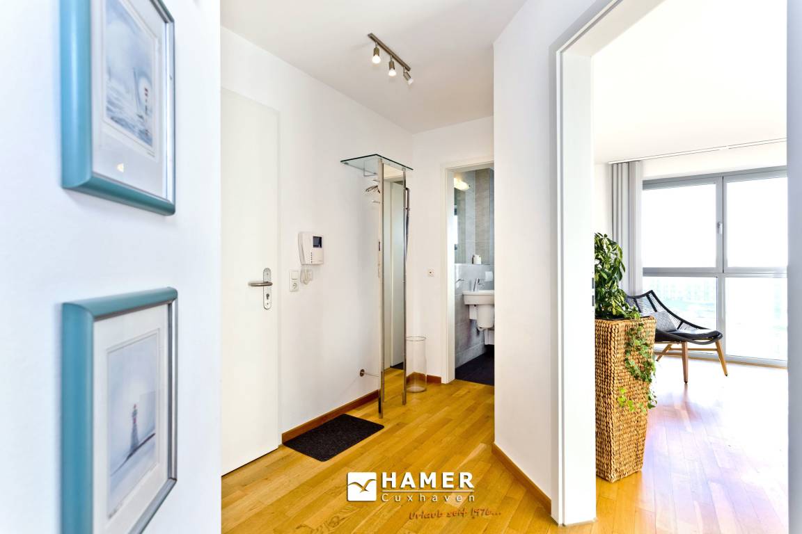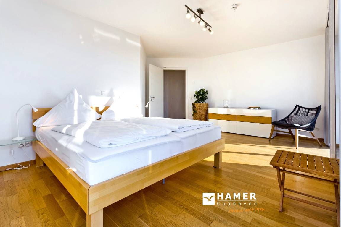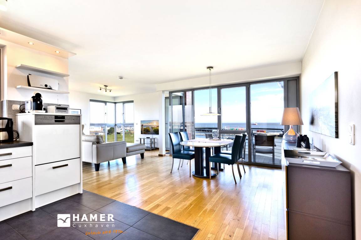 Traumwohnung! Aus allen drei Räumen dieser 105m² Wohnung in der 4.Etage haben Sie die Traumseesicht auf den Weltschifffahrtsweg. 1 Schlafzimmer mit Doppelbett, 1 Schlafzimmer mit Einzelbetten, Du/Wc, Föhn, Gäste-WC, begehbarer Kleiderschrank, großes Wohnzimmer mit komplett ausgestatteter Küchenzeile, 2 Balkone (nord+süd). Alle Räume sind hochwertig mit Parkett gestaltet und verfügen über Rollladen. Zur Wohnung gehört ein reservierter Stellplatz in der Tiefgarage (schmal, zur Wand). Nichtraucher, keine Haustiere erlaubt.