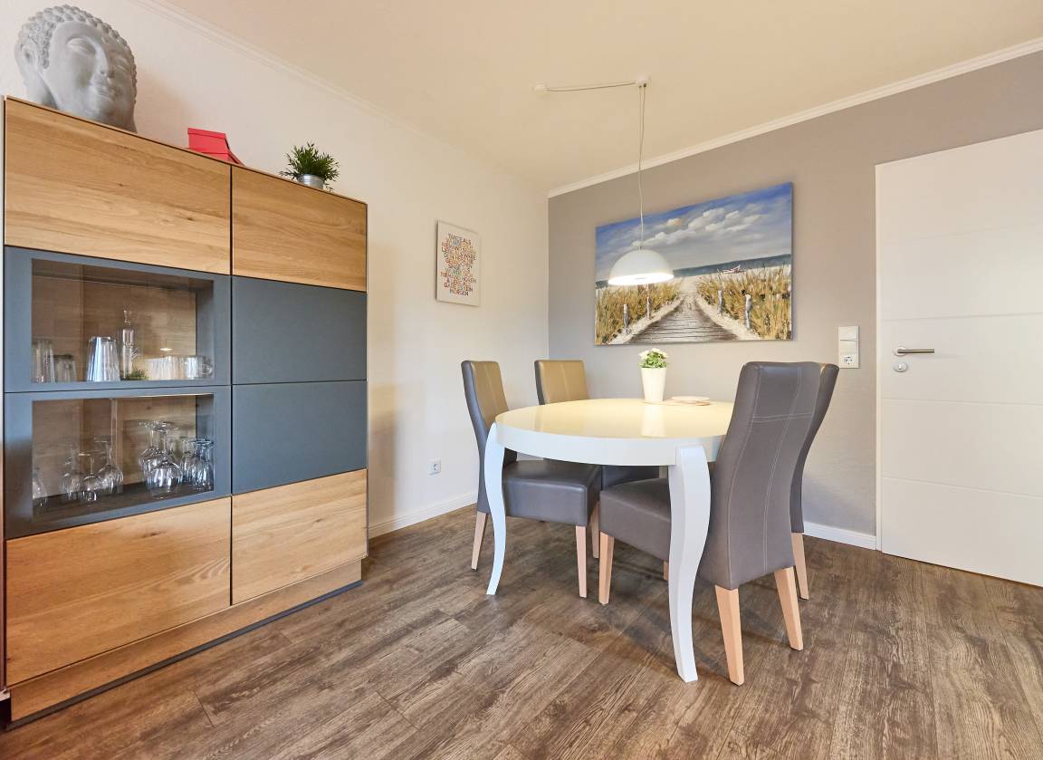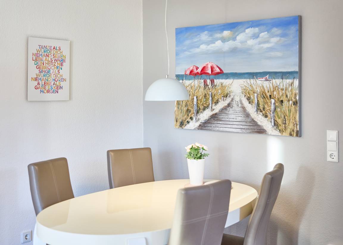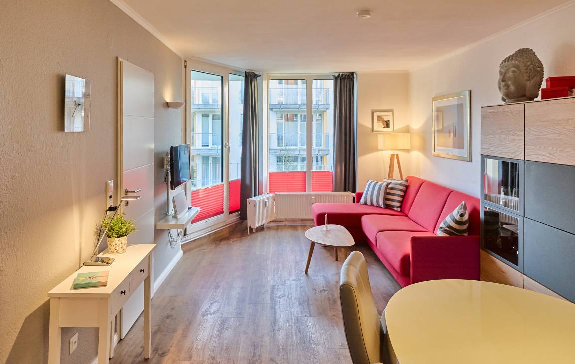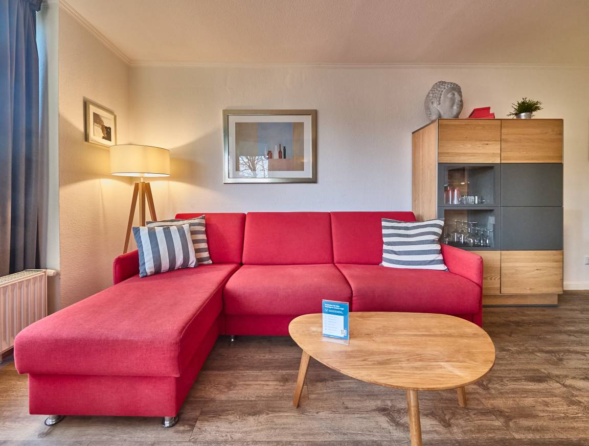 Heller Wohn- und Essbereich mit gemütlicher Schlafcouch für die dritte Person, SAT-TV und Zugang zum sonnigen Balkon in Ostlage – ideal fürs Frühstück in der Morgensonne oder entspannte Abende mit frischer Nordseeluft