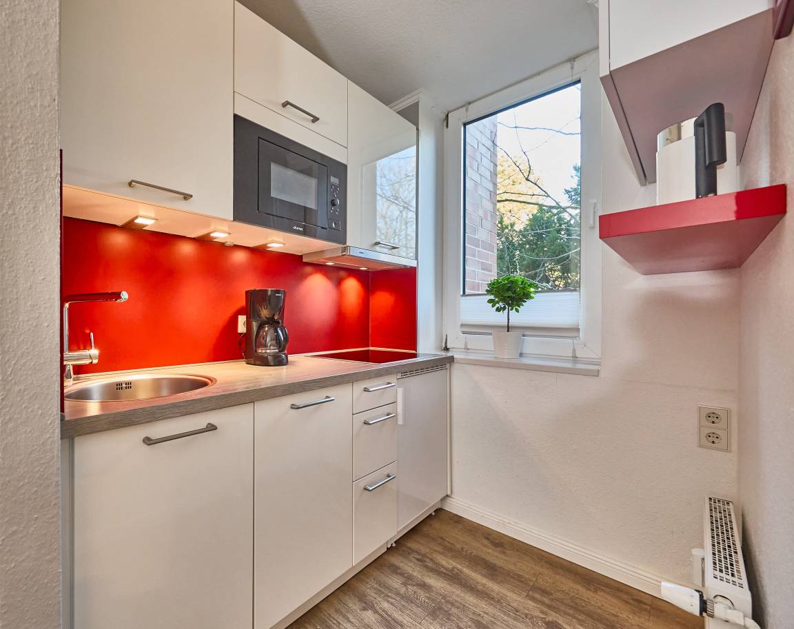 Integrierte Küchenzeile mit allem, was Sie brauchen: Geschirrspüler, Mikrowelle, Ceranfeld und ausreichend Stauraum