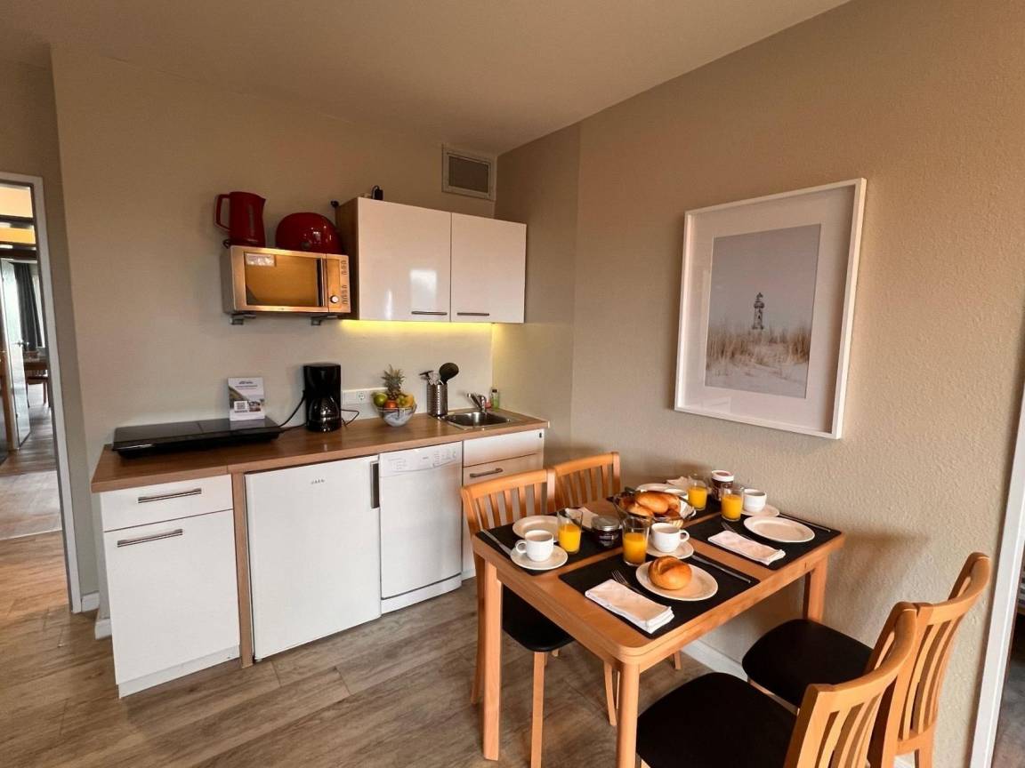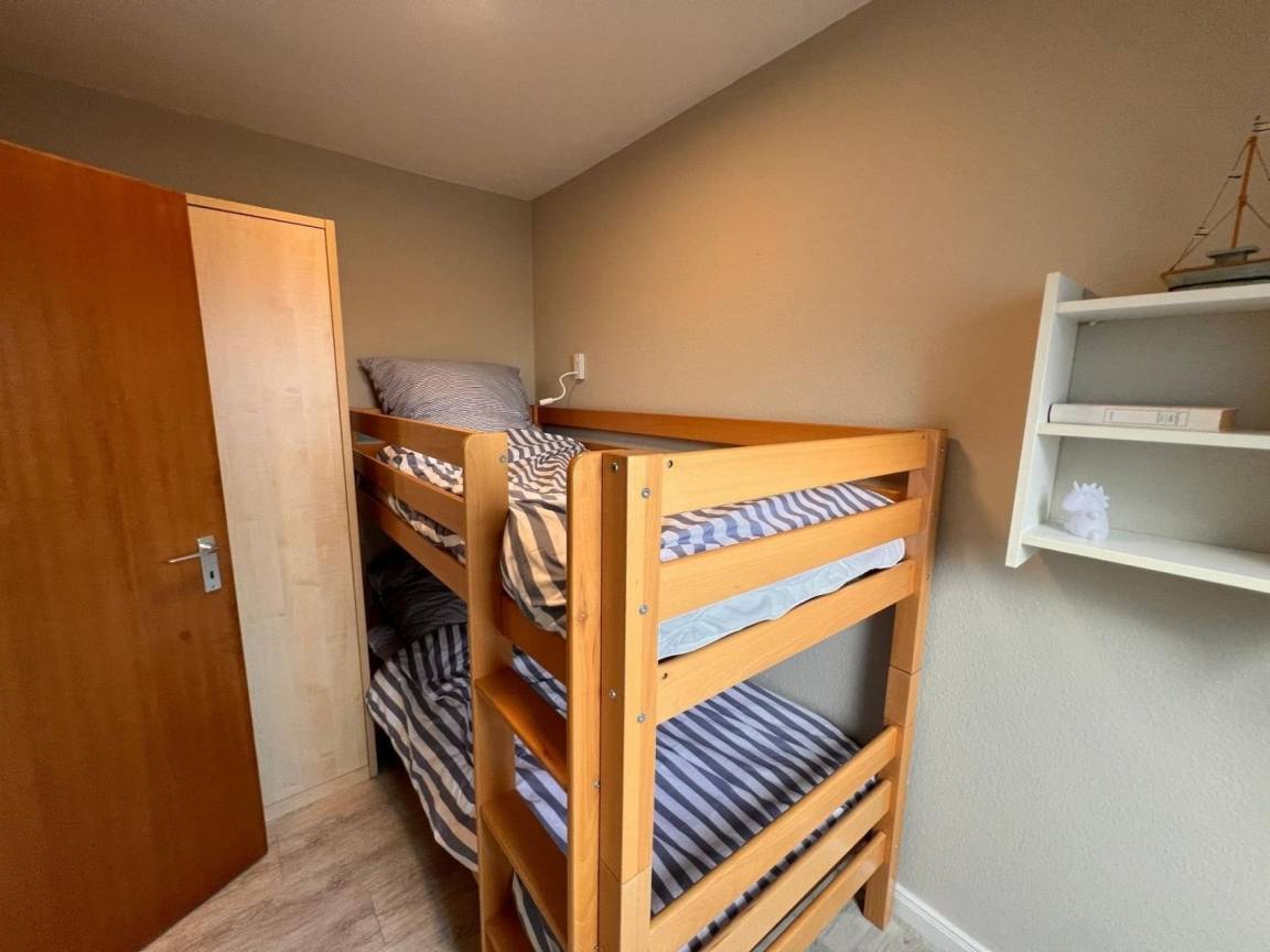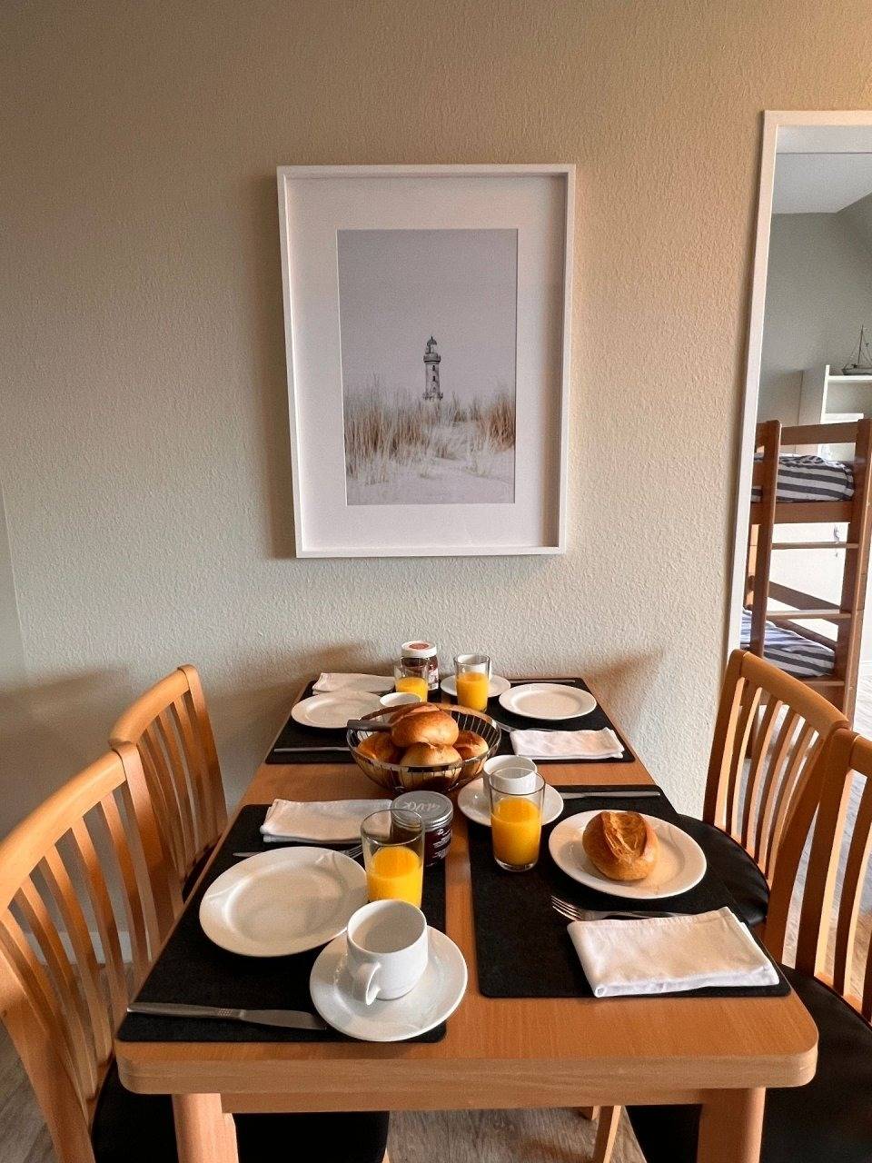 2-Zimmer Appartement im Haus "Nige Wark". In der TV-/Leseecke im Wohnzimmer befindet sich ein gemütliches Zweisitzer-Sofa, zwei Sessel und ein Flat- TV. Die integrierte Küchenzeile mit Spülmaschine, Mikrowelle und Kühlschrank mit Gefrierfach ist komplett ausgestattet und der ausziehbare Esstisch bietet genügend Platz für alle. Im Wohn-/Schlafraum befindet sich zusätzlich noch ein ein Schrankbett (2x90x200). Im Schlaf-/Kinderzimmer steht ein Etagenbett. Das Badezimmer ist mit einer Dusche und WC ausgestattet. Die ca. 42 qm große Wohnung liegt im 1. OG und verfügt zudem auch über einen Balkon zum Garten