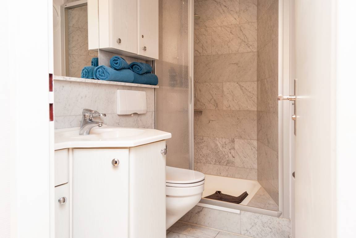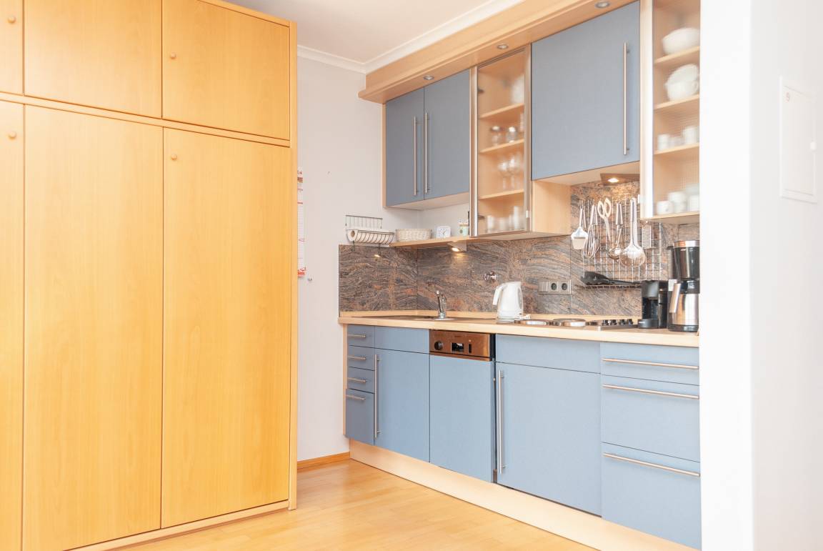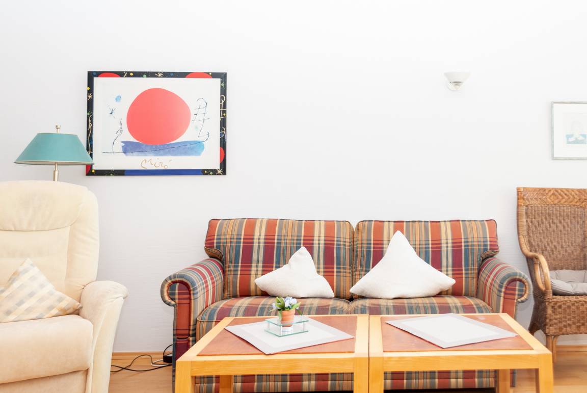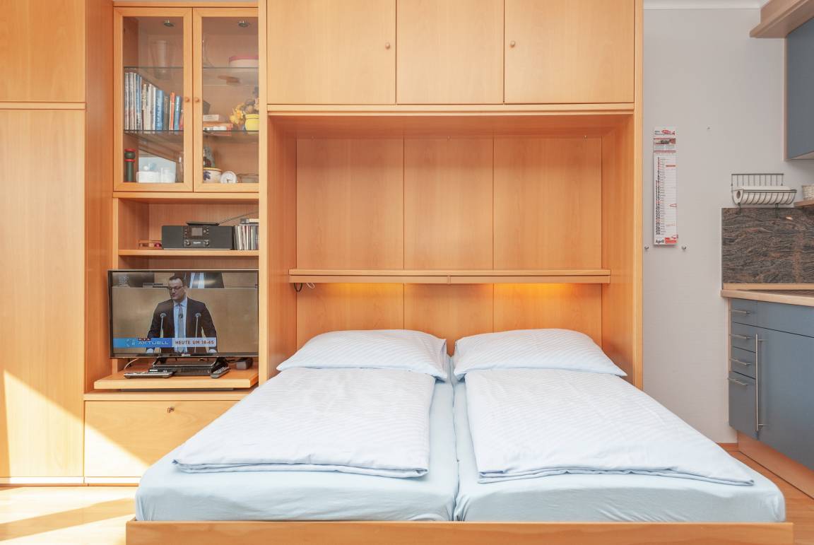 Das Apartment besteht aus einem Wohnbereich mit Schrankbett für 2 Personen ,und einem zusätzlichem Etagenbett in einer Nische im Flur Badezimmer mit Dusche sowie WC. Die Ferienwohnung beinhaltet eine voll ausgestattete offene Küche.