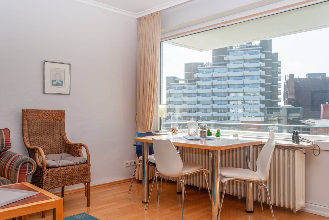 Das Apartment 404 ist ein 1-Raum-Apartment im 4. Obergeschoss für bis zu 3 Personen mit 40 qm. Der Westbalkon mit Meerblick bietet Ihnen vormittags Schatten und nachmittags Sonne .