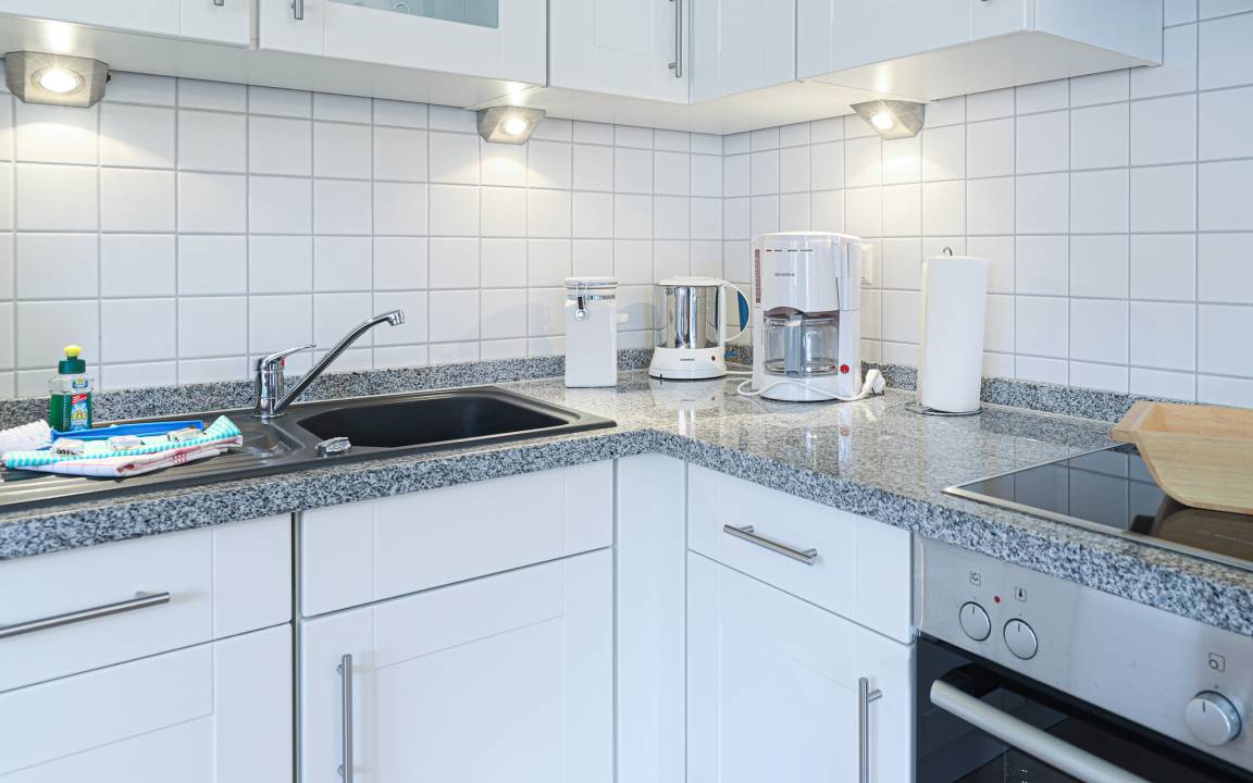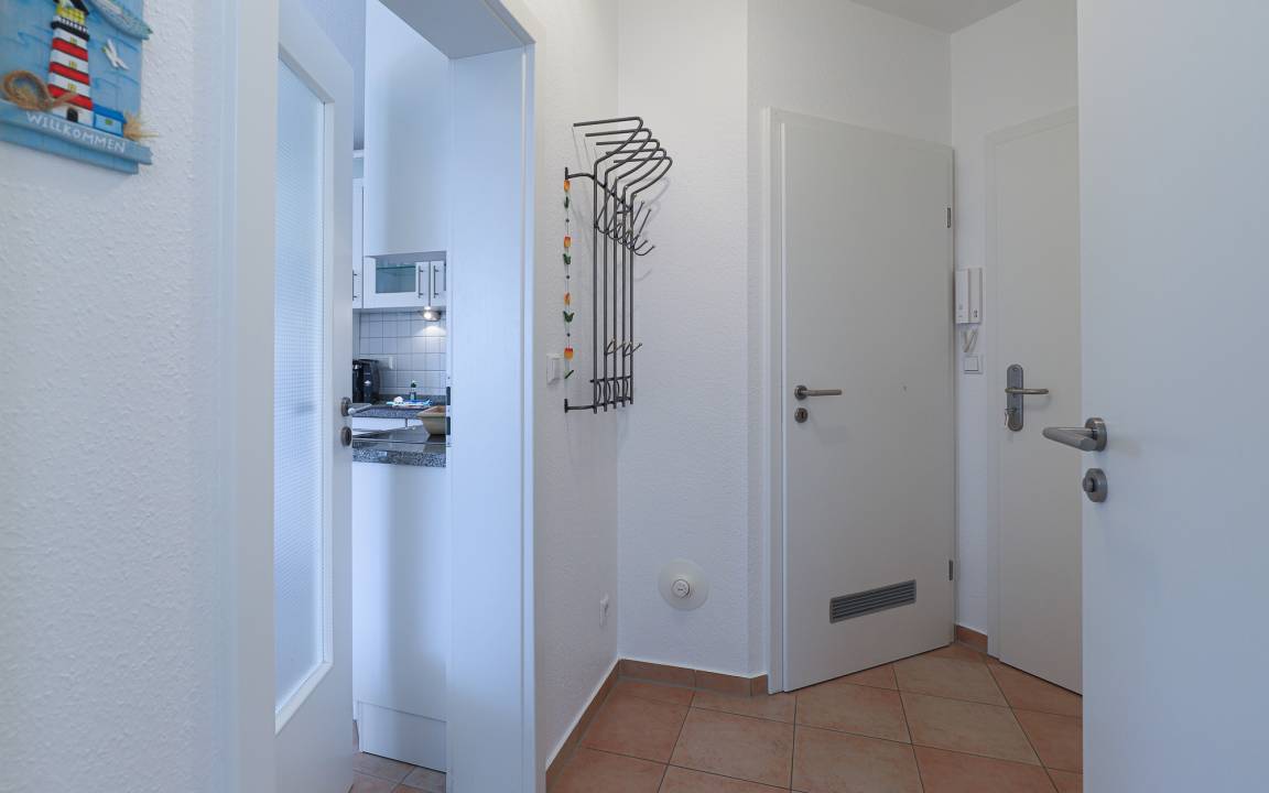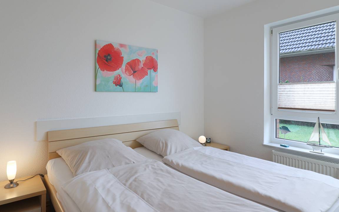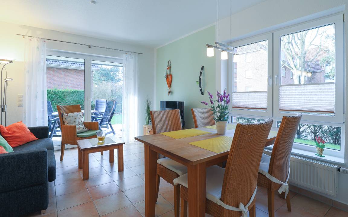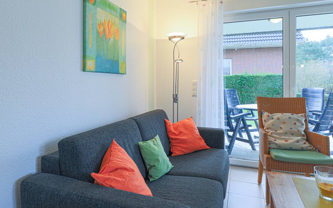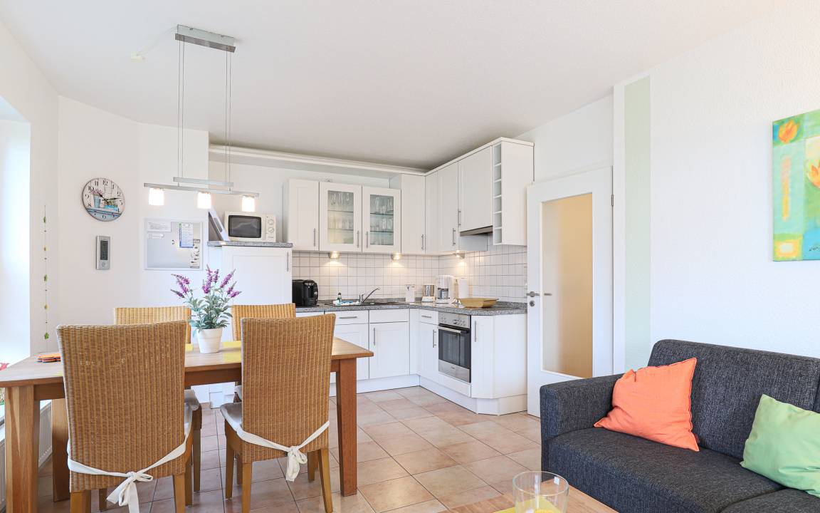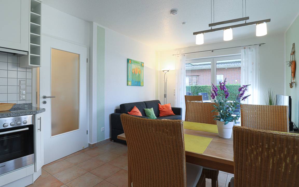 Diese sehr hochwertige Ferienwohnung (Wohn- und Essbereich, Flur und Bad komplett allergikerfreundlich) ist mit einem gemütlichen Schlafzimmer mit großem Kleiderschrank, einem Duschbad (Dusche/WC), einem Abstellraum (plus einem Kellerraum für Ihre Koffer) aufgeteilt. Im Wohn- und Essbereich mit einer sehr gut ausgestatteten Einbauküche (zusätzlich zur Kaffeemaschine eine Tassimo Kapselmaschine) und Zugang zur Terrasse können Sie den Tag genießen. Hier befindet sich auch die Schlafcouch für eine 3. Person. Ein zusätzlicher Strandkorb auf der Terrasse lädt zum gemütlichen Entspannen ein.