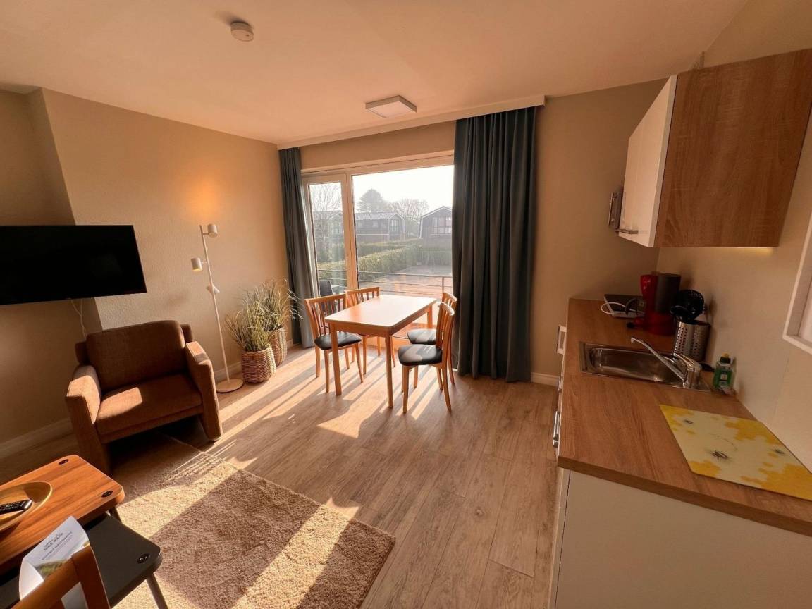 - Einen hellen Wohnbereich mit Sofa, zwei Sesseln, TV und integrierter Küche inklusive Spülmaschine, Mikrowelle und Kühlschrank.