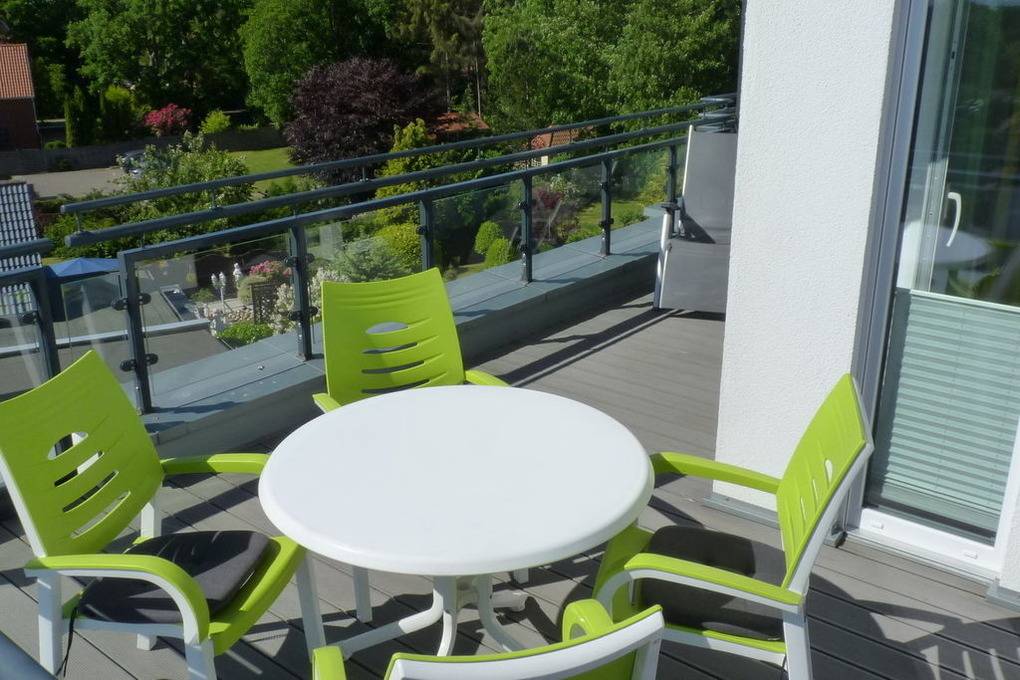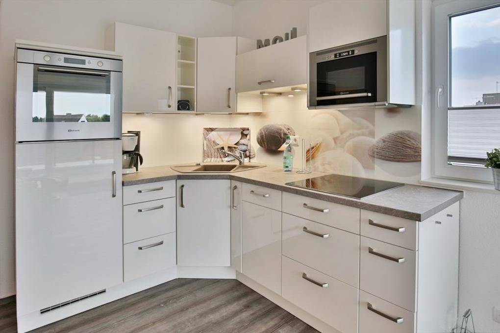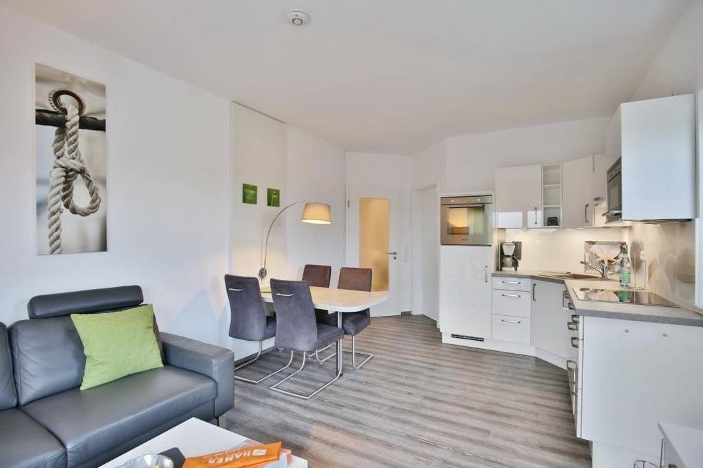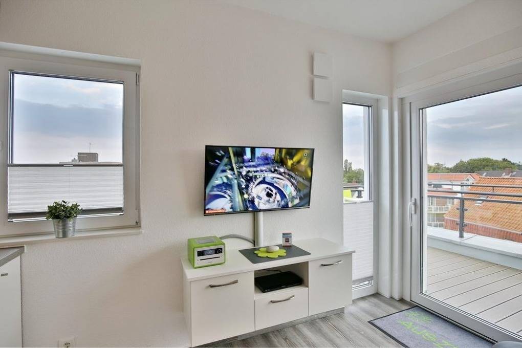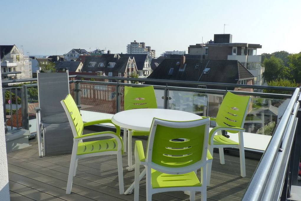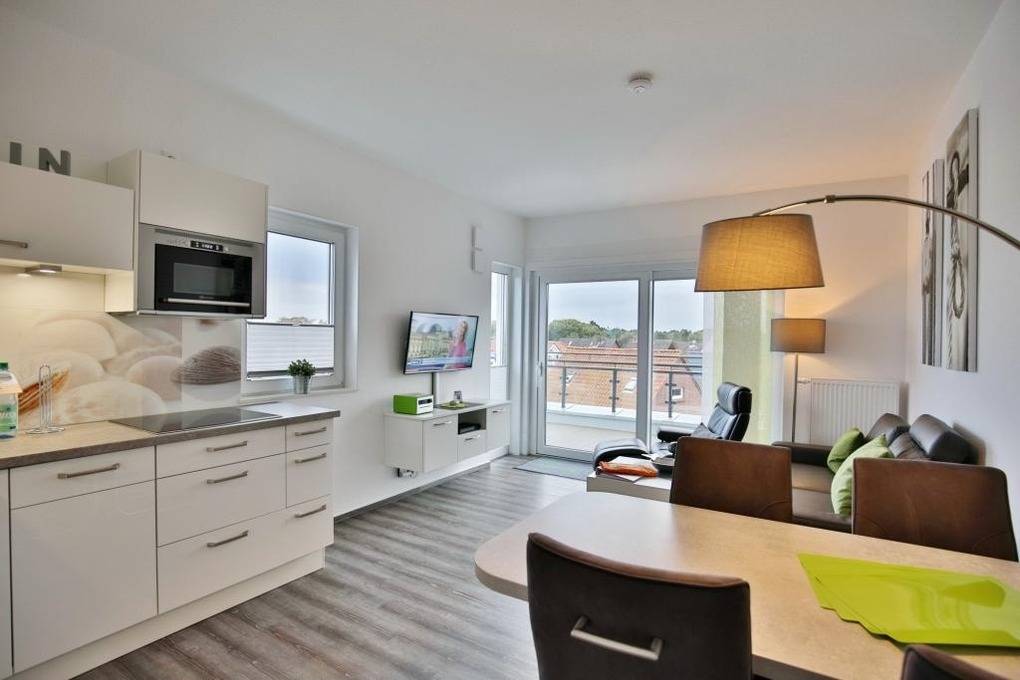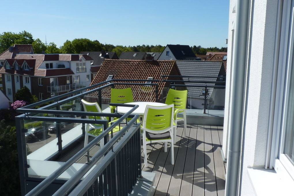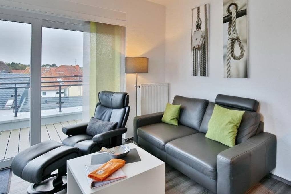 Stilvolle 2-Raum-Penthouse-Wohnung mit Seesicht vom Balkon. (ca. 51m²), 3.Etage, 1 Schlafzimmer mit Doppelbett und Außenjalousien,, 2xDusche/WC, Wohnzimmer mit vollausgestatteter Küchenzeile (Back., Mikrow., Geschirrspüler) 1xSAT-TV, DVD-Player, Sonoro-HiFi-Anlage, Abstellraum im Dachgeschoss, kostenfreies W-Lan, Balkon (süd/ost), Personenaufzug, reservierter Pkw-Stellplatz i.d. Tiefgarage #14, Nichtraucher.