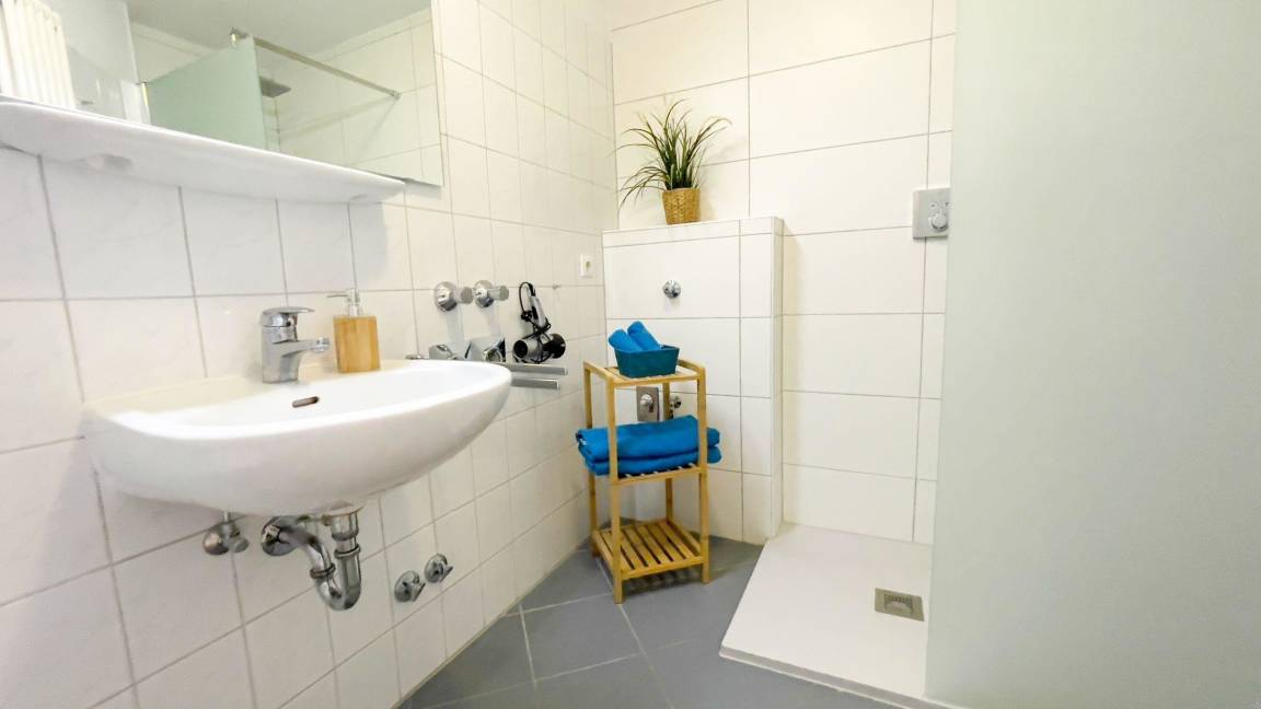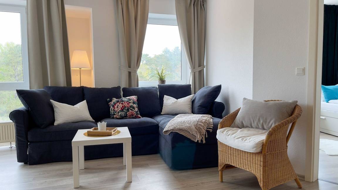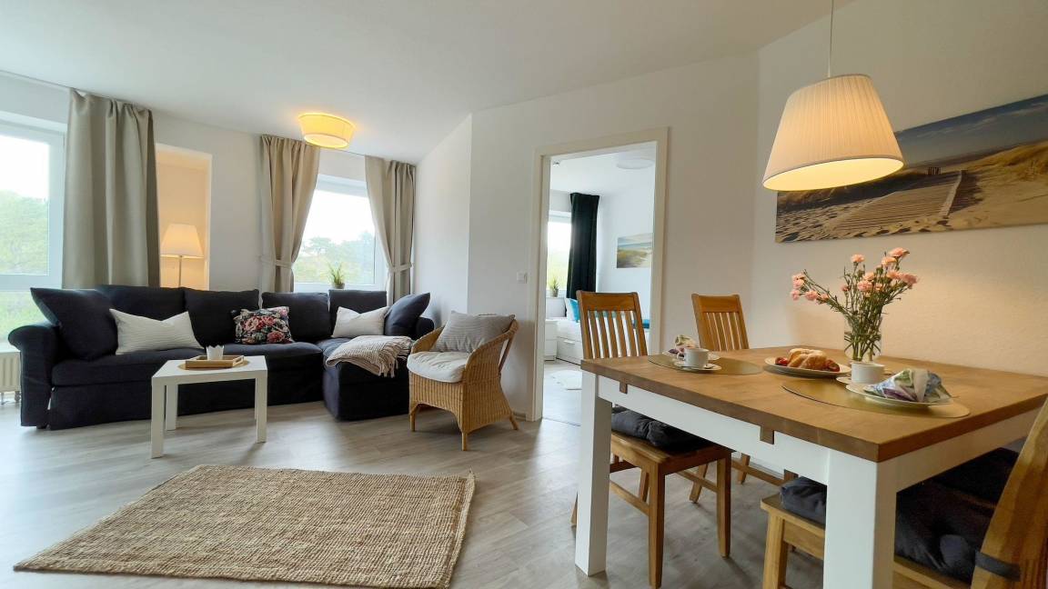 Die 69 qm große Ferienwohnung in Cuxhaven Sahlenburg bietet Platz für bis zu 7 Personen und befindet sich in der 1. Etage, die bequem mit dem Aufzug erreicht werden kann. Sie umfasst zwei separate Schlafzimmer, eines mit einem Doppelbett und das andere mit zwei Einzelbetten, von denen eines ausziehbar ist. Der großzügige Wohnraum ist mit einem ausklappbaren Schlafsofa ausgestattet und verfügt über eine voll ausgestattete Küchenzeile. Das Bad bietet eine ebenerdige Dusche. Zusätzlich ist eine Waschmaschinen-/Trocknerkombination in der Wohnung vorhanden. Die Wohnung ist ideal für Familien und bietet eine Kombination aus Komfort und Ruhe. Ein Fahrradkeller steht zur Verfügung. Der Strand ist nur etwa 200 Meter entfernt, ebenso die Sahlenburger Strandpromenade mit zahlreichen Restaurants, Cafés und Shops.