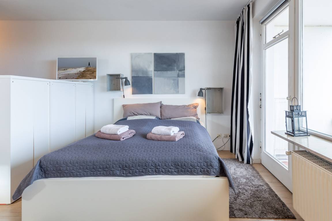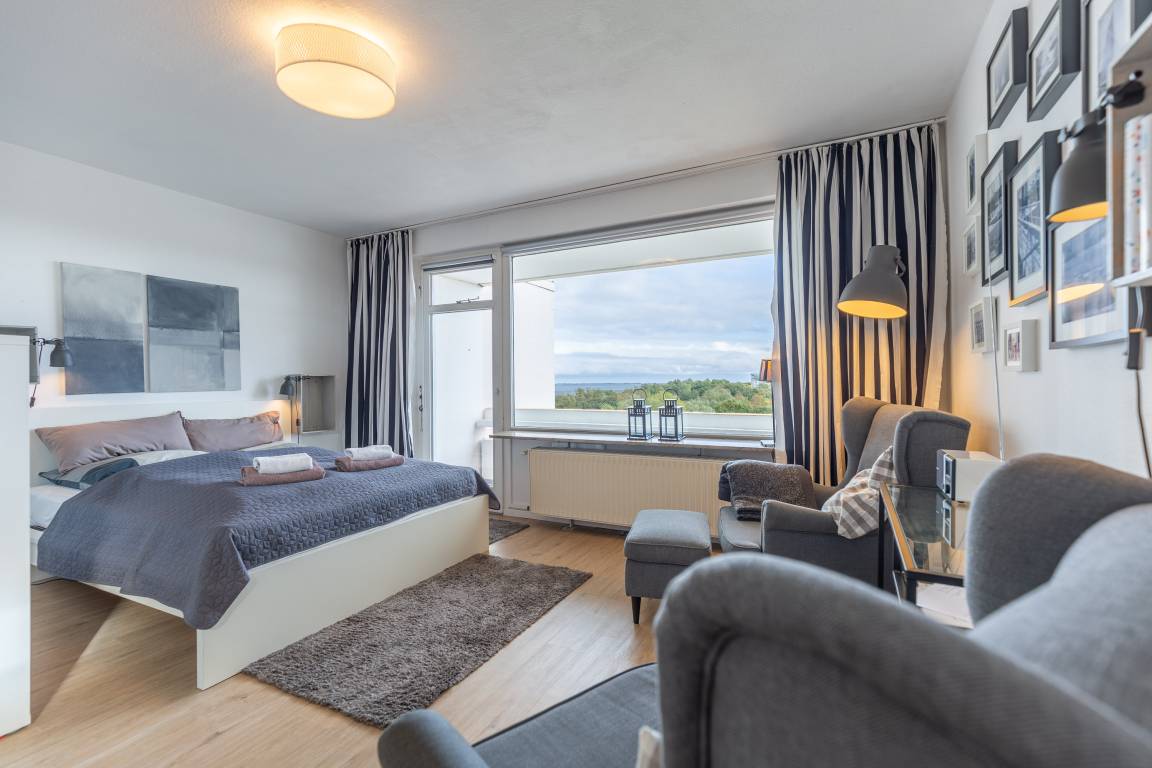 Die 32 m² Ferienwohnung bietet ausreichend Platz für 2 Personen. Der kombinierte Wohn- und Schlafbereich ist mit einem Doppelbett ausgestattet. Die beiden Relaxsessel gewährleisten, dass Sie sich entspannt zurücklehnen können, während Sie den faszinierenden Meerblick oder das Abendprogramm auf dem Flachbildfernseher genießen. Die integrierte Küche ist mit einem 2-Plattenkochfeld, einem Sandwich Toaster sowie einem Kühlschrank mit Gefrierfach ausgestattet. Ferienwohnung 612 verfügt über ein modernes Bad mit Dusche und WC. Während Ihres Urlaubs steht Ihr Auto sicher in der zugehörigen Garage.