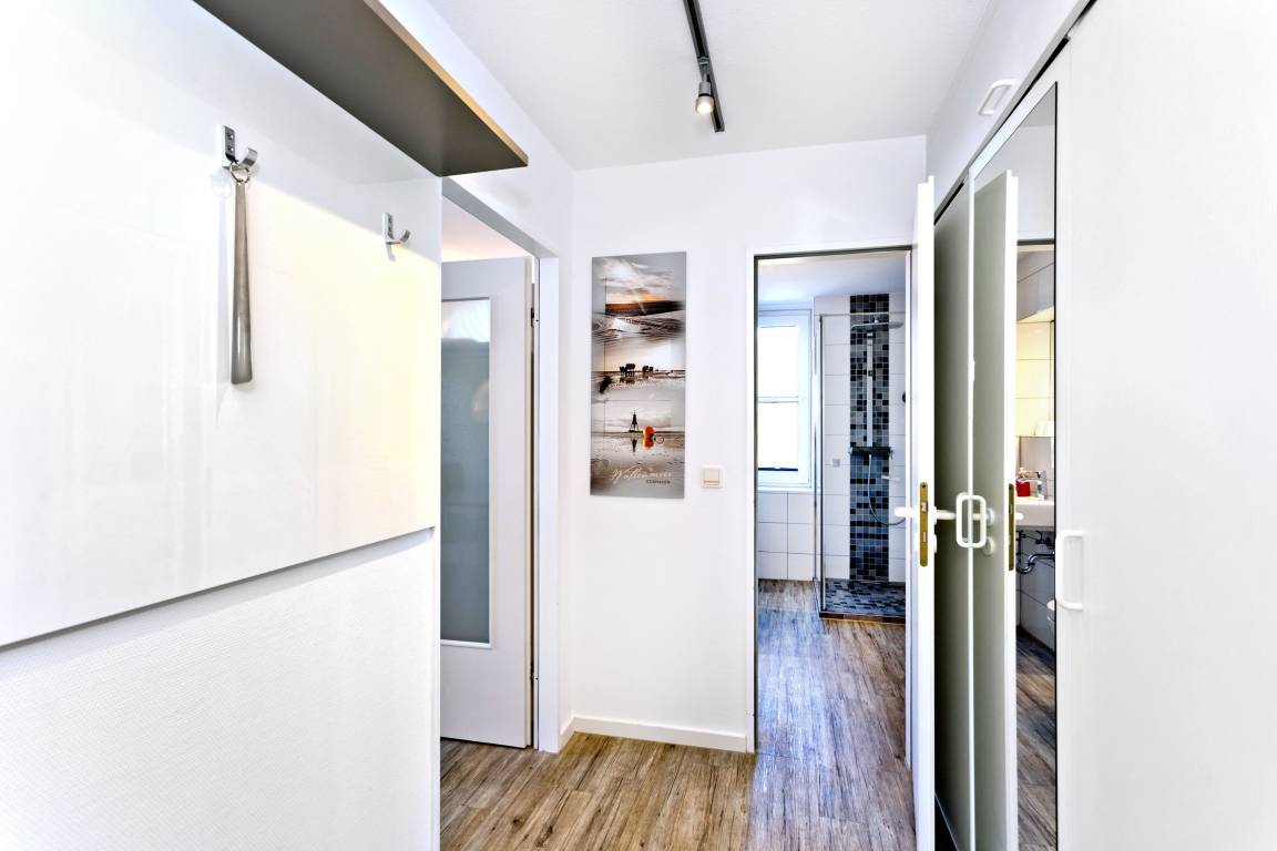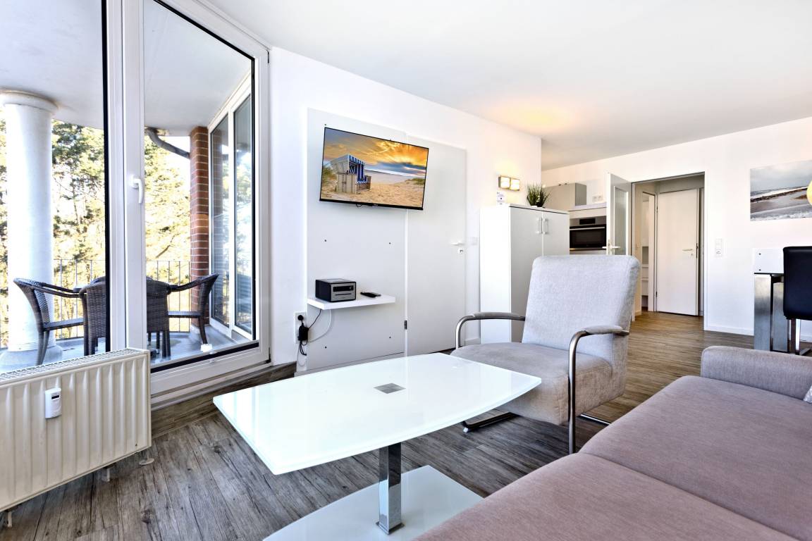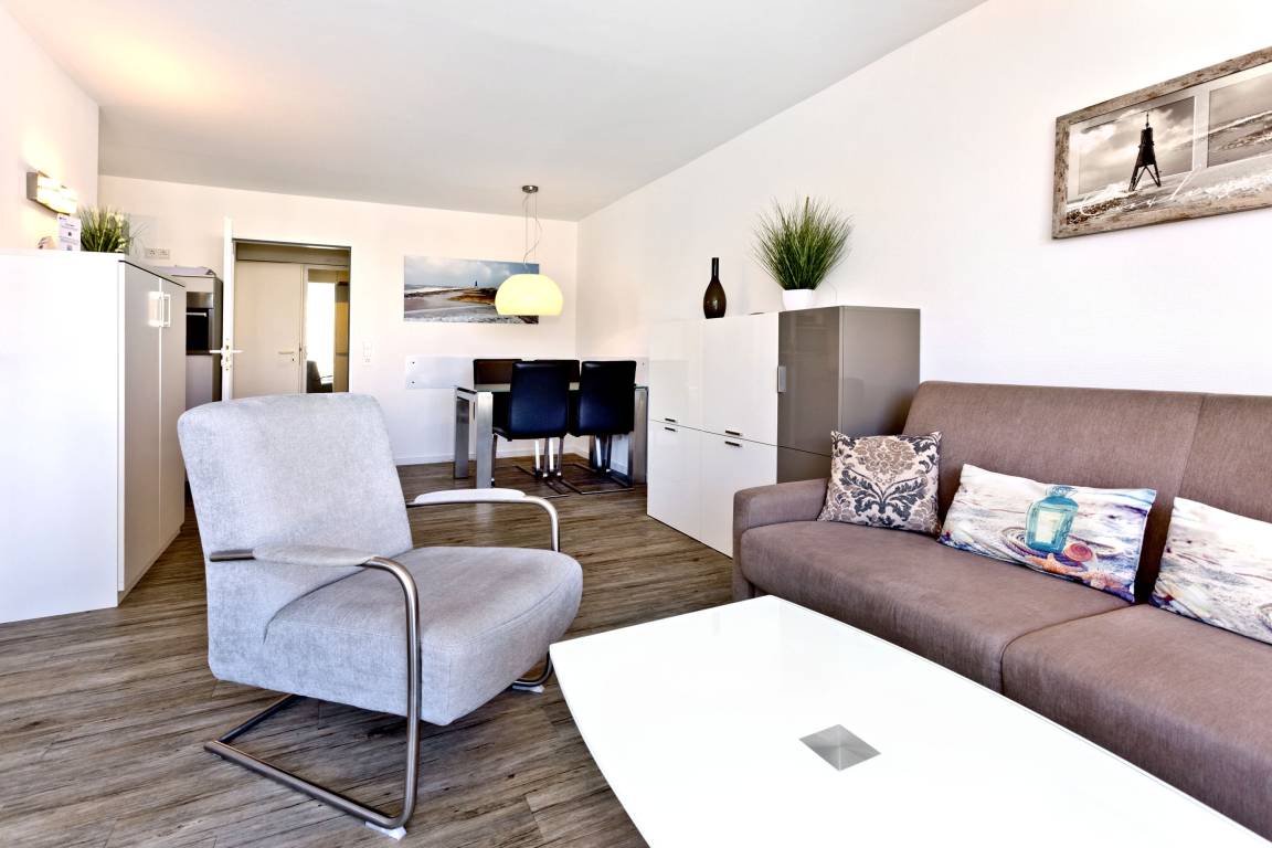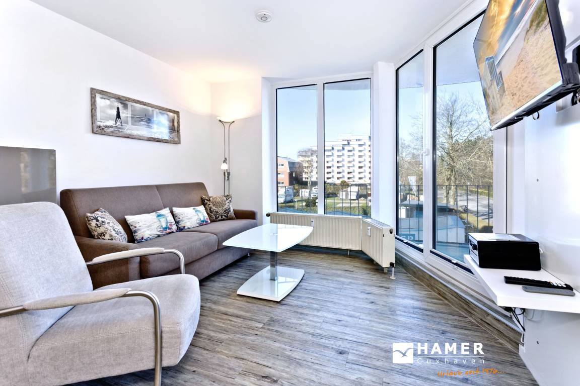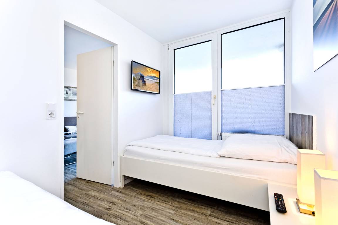 Neu renovierte 2-Raum-Eckwohnung mit 42m² auf der 2. Etage. Komplett ausgestattet bis 3 Pers.. 1 Schlafzimmer mit 2 Einzelbetten (1,90m) [&] TV, 1 kombiniertes Wohn/Schlafzimmer mit Doppelbettcouch, Sat-TV, Sonoro-HiFi-Anlage, kostenloses W-Lan. Komplette Küchenzeile mit Geschirrspüler, Mikrowelle [&] Ceranfeld, Tageslichtbad mit Dusche/WC, Flur, Balkon (west) mit Balkonmöbeln und Sonnenschirm (saisonabhängig). PKW-Stellplatz #202 in der Tiefgarage. Natürlich Nichtraucher [&] keine Haustiere.