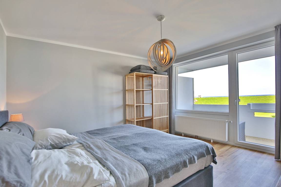 Ein separates Schlafzimmer mit komfortablem und großzügigem Boxspringbett (200x200 cm) sorgt für einen erholsamen Schlaf. Schiffchen anstatt Schäfchen zählen - schon vom Boxspringbett aus genießen Sie den atemraubenden Blick auf den Schifffahrtsweg. Derweil sorgen Verdunklungsvorhänge dafür, dass Sie nicht von der Morgensonne geweckt werden.