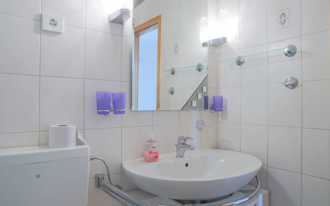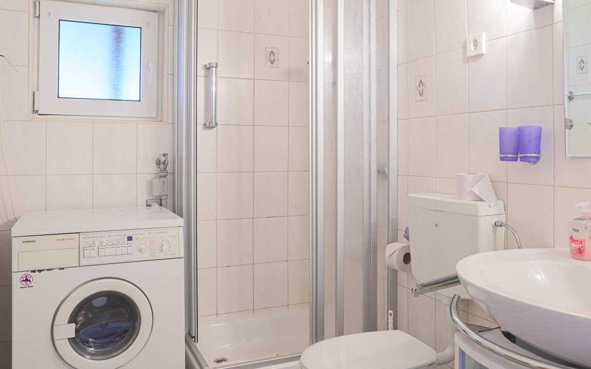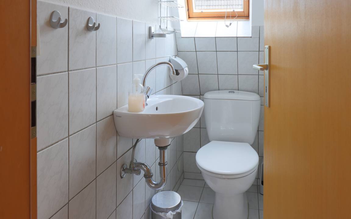 Das Duschbad mit WC befindet sich im Erdgeschoss. Zusätzlich steht im Obergeschoss ein separates Gäste-WC zur Verfügung.