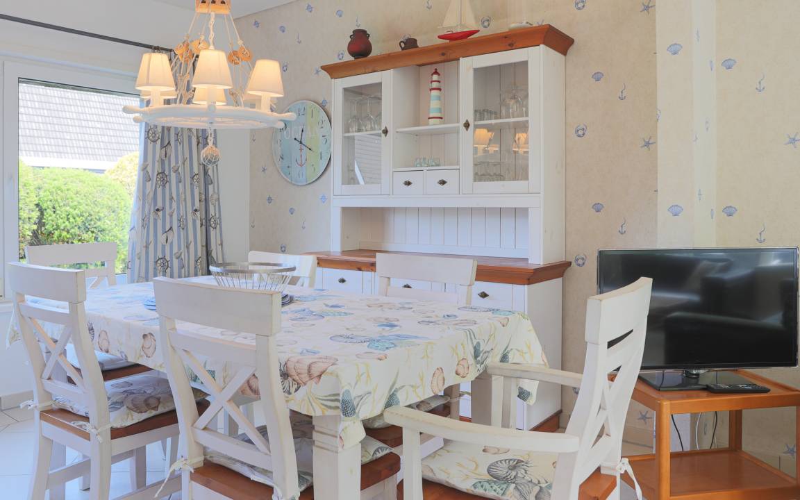 Der Wohnbereich im Erdgeschoss ist funktional und gemütlich eingerichtet. Ein großer Esstisch bildet den Mittelpunkt für gemeinsame Mahlzeiten, ergänzt durch eine Sitzecke und einen Kamin, der besonders in der kühleren Jahreszeit für eine angenehme Atmosphäre sorgt. Von hier aus gelangen Sie direkt auf die Terrasse mit Gartenmöbeln.