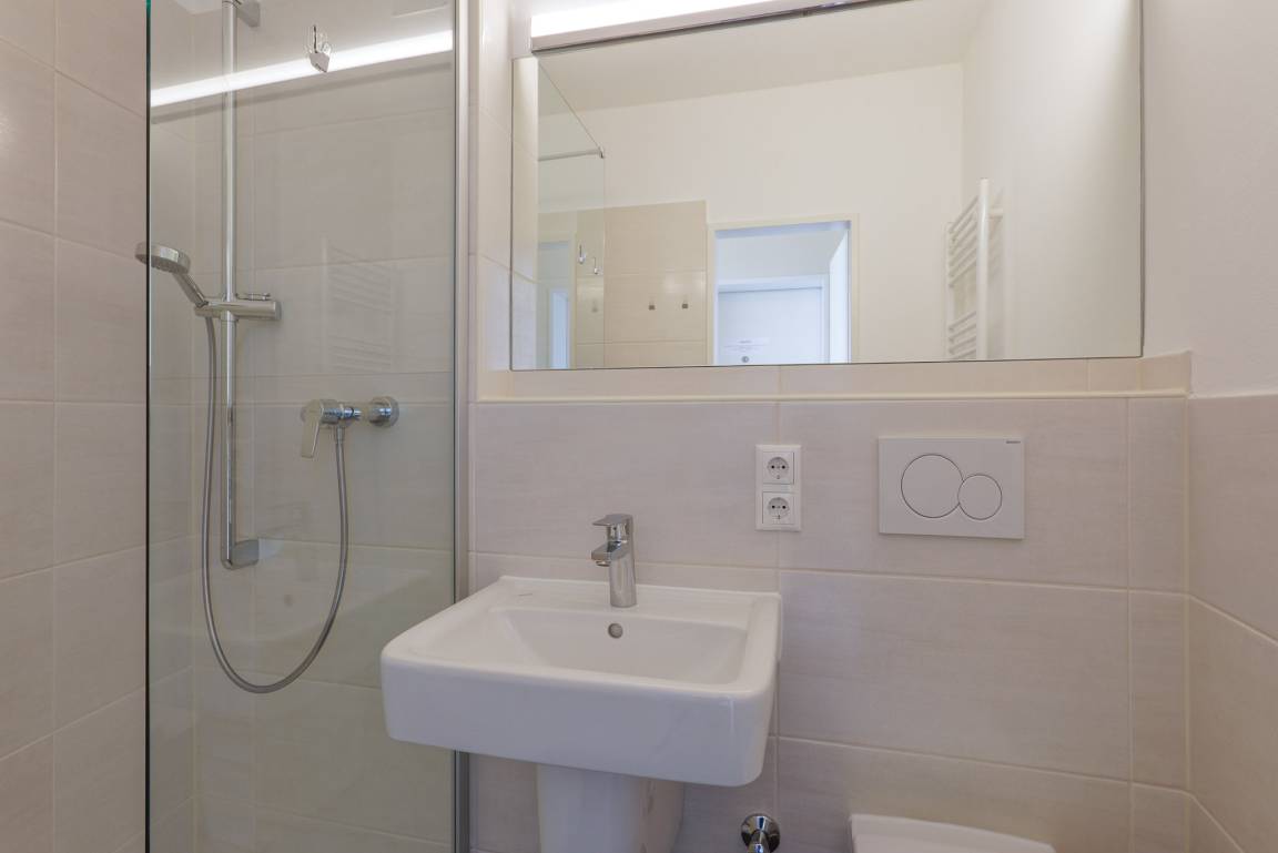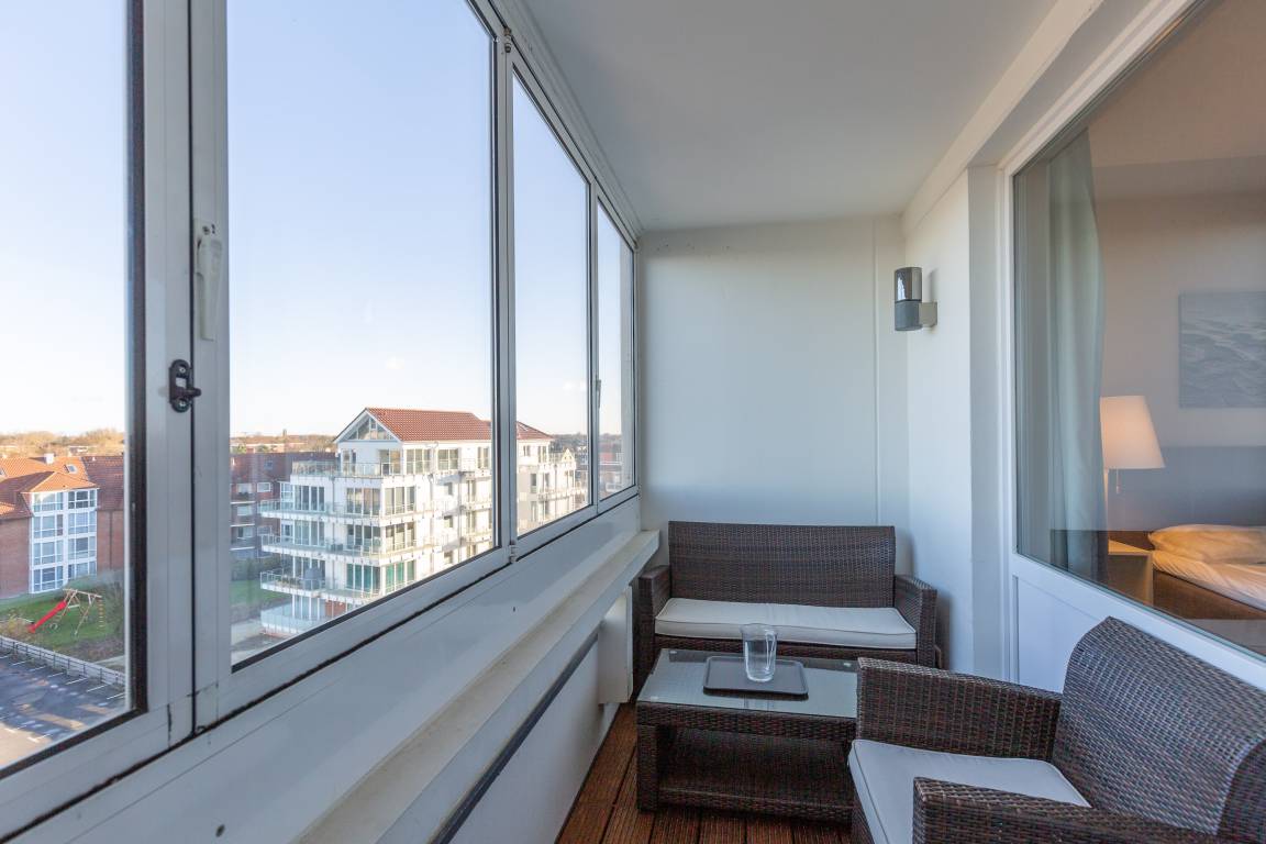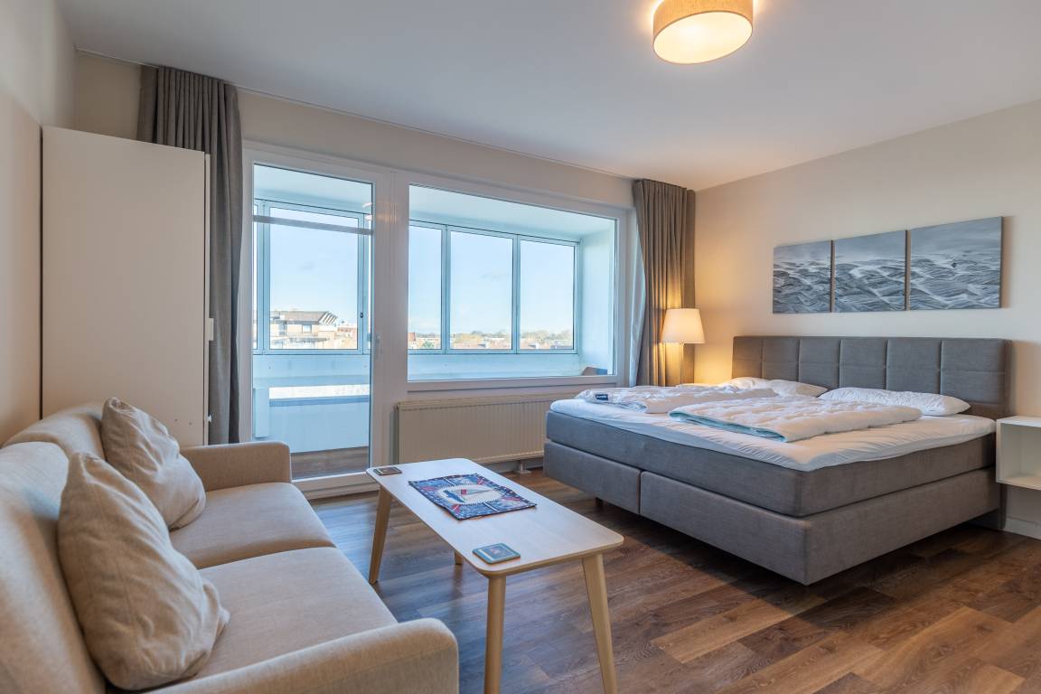 Die 32 m² Ferienwohnung bietet ausreichend Platz für 2 Personen. Der kombinierte Wohn- und Schlafbereich ist mit einem komfortablem Doppelbett ausgestattet. Ein Sofa lädt zum Verweilen ein. Währenddessen sorgen kostenloses WLAN und ein Flachbild-TV für beste Unterhaltung. Die integrierte Küche ist mit einem 2-Zonen Cerankochfeld, einer Mikrowelle, einer Spülmaschine sowie einem Kühlschrank mit Gefrierfach ausgestattet. Zudem lädt ein verglaster Balkon auch bei Wind und Wetter zum Verweilen ein. Die Verglasung des Balkons lässt sich auf Wunsch jederzeit öffnen. Ferienwohnung 513 verfügt über ein Bad mit Dusche und WC. Der Wohnung ist ein KFZ-Stellplatz zugeordnet. Ob E-Bike oder klassisches Rad, Ihre Fahrräder finden auf zwei Stellplätzen im abschließbaren Fahrradschuppen einen sicheren Platz.