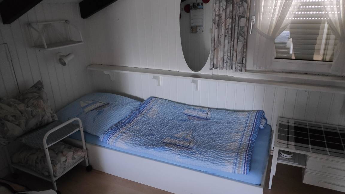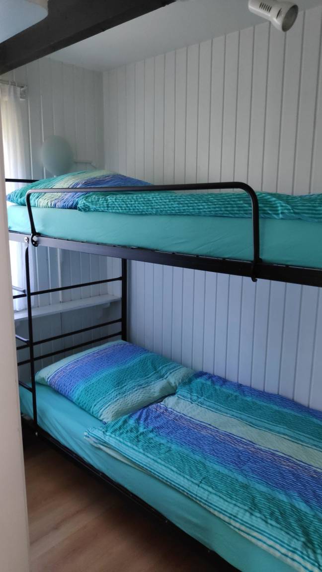 Im unteren Schlafraum steht ein Etagenbett für Ihre Kinder bereit. Oben bieten ein Doppel- und zwei Einzelbetten Platz für 4 Personen. Ein (vorhandenes) Kinderbett kann auf Anfrage aufgestellt werden. Das Sofa im Wohnraum kann bei Bedarf als Schlafsofa aufgeklappt werden.