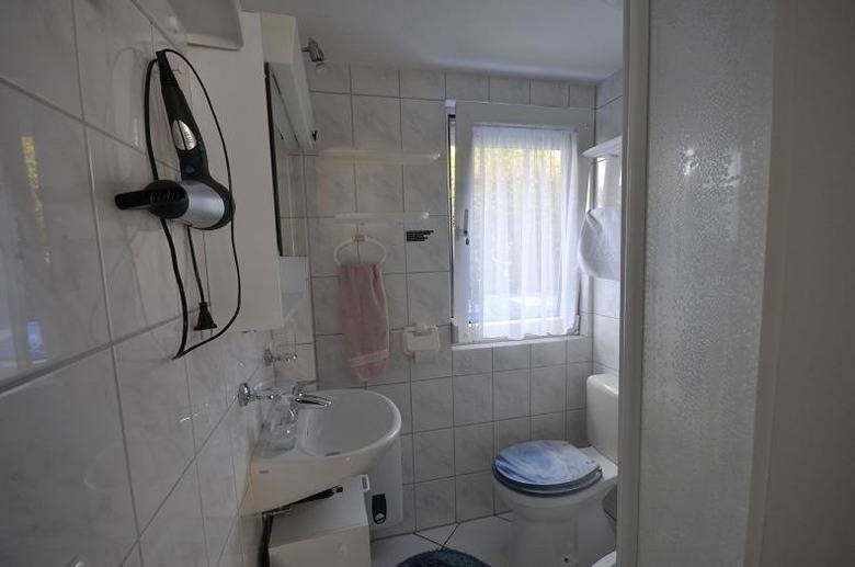 Das strahlende Badezimmer bietet eine komfortable Runddusche.