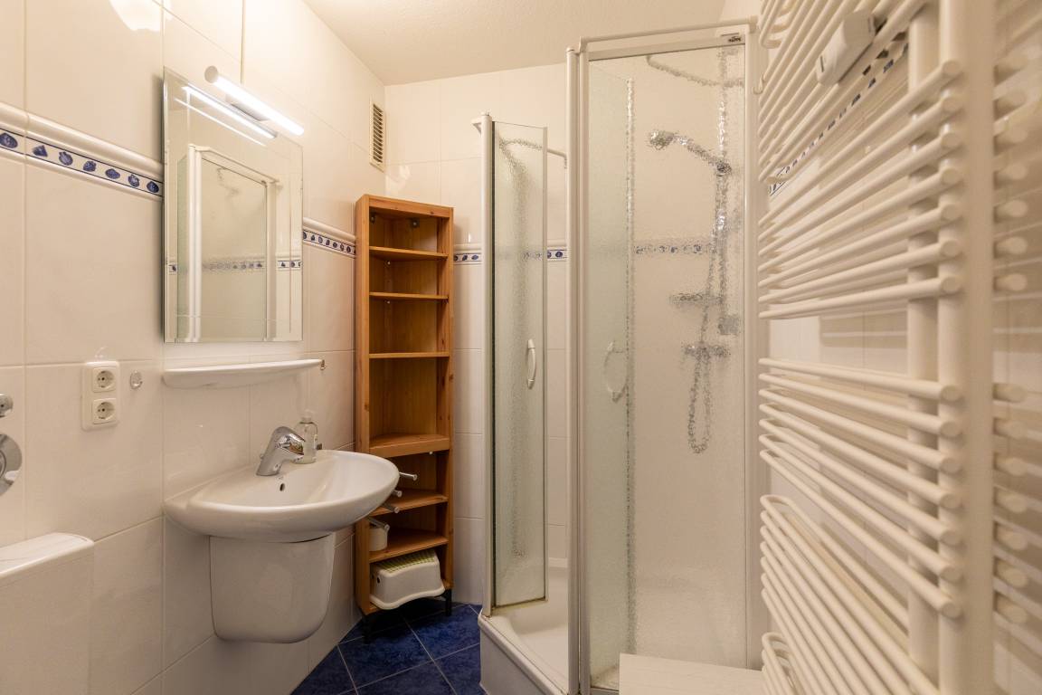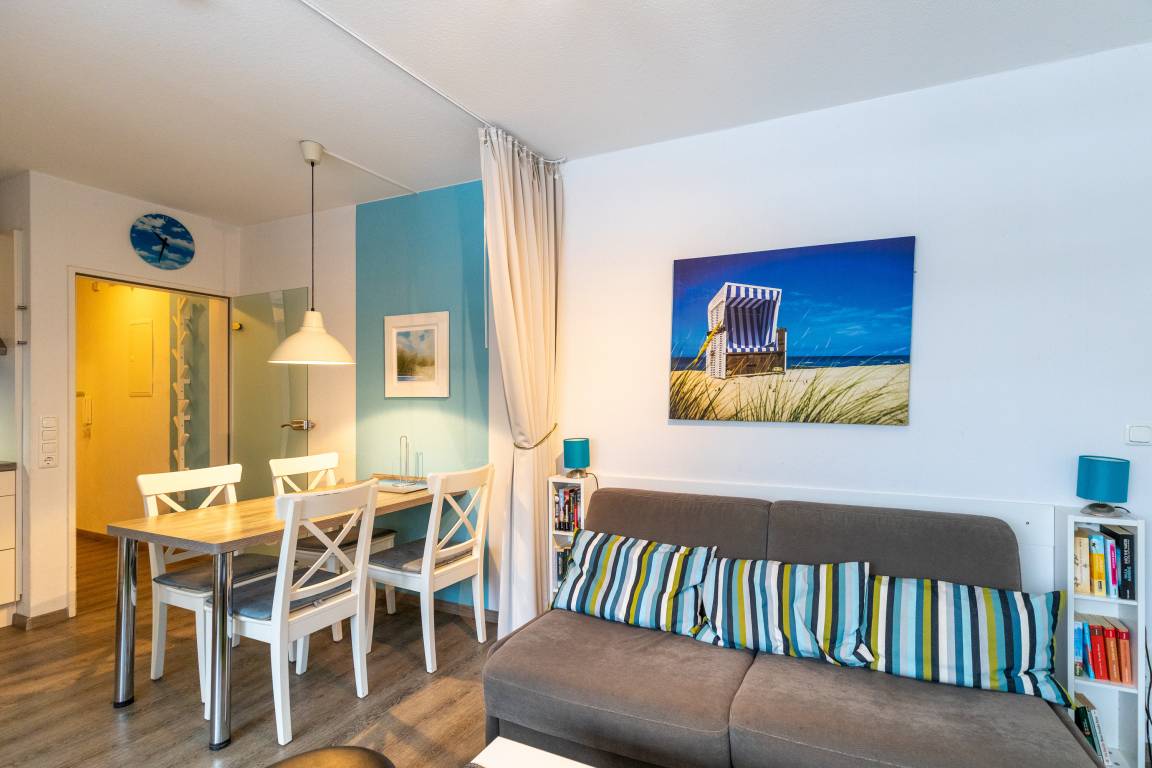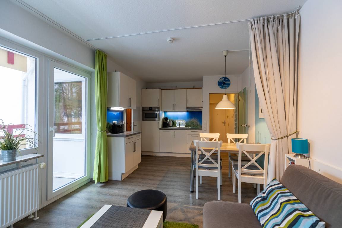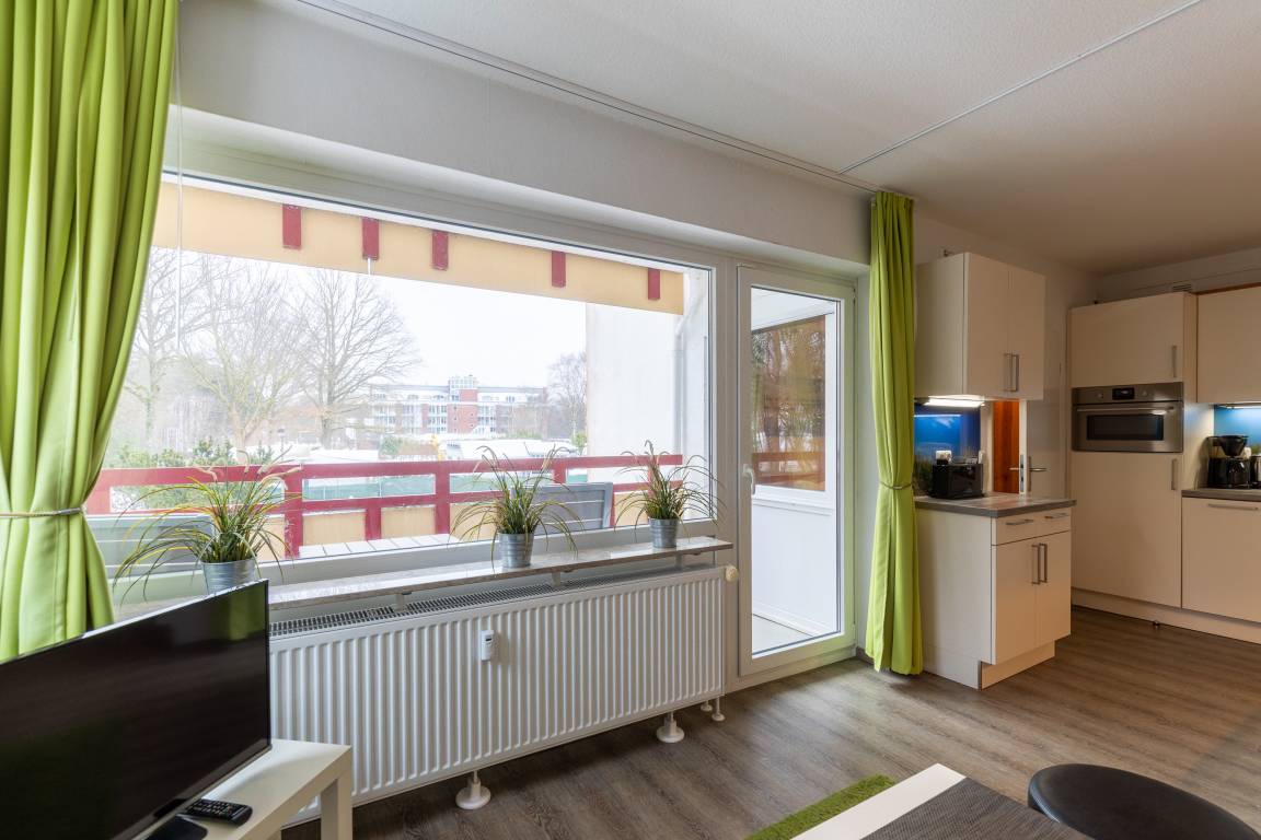 Die Wohnung verfügt über ein Schlafzimmer (kann mit dem elektrischen Rollladen verdunkelt werden) mit Doppelbett (180x200) sowie ein Badezimmer mit Dusche und WC. In der voll ausgestatteten Küchenzeile, im Wohnzimmer, finden Sie alles was Sie für die Zubereitung Ihrer Mahlzeiten benötigen (Kühlschrank mit Gefrierfach, Cerankochfeld mit 2 Kochstellen, Wasserkocher, Kaffeemaschine, Toaster, Kombi aus Mini Backofen/Mikrowelle). Das Wohnzimmer verfügt neben der Küchenzeile über ein Sofa (das als Schlafsofa genutzt werden kann), TV und einen Essplatz, von hieraus gelangt man auf den Balkon.