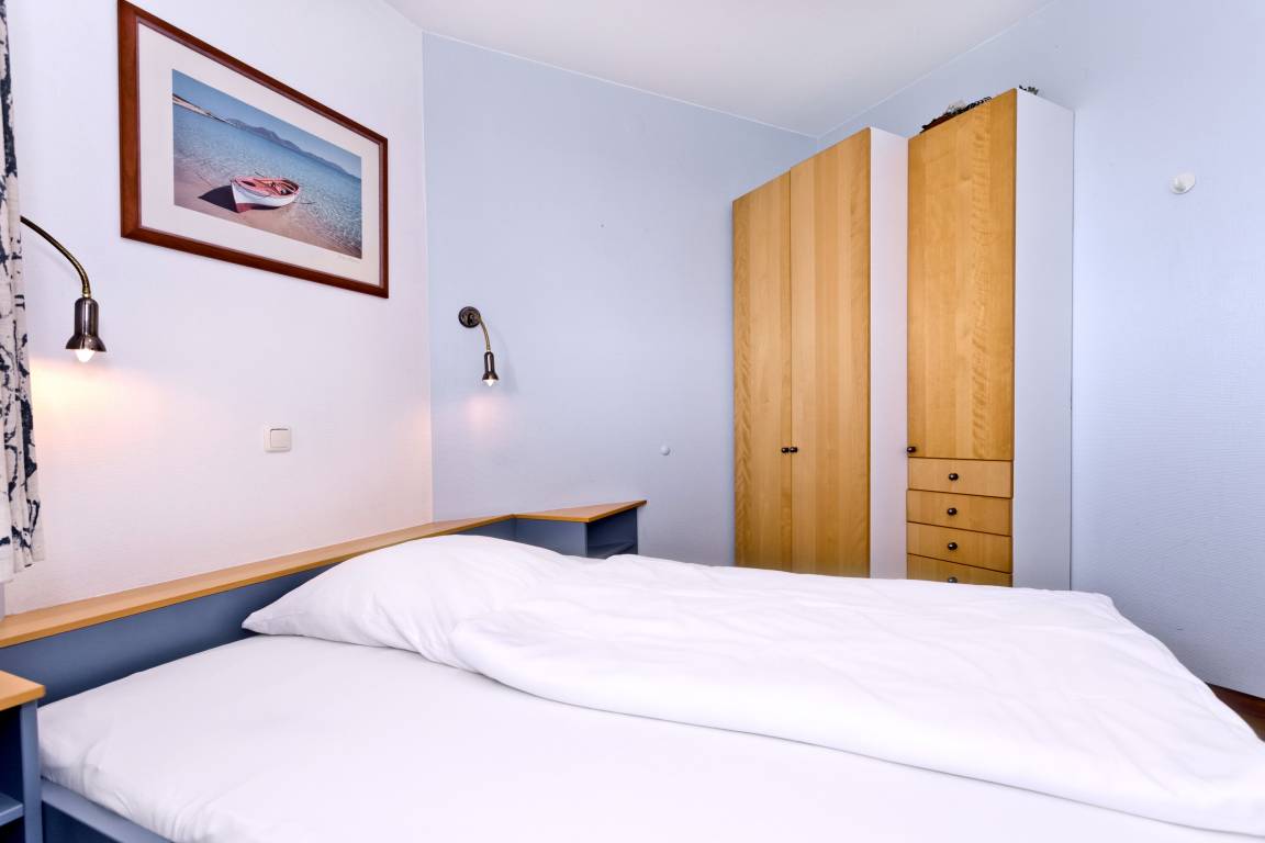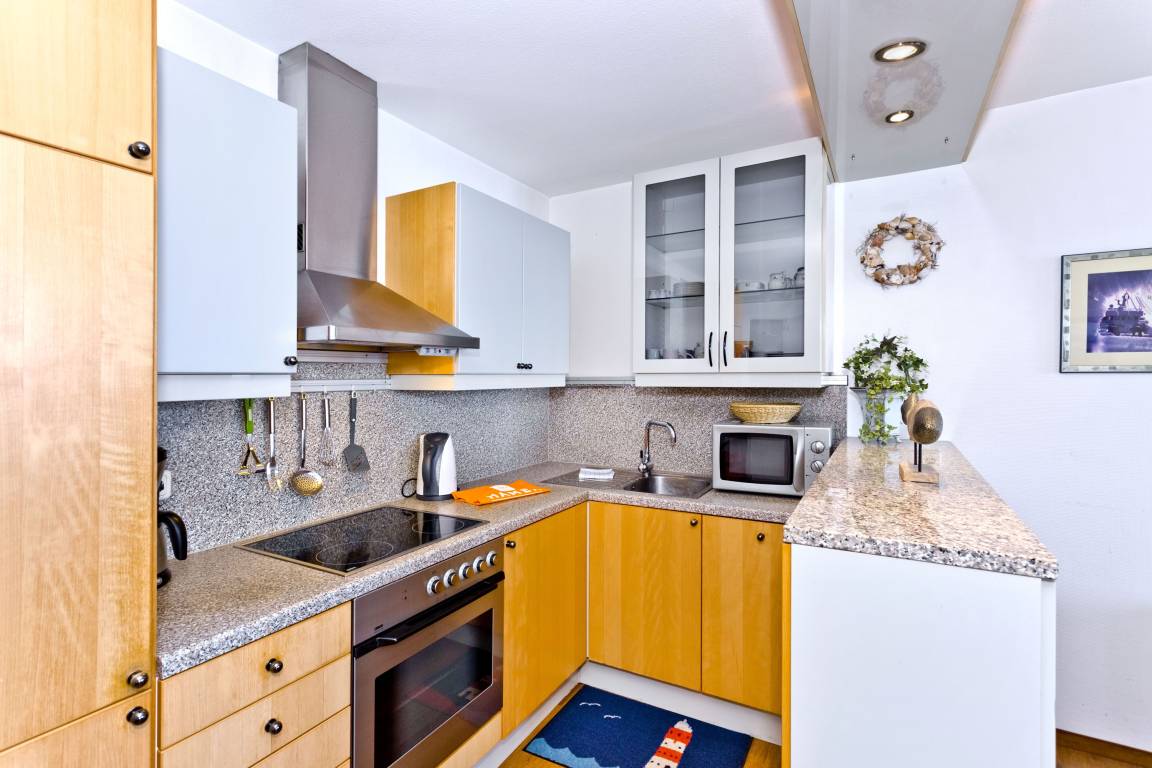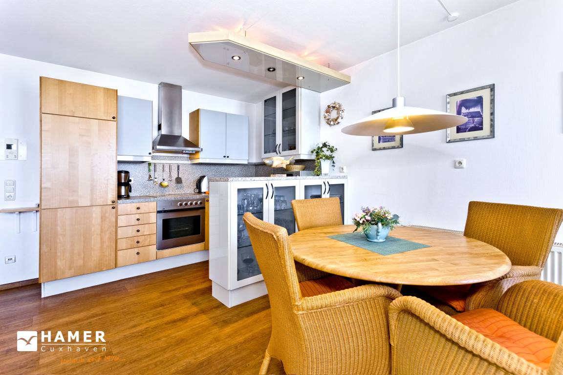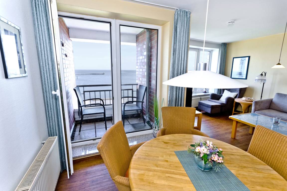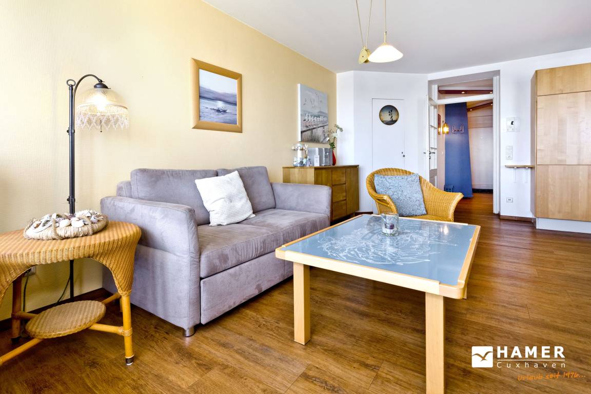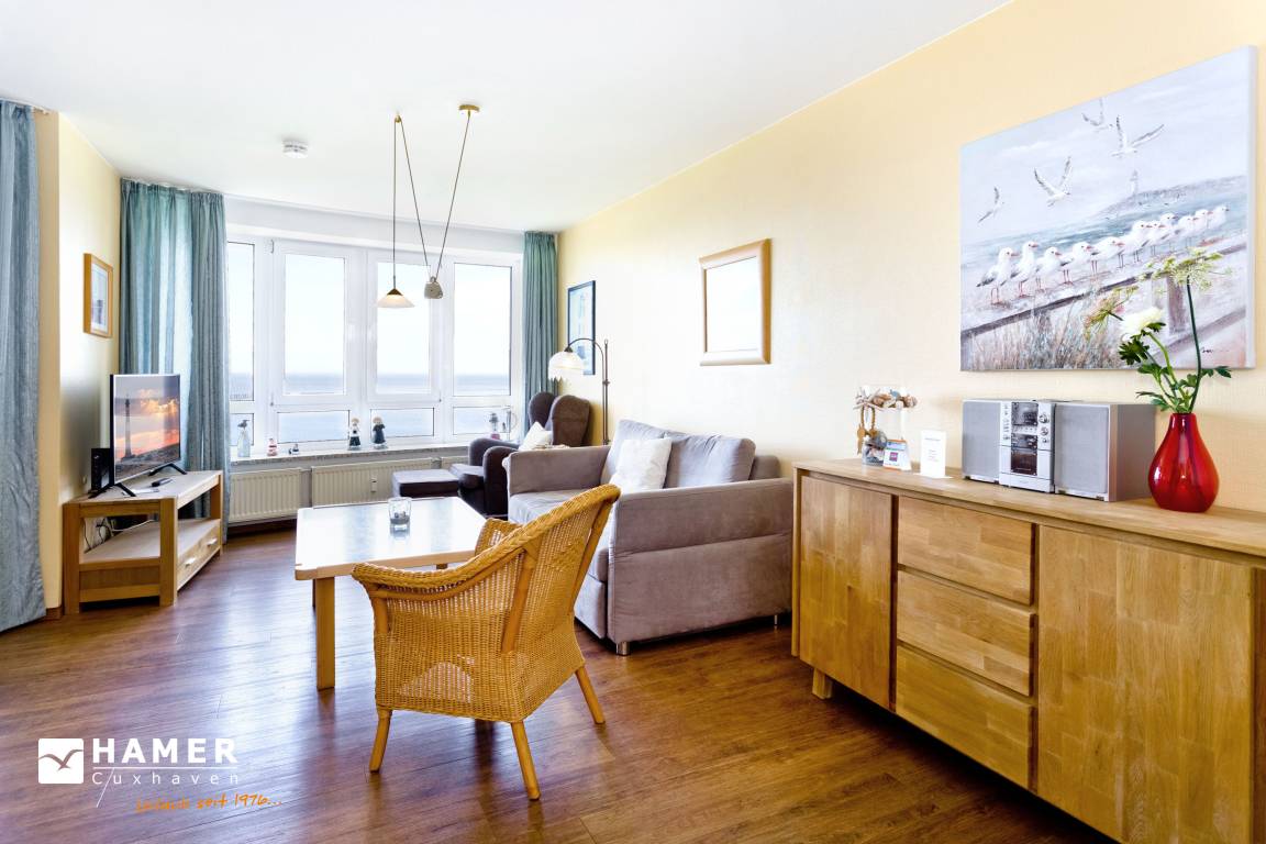 Schöne 2-Raum-Ferienwohnung für 2 Personen über ca. 50m² mit Sicht auf die Elbmündung. 3.Etage mit Aufzug, Schlafzimmer mit Doppelbett (2x75x190) und Rollladen, komplette Küchenzeile (Geschirrspüler, Mikrowelle etc.) Wohnzimmer mit Sofa, Kabel-TV, kostenfreies W-LAN, Esstisch, kleiner Balkon zur Seeseite (nord), nummerierter Pkw-Stellplatz #36 am Haus, keine Haustiere gestattet, Nichtraucher.