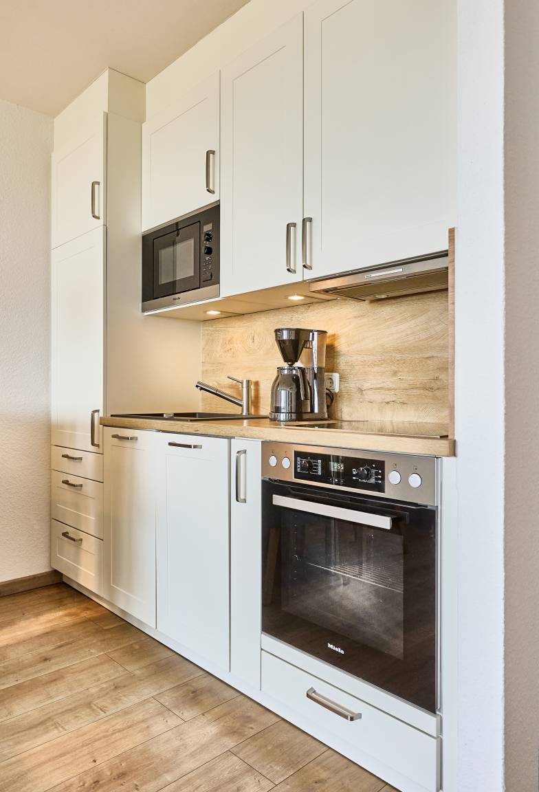 Die Küche ist vollständig eingerichtet und bietet alles für die Selbstverpflegung. Der Essbereich grenzt direkt an und eignet sich für gemeinsame Mahlzeiten.