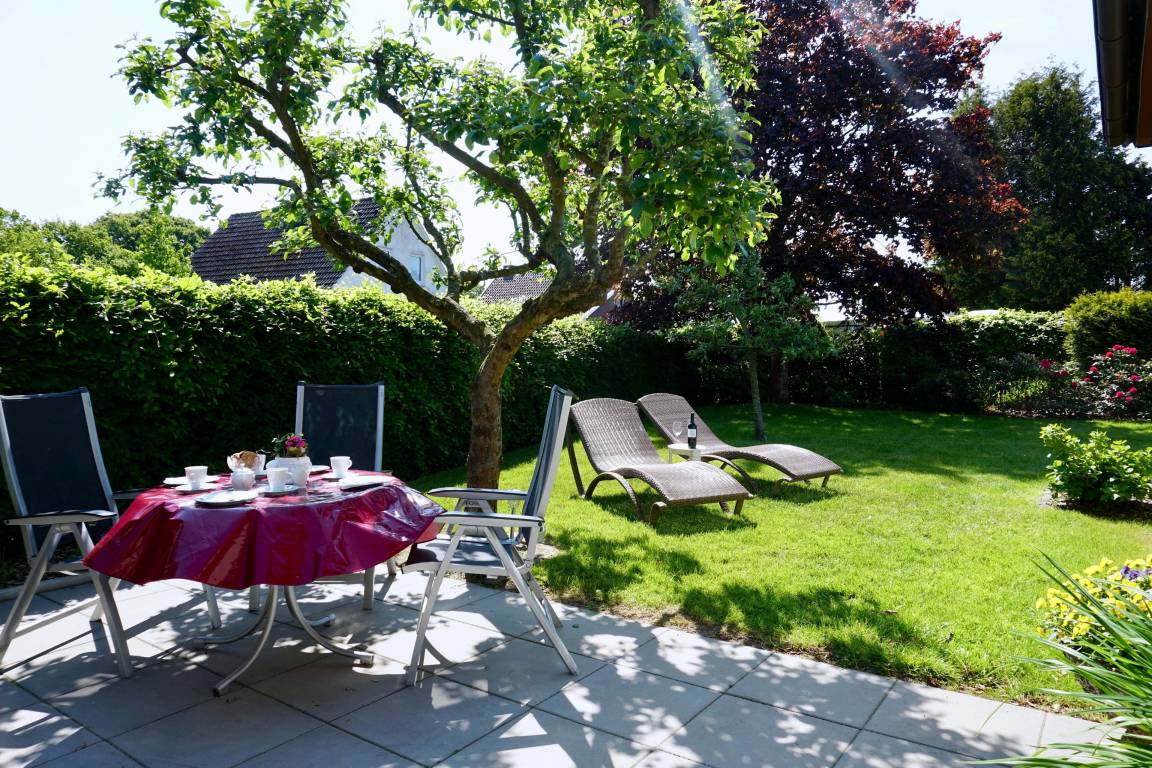 Die zentral gelegene und ebenerdige Ferienwohnung hat über die schöne Terrasse einen Zugang zum Garten. Nehmen Sie also Platz und genießen Sie den Ausblick ins Grüne. Der Garten ist zudem mit einer Sichtschutzhecke eingefasst, und der schöne Busch- und Baumbestand verspricht Entspannung pur.