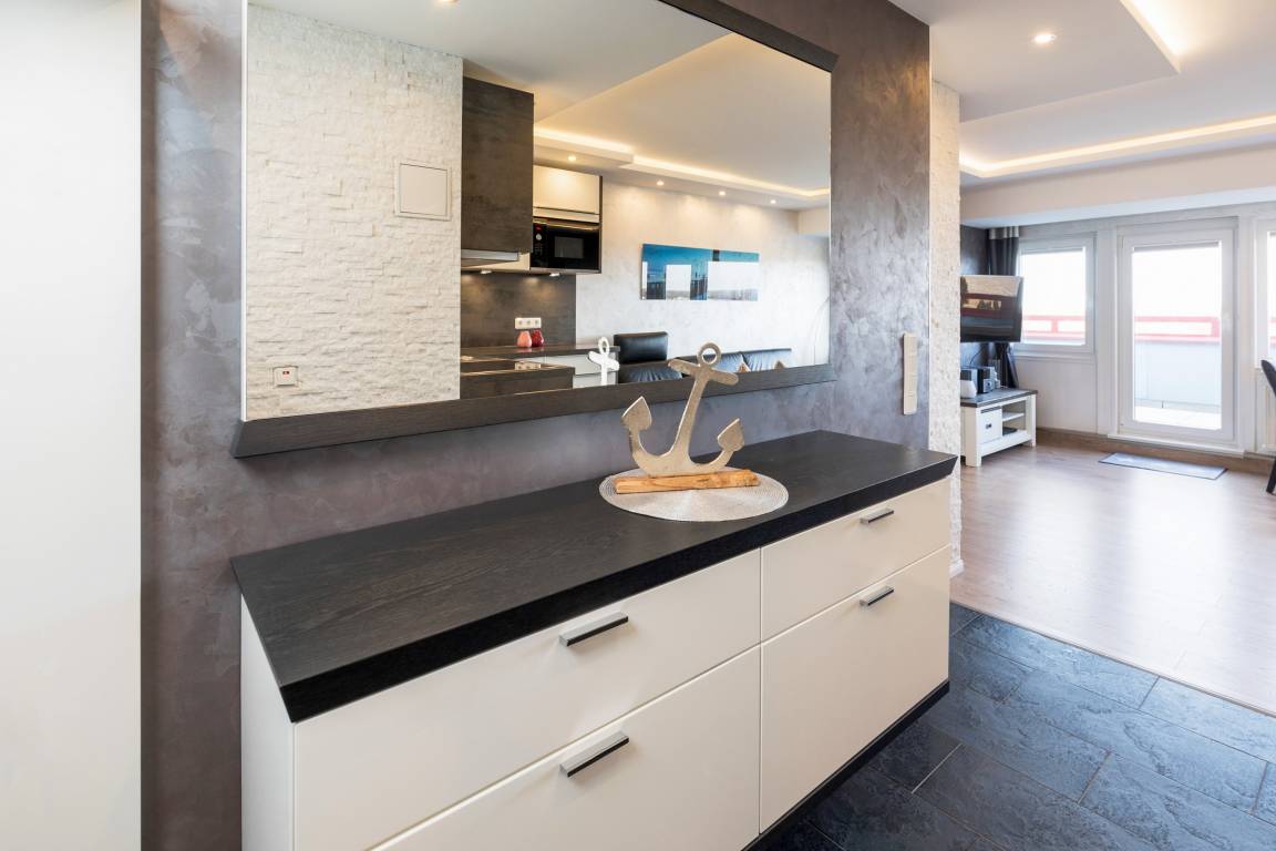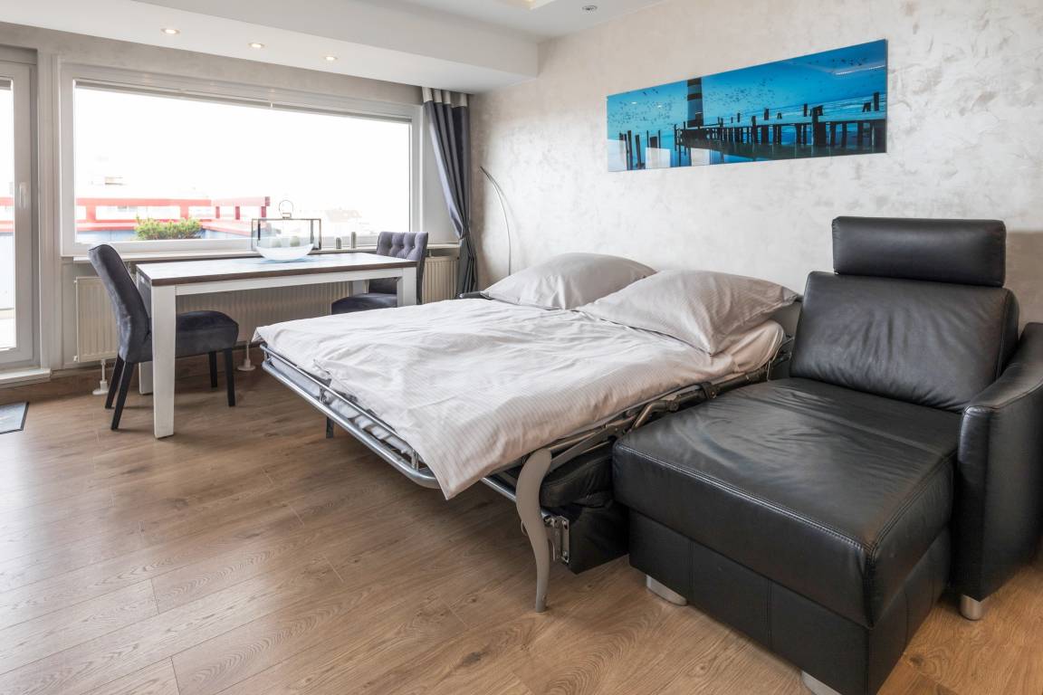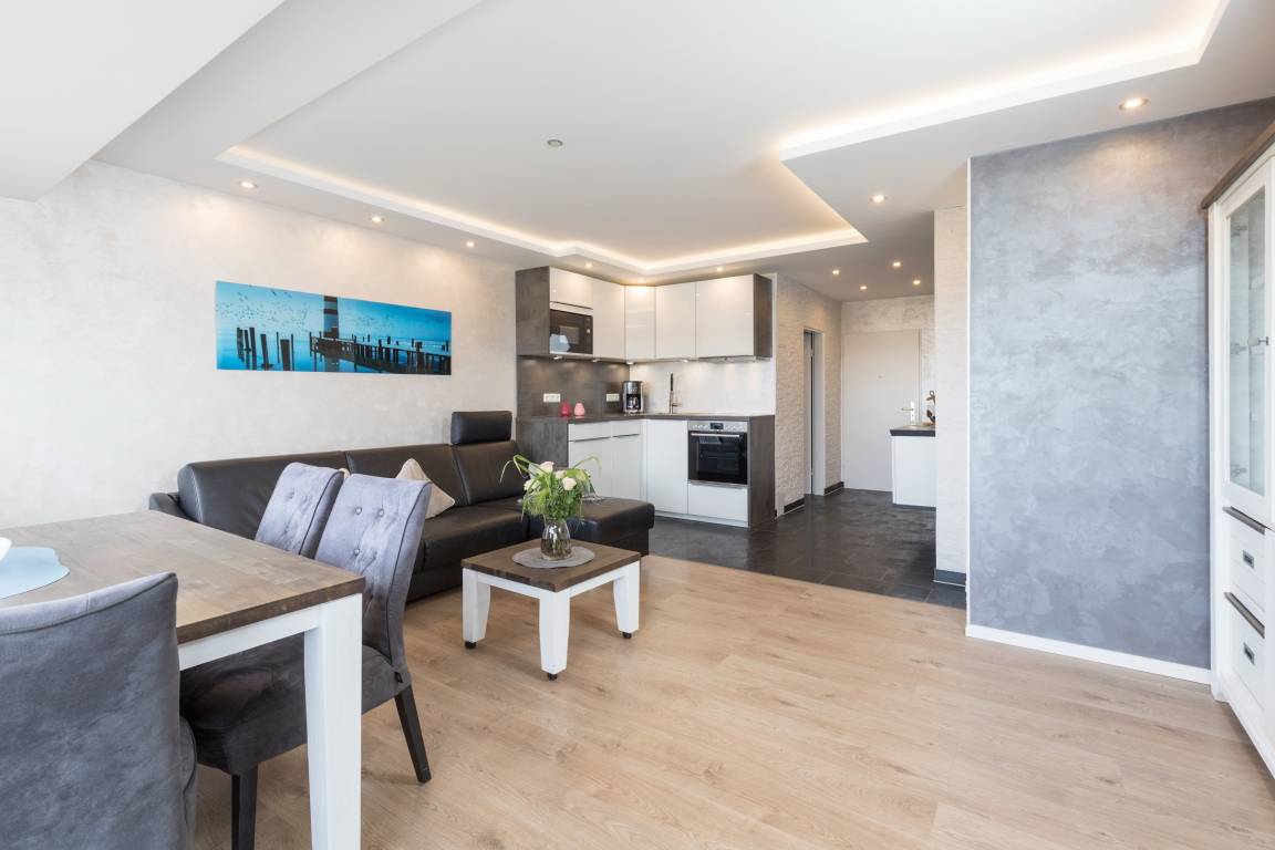 Das Apartment besteht aus einem Schlafzimmer mit 1 Doppelbett, einem Wohnbereich mit zusätzliche Schlafsofa für 2 Personen und einem Badezimmer mit Dusche sowie WC. Die Ferienwohnung beinhaltet eine voll ausgestattete offene Küche.