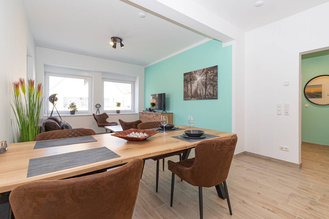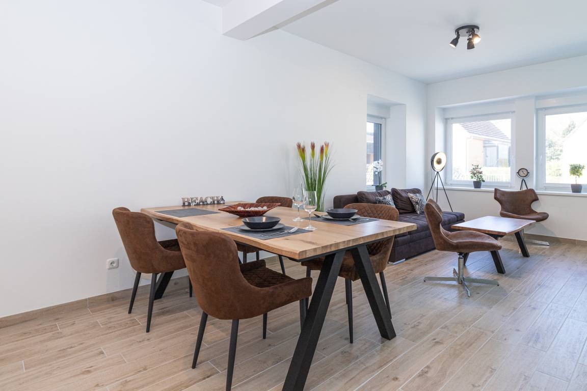 Sahlenburger Weg 17 für bis zu 4 Personen. Fußläufig zum Ortskern ist die barrierefreie, neu sanierte Wohnung ebenerdig gelegen. Sie wohnen in hellen Räumen in modernem Ambiente. Die voll ausgestattete Küche verfügt über Herd und Backofen, Kühlschrank mit Gefrierfach, Spülmaschine, Mikrowelle, Toaster, Wasserkocher und Kaffeemaschine. Das Badezimmer bietet Ihnen mit barrierefreier Dusche und Bidet allen notwendigen Komfort. Ein Schlafzimmer ist mit Doppelbett, das zweite Schlafzimmer mit einem Etagenbett funktional eingerichtet. Eine Waschmaschine finden Sie im Flur zum Fahrradraum, über den Sie auf die möblierte Terrasse gelangen. Wenn Gräser und Lavendel blühen ist es ein wohltuender Ort der Entspannung. Alle Fenster verfügen über Plissees, Rollläden und Fliegengitter. Auch können Sie einen kleinen Abstellraum, der von der Terrasse aus für Sie erreichbar ist, für Fahrrad oder Bollerwagen bzw. Kinderwagen nutzen. [nbsp]Die Fußbodenheizung bietet behagliche Wärme. WLAN ist kostenfrei. Erstbezug 2021.