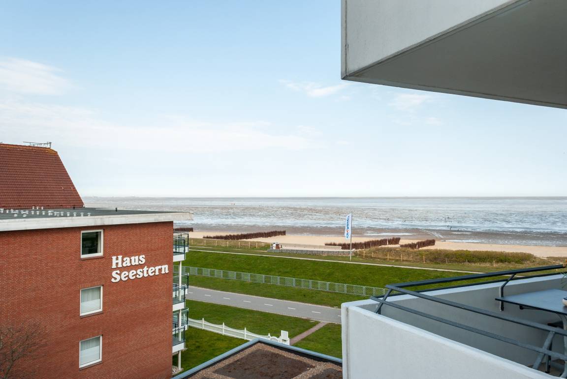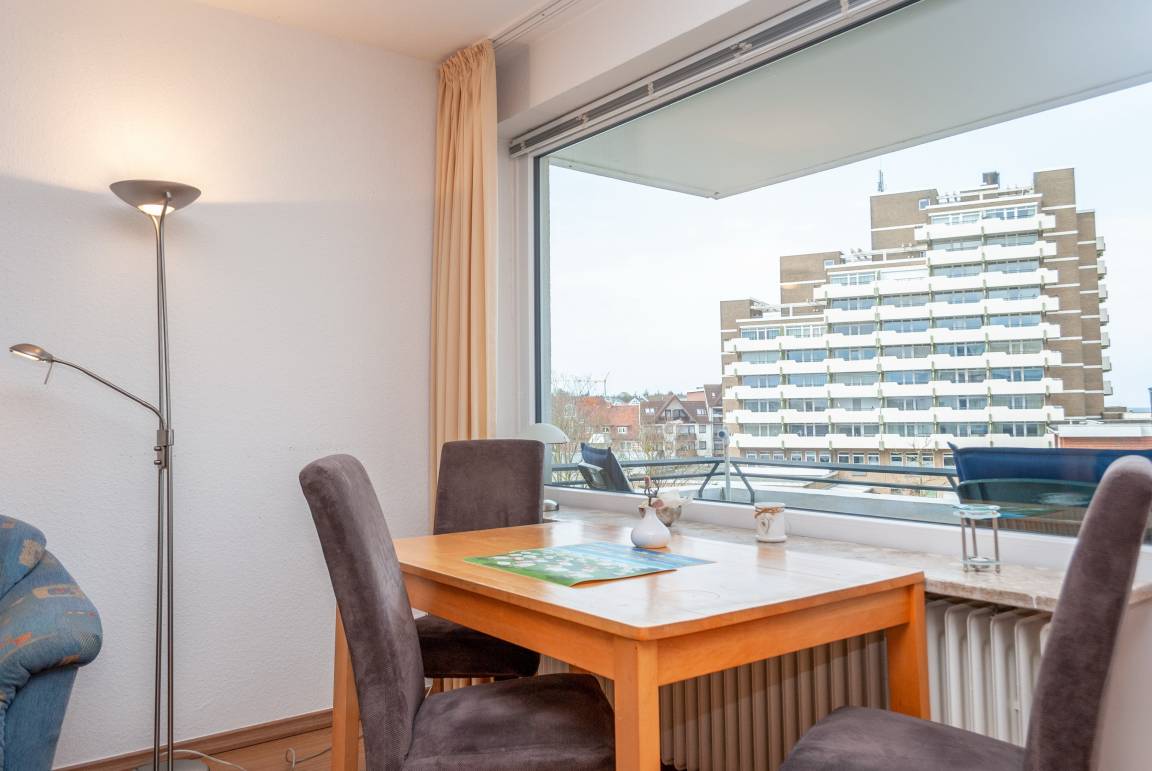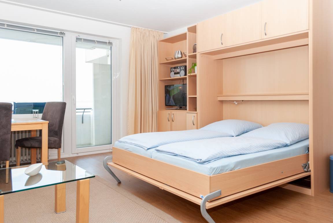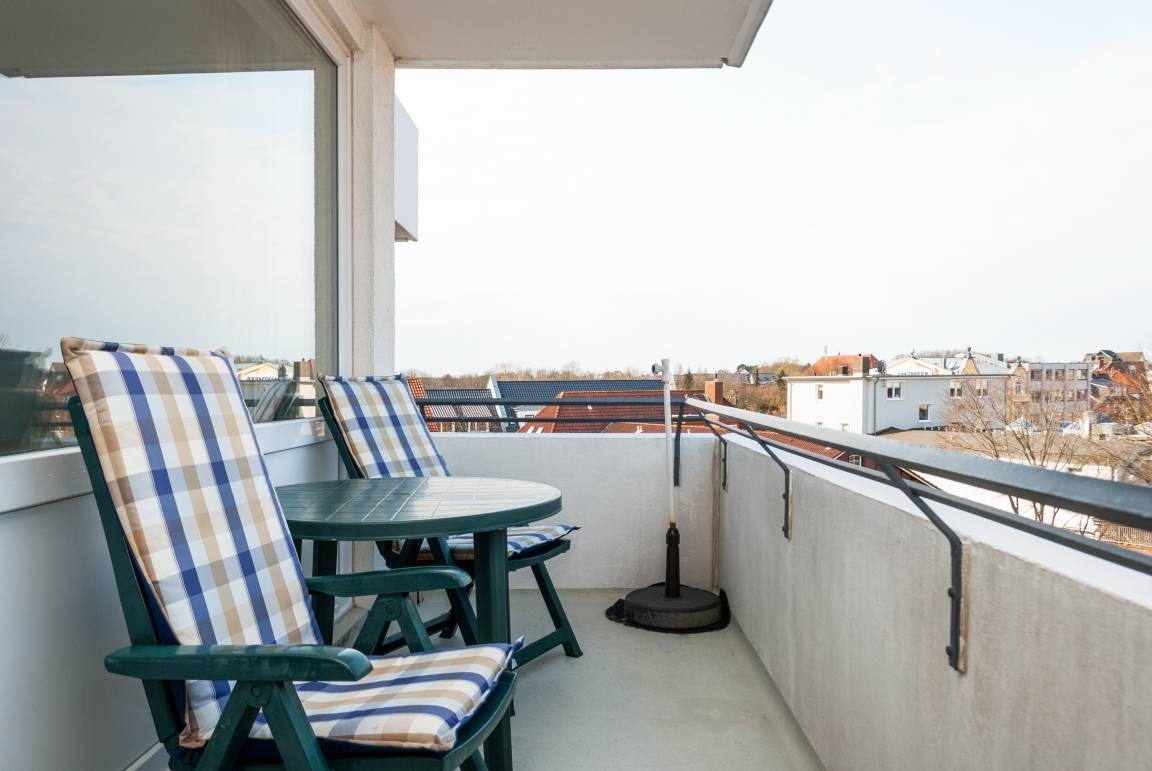 Das Apartment ist ein 1-Raum-Apartment im 4. Obergeschoss für bis zu 4 Personen mit 40 qm. Der Westbalkon mit Meerblick bietet Ihnen vormittags Schatten und nachmittags Sonne .