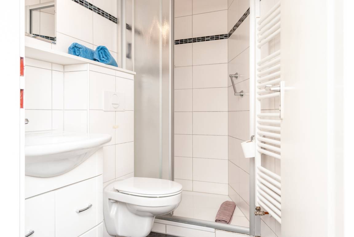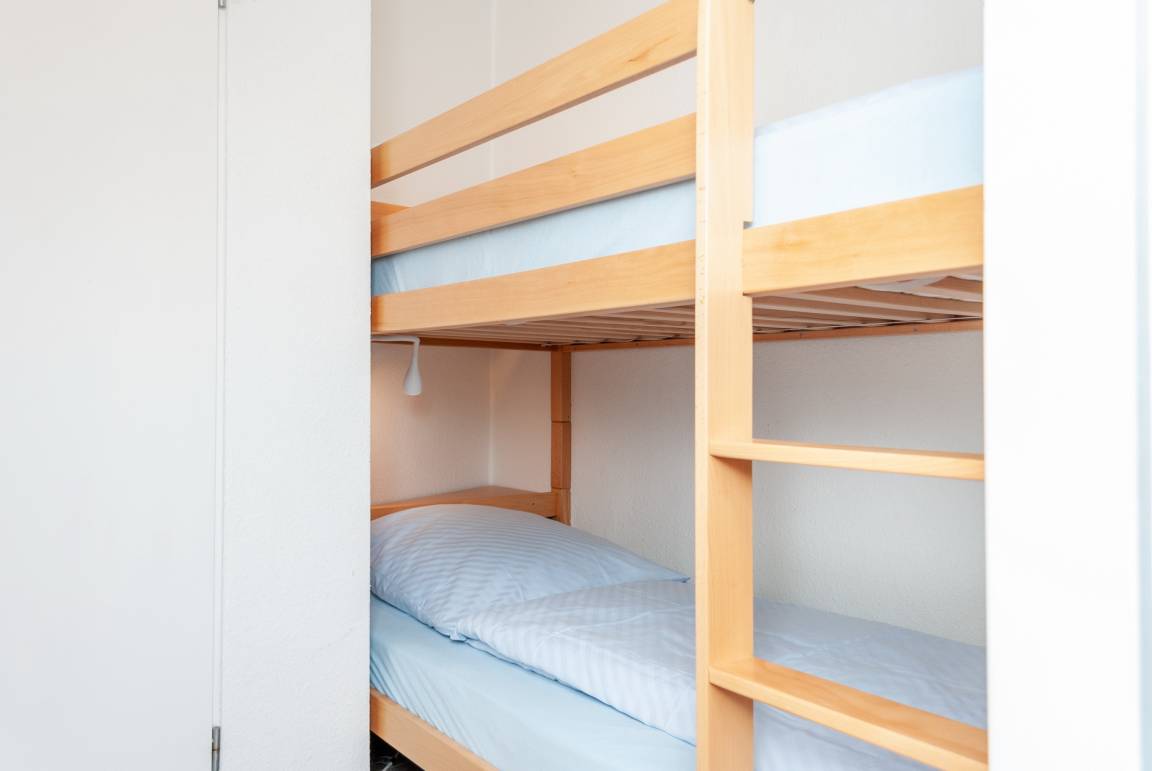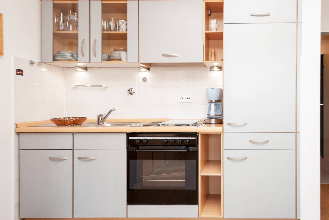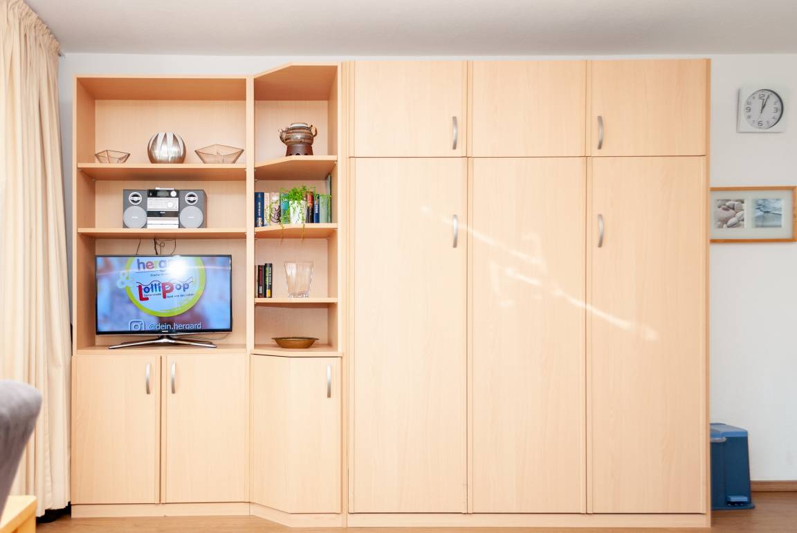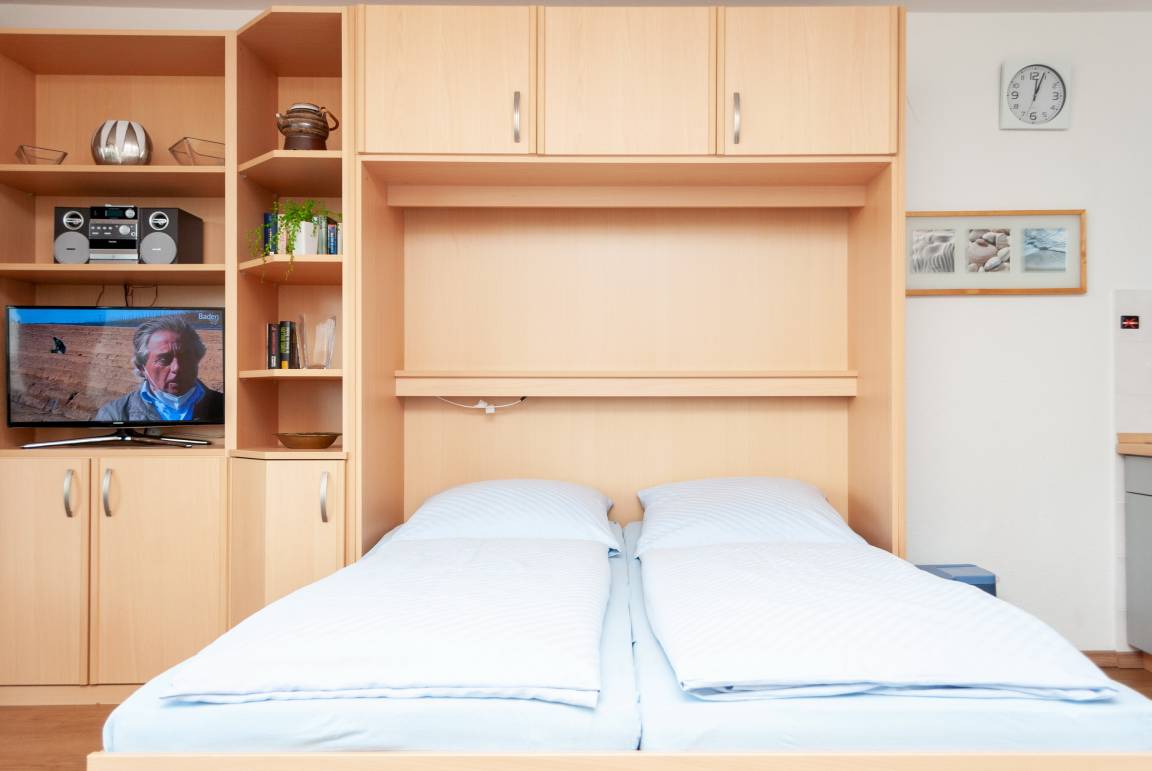 Das Apartment besteht aus einem Wohnbereich mit Schrankbett für 2 Personen ,aus einem zusätzlichem Etagenbett in einer Nische im Flur , und einem Badezimmer mit Dusche sowie WC. Die Ferienwohnung beinhaltet eine voll ausgestattete offene Küche.