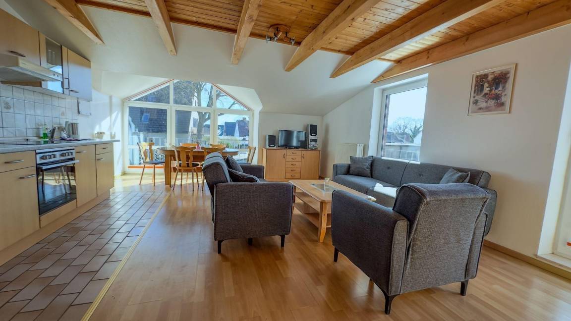 Die Ferienwohnung im Schillingshof in Cuxhaven bietet auf 65 m² Platz für bis zu fünf Personen und ist ideal für Familien und Gruppen. Sie erstreckt sich über zwei Etagen und umfasst zwei separate Schlafzimmer, darunter ein gemütlicher Schlafboden mit drei Betten. Die offene, voll ausgestattete Küche ermöglicht die Zubereitung eigener Mahlzeiten und ist mit einem Essbereich verbunden, der für gesellige Runden einlädt. Der helle Wohnbereich mit Sofaecke sorgt für Entspannung nach einem erlebnisreichen Tag. Das moderne Badezimmer verfügt sowohl über eine Dusche als auch eine Badewanne. WLAN ist in der gesamten Wohnung verfügbar. Zusätzlich stehen gemeinschaftlich nutzbare Einrichtungen wie ein Grillplatz und ein Spielplatz am Haus bereit. Haustiere sind willkommen, und für Autofahrer gibt es einen eigenen Parkplatz.