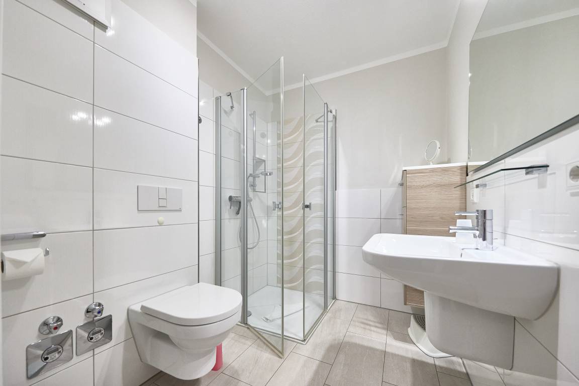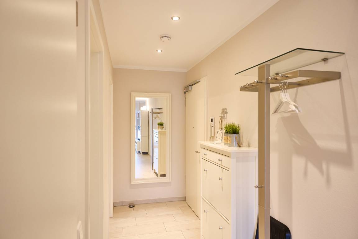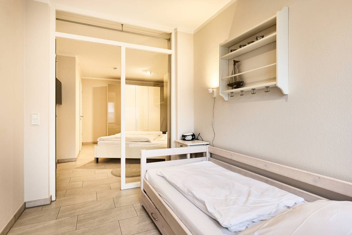 Die Ferienwohnung verfügt über einen lichtdurchfluteten Wohn- und Essbereich mit einer erstklassigen Küche, ein stilvolles Duschbad mit WC, ein erstklassiges Schlafzimmer mit Doppelbett (1,80 x 2,00m) und großem Kleiderschrank sowie ein angrenzendes Kinderzimmer mit einem komfortablen Sofa-Tandembett (Einzelbett mit Ausschubbett, 90x200cm, auch als Sofa nutzbar).