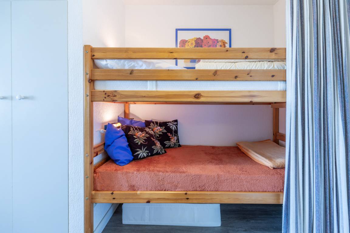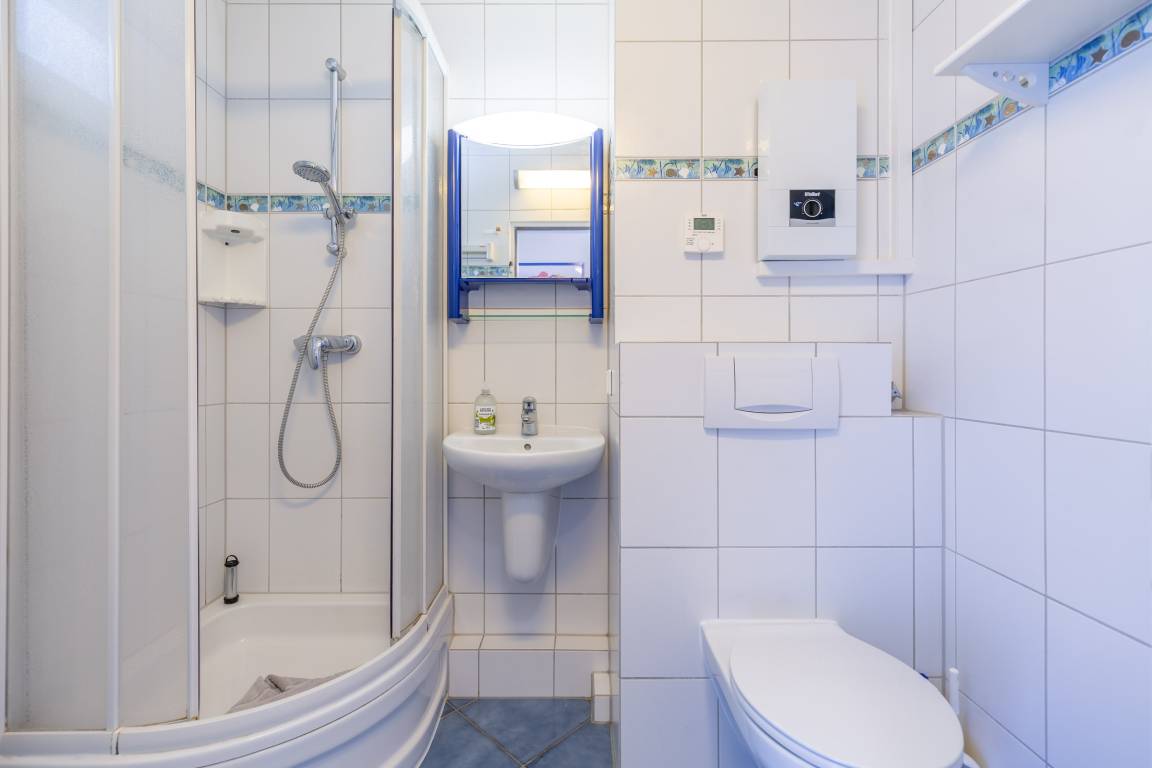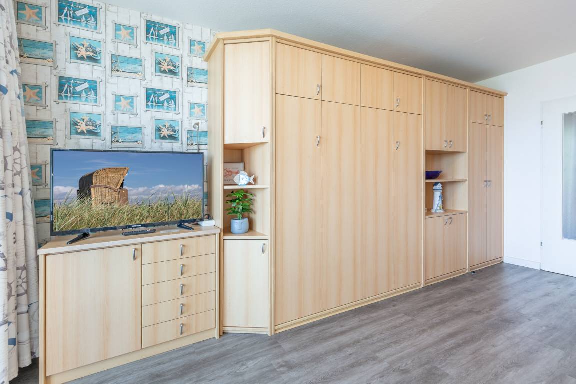 In der hellen Einraumwohnung lädt eine gemütliche Couchgarnitur mit Sessel zum Entspannen ein. Für Unterhaltung sorgen ein Flachbildfernseher sowie kostenloses WLAN. Die integrierte Küchenzeile ist mit einem 2-Platten-Cerankochfeld und einem Kühlschrank ausgestattet. Für die Nacht stehen Ihnen ein Schrankbett (2x80x200) im Wohnbereich sowie ein Etagenbett (90x200) im abgetrennten Vorraum zur Verfügung. So finden auch kleine Familien oder Getrenntschlafende ein passendes Plätzchen. Vorhänge sorgen dafür, dass Sie nicht von der Morgensonne geweckt werden. Das Badezimmer mit Dusche und WC verfügt über ein Fenster zum Belüften.