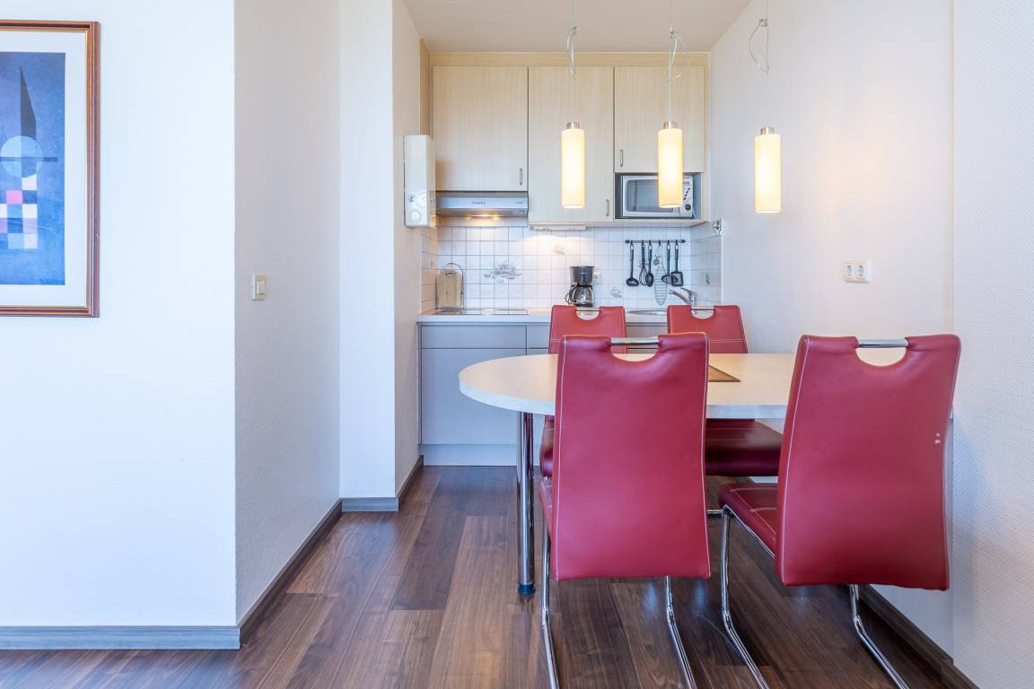 Der lichtdurchflutete Wohnbereich bietet ein komfortables Sofa und zwei Sessel zum Relaxen. Flachbild-TV und kostenloses WLAN sorgen für beste Unterhaltung. Die angrenzende Küchenzeile mit Esstisch bietet ausreichend Platz für bis zu vier Personen. Nach einem erlebnisreichen Strandtag können Sie den Abend ganz entspannt mit Blick auf den Sonnenuntergang ausklingen lassen. Ein separates Schlafzimmer mit Doppelbett und ein weiteres Schlafzimmer mit Etagenbett sorgen für einen erholsamen Schlaf.
