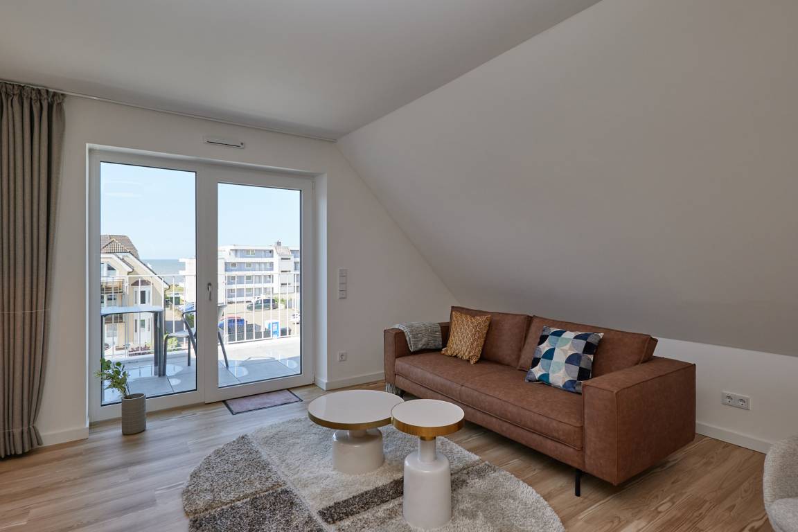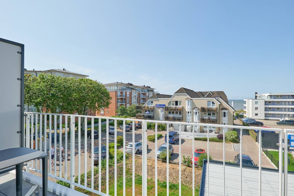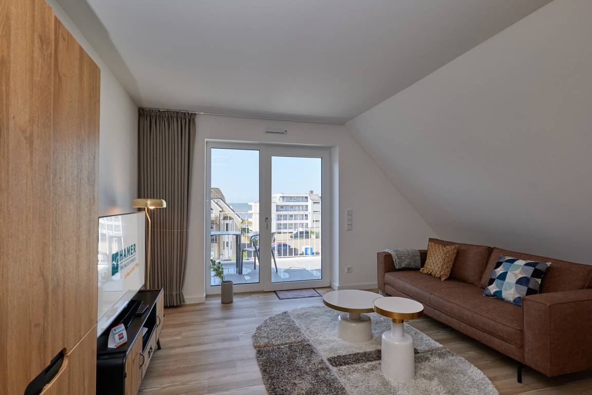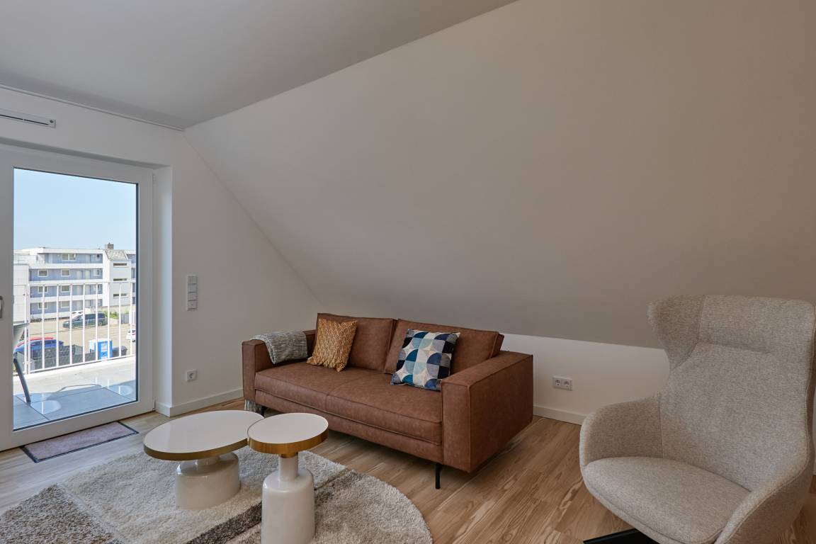 Neubau Mai 2023! Sehr schöne, moderne 2-Raum-Wohnung bis 2 Pers. voll ausgestattet auf ca. 49 m² in der 3.Etage gelegen, 1 Schlafzimmer mit komfortablen Doppelbett (Bettwäsche inkl.) und Außenjalousien an allen Fenstern (Veluxfenster mit Rollo innen), ebenerdige Dusche/WC, Wohnzimmer mit Küchenzeile (2 Platten, Mikrowelle/Backkombi, Geschirrspüler) 2x Kabel-TV, Radio, kostenfreies W-LAN-Internet, großer Balkon mit Teilseesicht (nord/west), beide Zimmer mit Dachschrägen, Personenaufzug, die Wohnung ist barrierefrei erreichbar, reservierter Pkw-Stellplatz in der Tiefgarage inkl., es sind keine Haustiere erlaubt und natürlich Nichtraucher. Durchfahrtshöhe Tiefgarage: 2,05m.