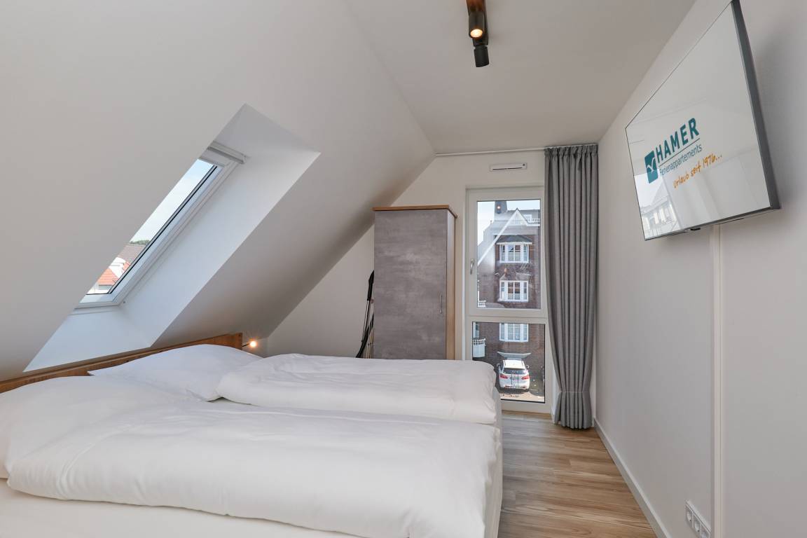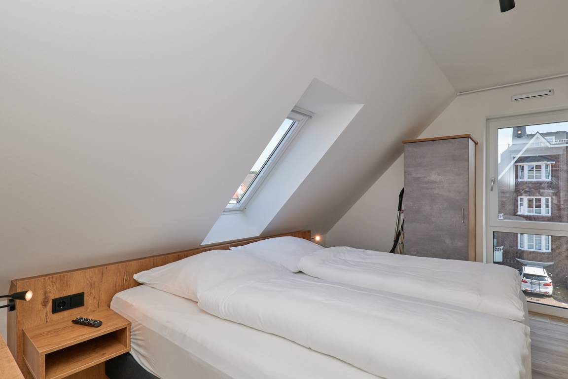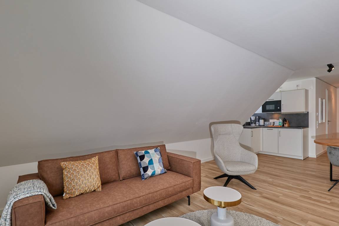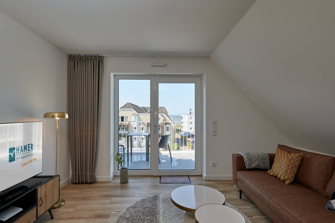 Neubau Mai 2023! Sehr schöne, moderne 2-Raum-Wohnung bis 2 Pers. voll ausgestattet auf ca. 49 m² in der 3.Etage gelegen, 1 Schlafzimmer mit komfortablen Doppelbett (Bettwäsche inkl.) und Außenjalousien an allen Fenstern (Veluxfenster mit Rollo innen), ebenerdige Dusche/WC, Wohnzimmer mit Küchenzeile (2 Platten, Mikrowelle/Backkombi, Geschirrspüler) 2x Kabel-TV, Radio, kostenfreies W-LAN-Internet, großer Balkon mit Teilseesicht (nord/west), beide Zimmer mit Dachschrägen, Personenaufzug, die Wohnung ist barrierefrei erreichbar, reservierter Pkw-Stellplatz in der Tiefgarage inkl., es sind keine Haustiere erlaubt und natürlich Nichtraucher. Durchfahrtshöhe Tiefgarage: 2,05m.