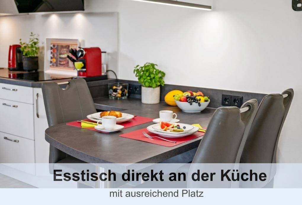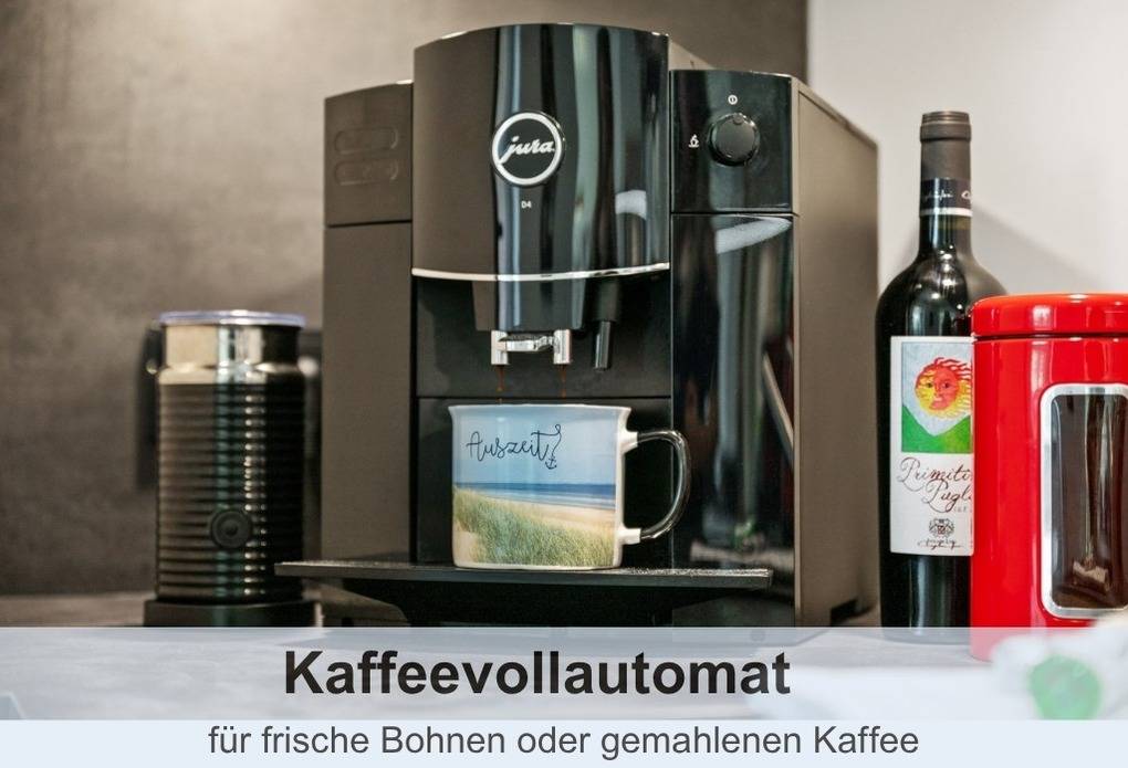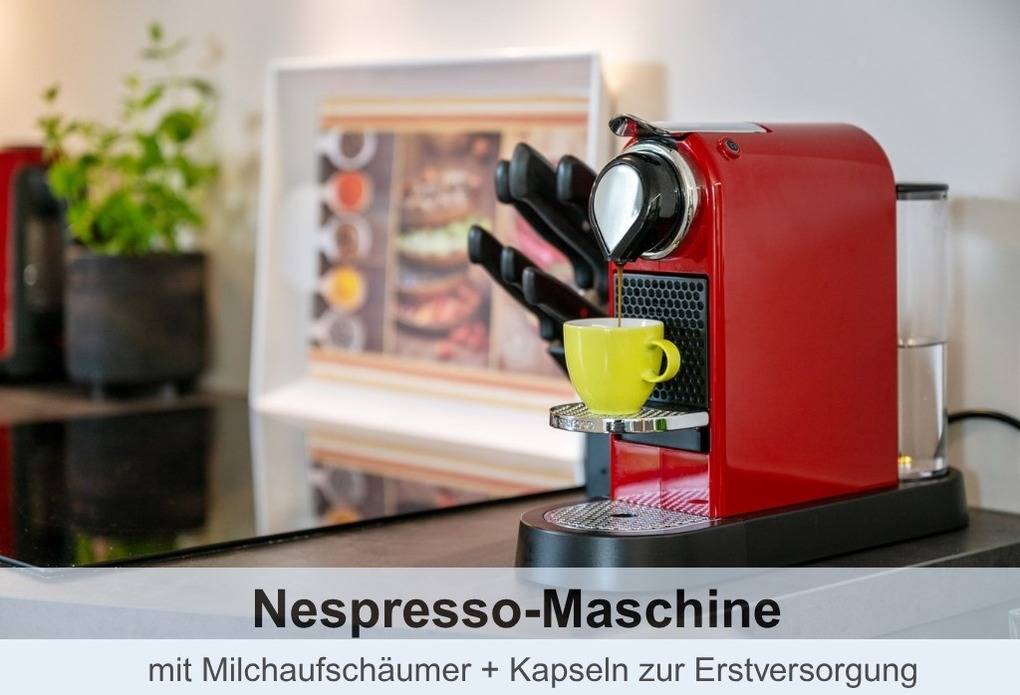 Die vollausgestattete Küche mit 4-Platten-Induktionsherd, Tiefkühlschrank, Spülmaschine, Jura-Kaffeevollautomat, Nespresso-Maschine (und vieles mehr), hochwertigem Geschirr und allen Küchenutensilien lässt keine Wünsche offen. Bei Besuch eignet sich der große Balkontisch für ein gemütliches Beisammensein.