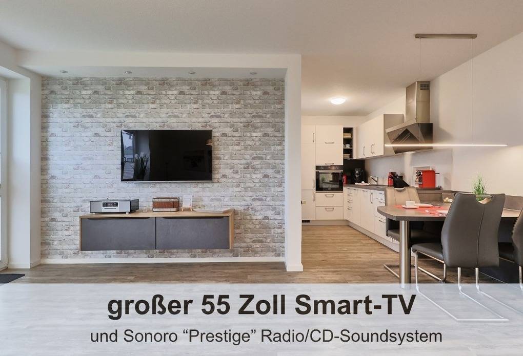Im behaglichen Wohnbereich erwartet Sie ein großes Ledersofa, das sich auch als komfortabler Ausweich-Schlafplatz für eine erwachsene Person eignet. Für entspannte Stunden stehen Ihnen ein 55-Zoll-Smart-TV mit Kabelanschluss sowie das hochwertige Sonoro „Prestige" Soundsystem mit DAB+, CD, Bluetooth und Internetradio zur Verfügung – Musikgenuss in Bestform.