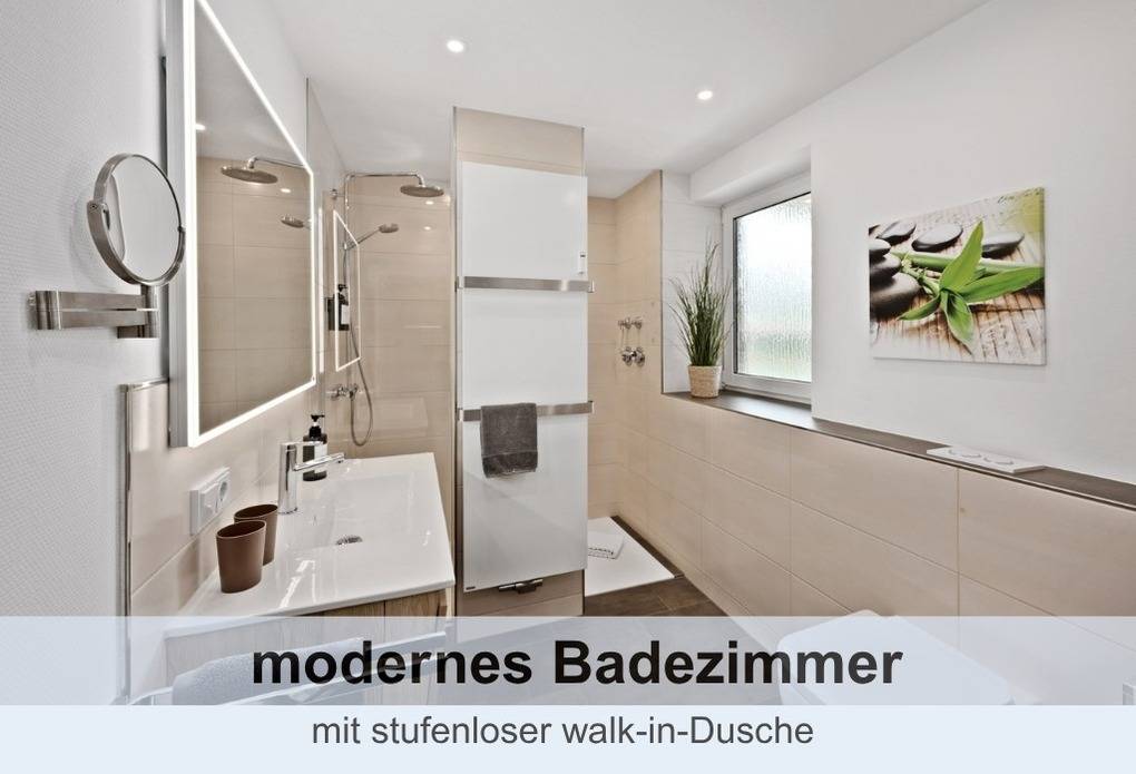 Das großzügige Badezimmer verwöhnt Sie mit einer ebenerdigen Walk-in-Dusche, einem großen Waschbecken mit beleuchtetem Spiegel, Tageslichtfenster und stilvollen Details. Die Glasabtrennung, durchdachte Ablagen und stimmungsvolle Beleuchtung sorgen für echtes Spa-Feeling.