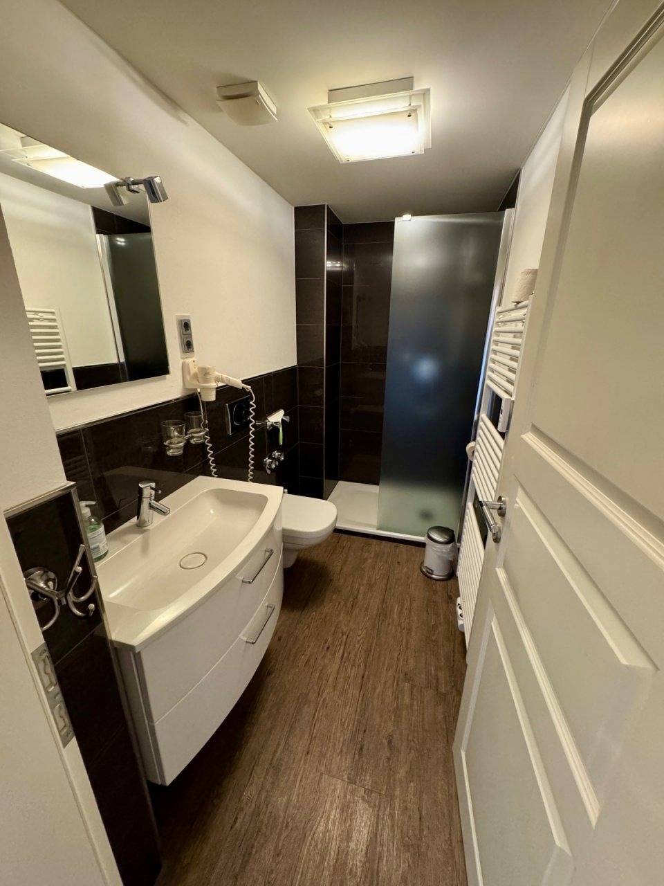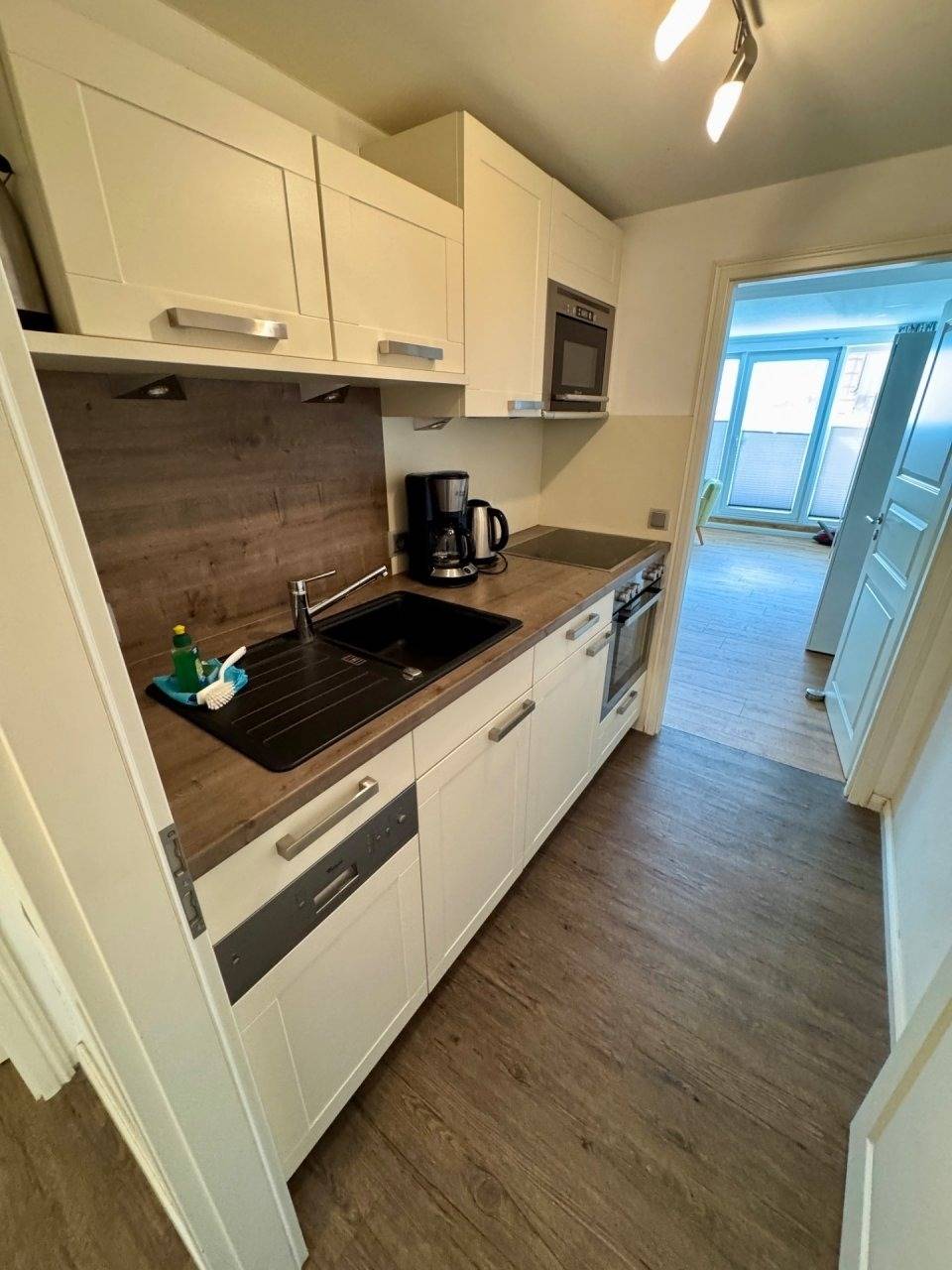 Von der separaten Küche, die mit einem Kühlschrank, einem Backofen mit Ceranfeld, einem Geschirrspüler, einer Mikrowelle sowie einer Kaffeemaschine, einem Toaster und einem Wasserkocher ausgestattet ist, gelangen Sie sowohl zum modernen Duschbad als auch in den Wohnbereich.